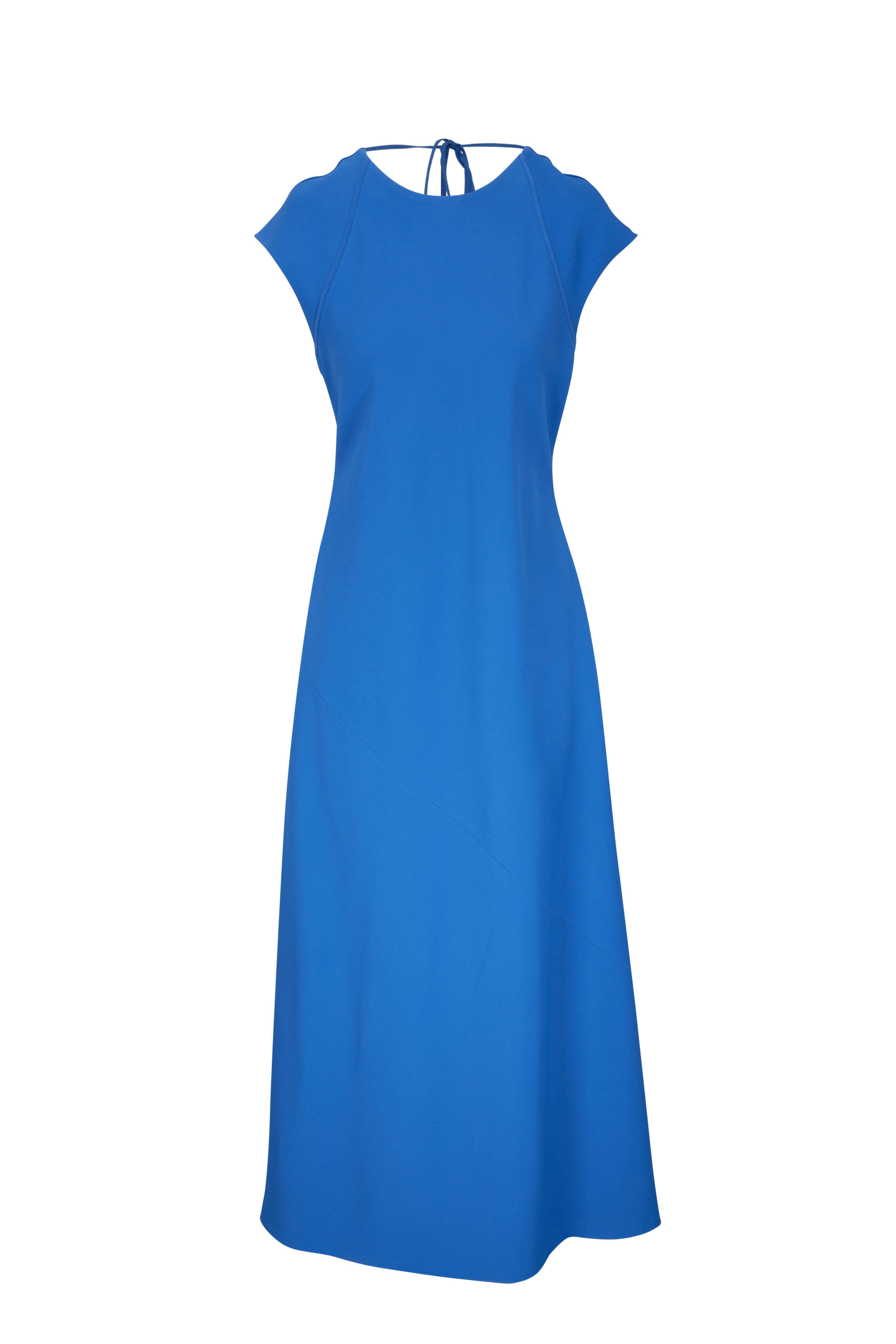 Jewel neckline. Concealed back zip. Open v-back; silk self-tie with gold-toned logo tips. Raglan cap sleeves; silk piped detailing. Made in Italy. A-line silhouette. 56" shoulder to hem. 97% viscose, 3% elastane. Dry clean.
