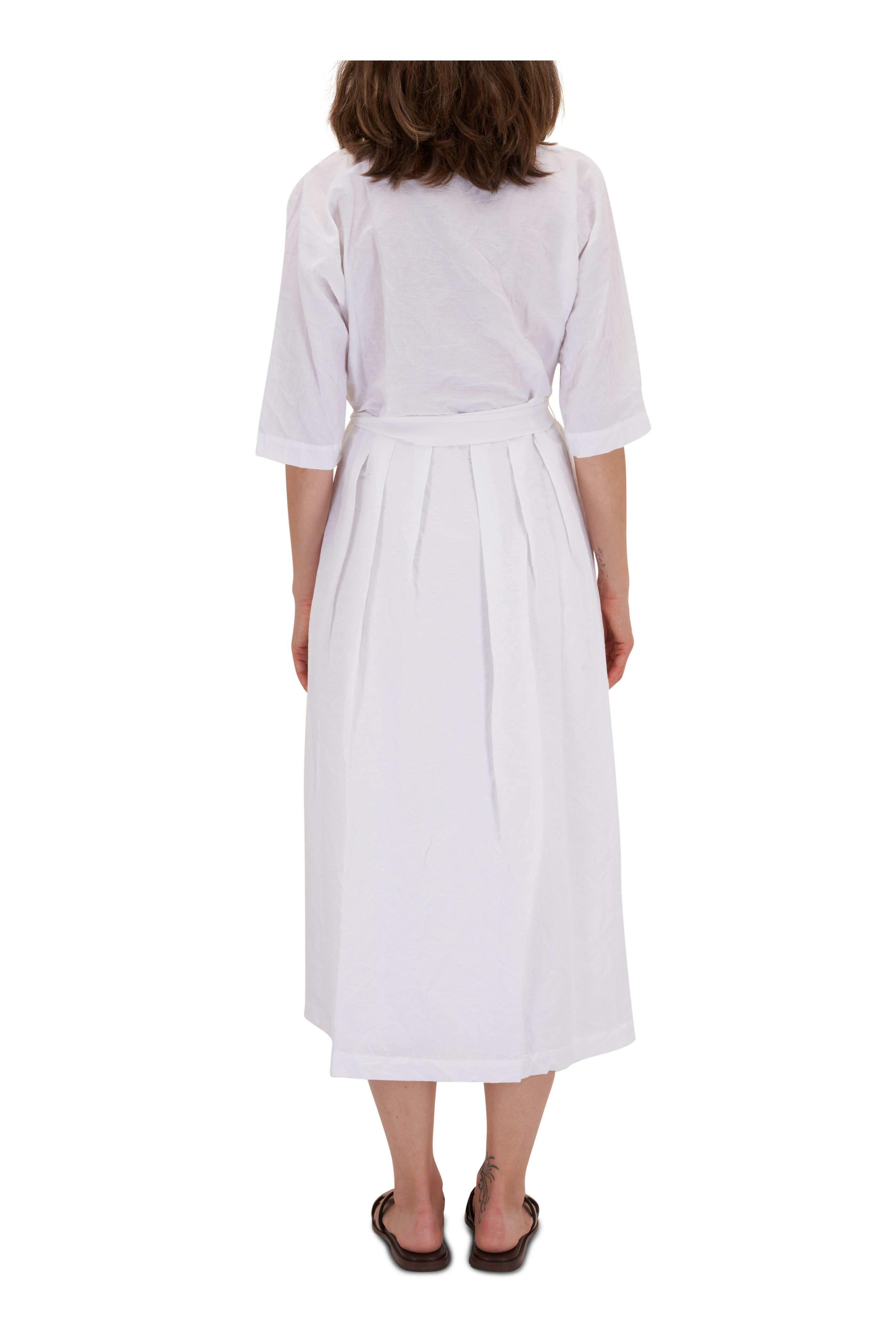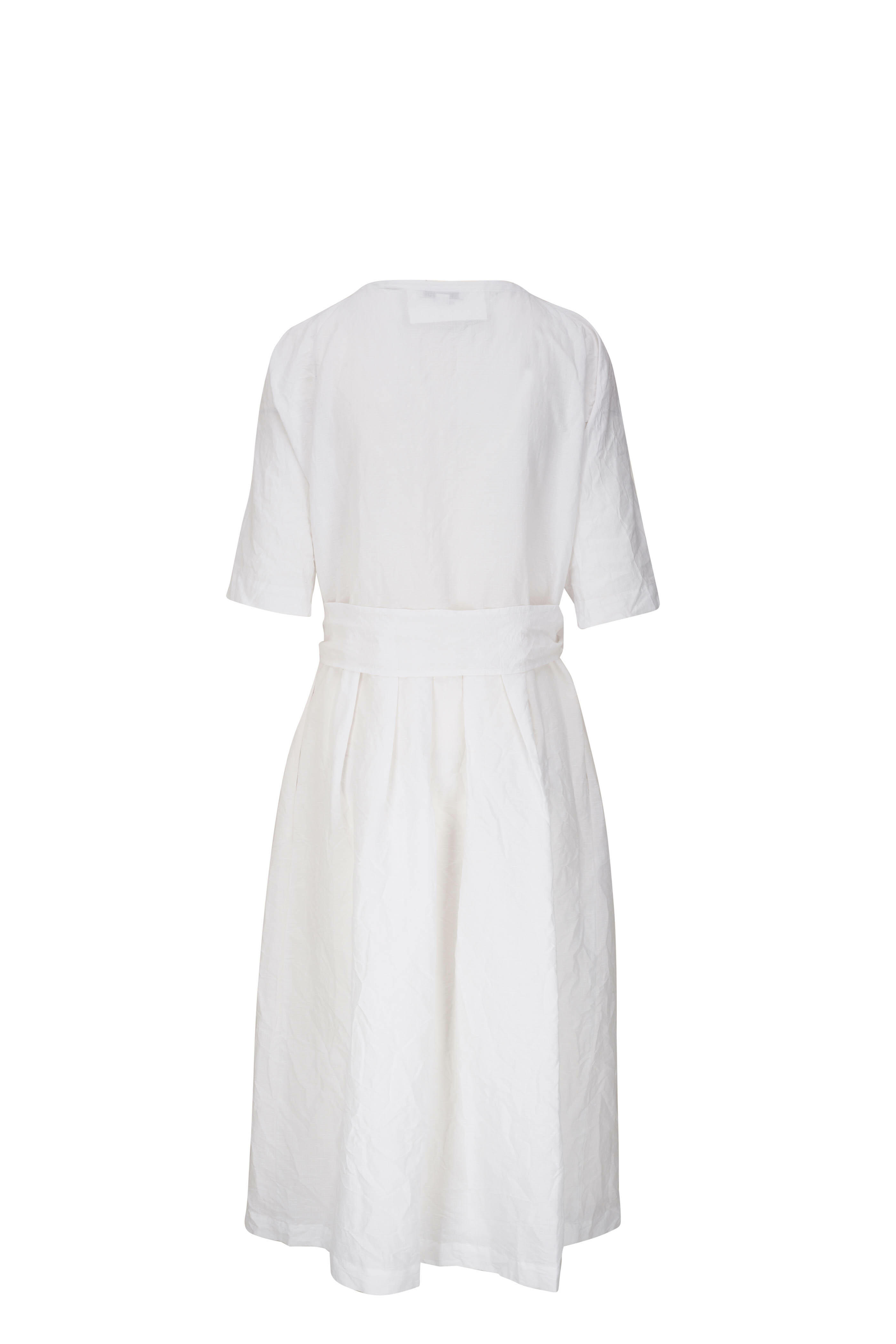 Boat neckline. Slip-on style. Single button at collar. Self-tie waist. Elbow length sleeves. Straight hem. Imported. Color: Optic White. Approx. 47" shoulder to hem. 68% linen, 32% cotton; Lining: 100% polyester. Machine wash.