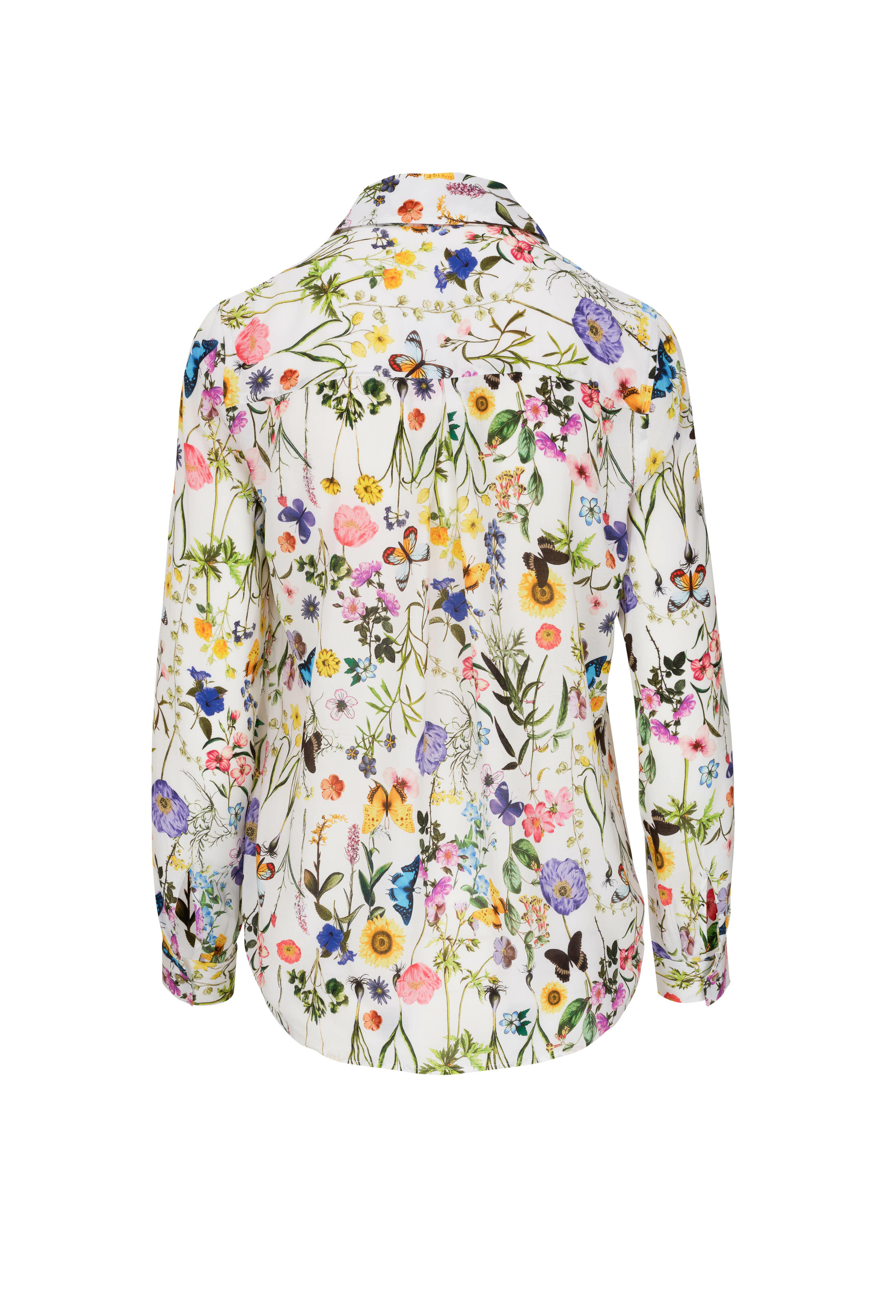 Spread collar. Front button placket. Long sleeves with button cuffs. Rounded hem. Imported. Relaxed fit. 100% viscose. Dry clean.