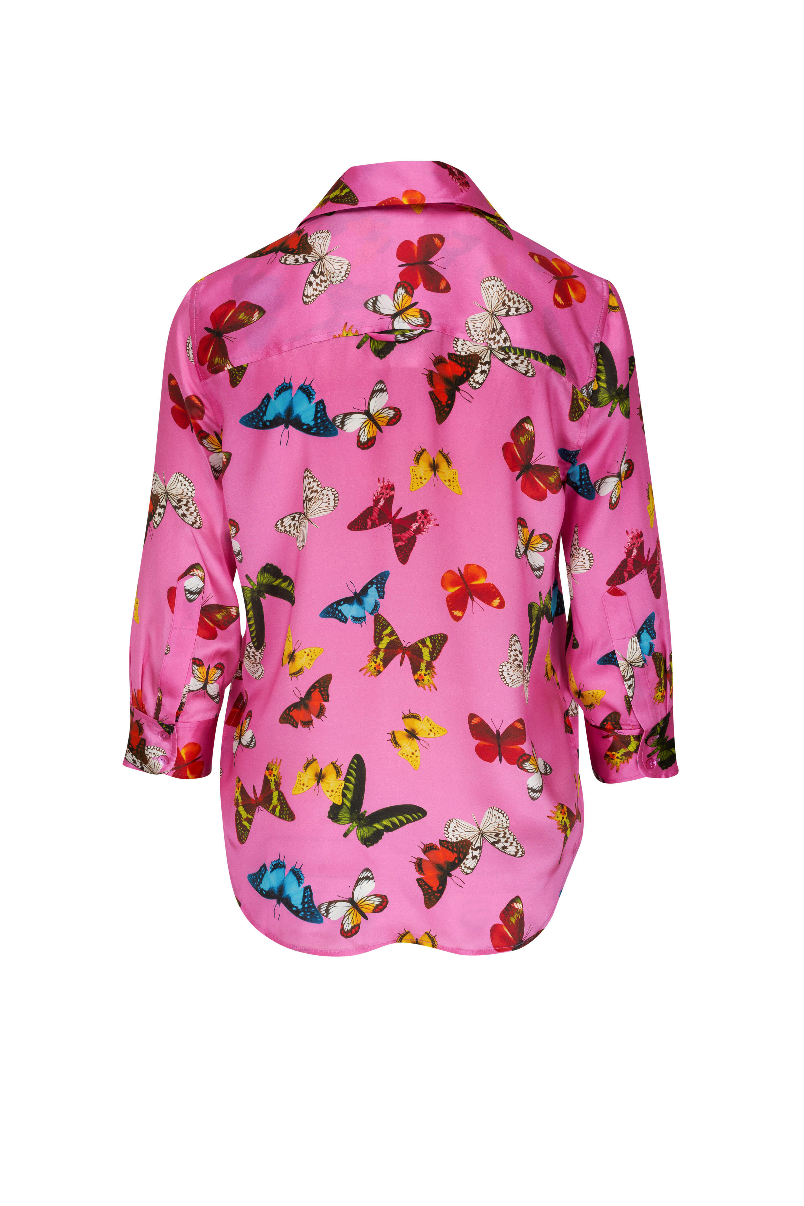 Spread collar. Front button placket. Three-quarter length sleeves. Rounded hem. Imported. 100% silk. Machine wash.
