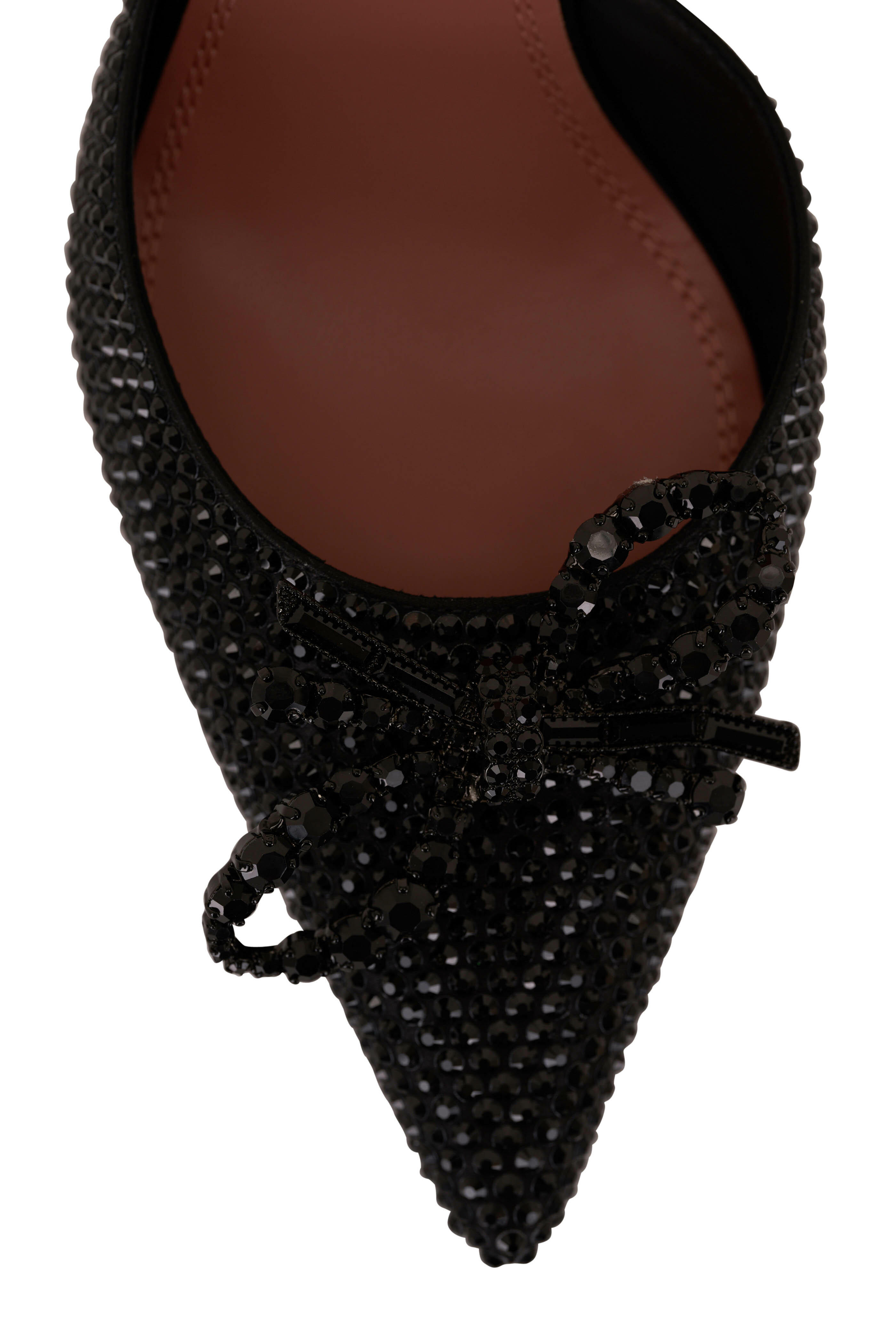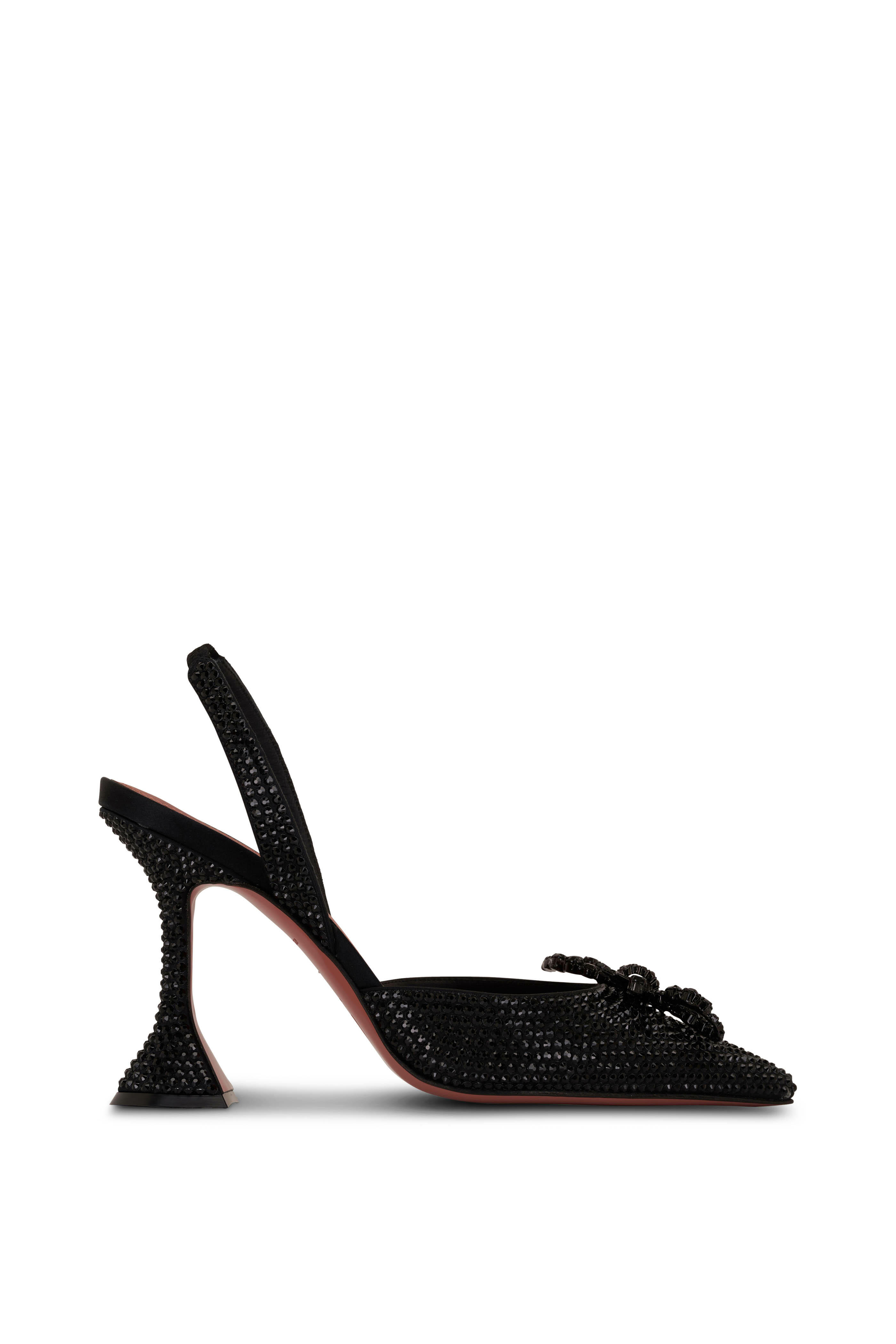 Satin and crystal upper. Pointed toe; crystal embellished bow. Elasticized slingback strap. Self-covered, signature martini glass heel. Leather lining and insole. Leather and rubber sole. Made in Italy. Heel height: 95mm (3 ¾").