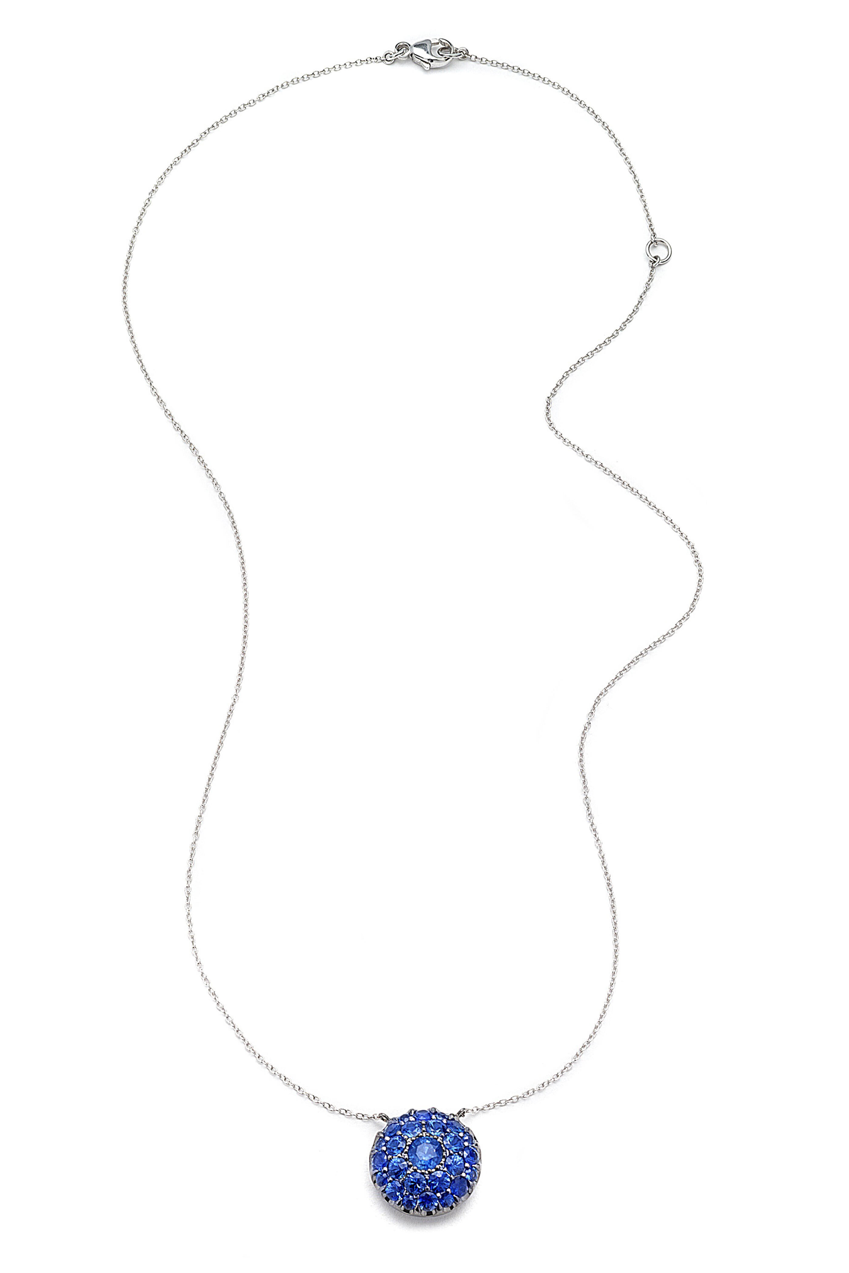 18k white gold. .08 carat rose cut diamonds. 3.062 carat blue sapphires. 16-18" chain length.
