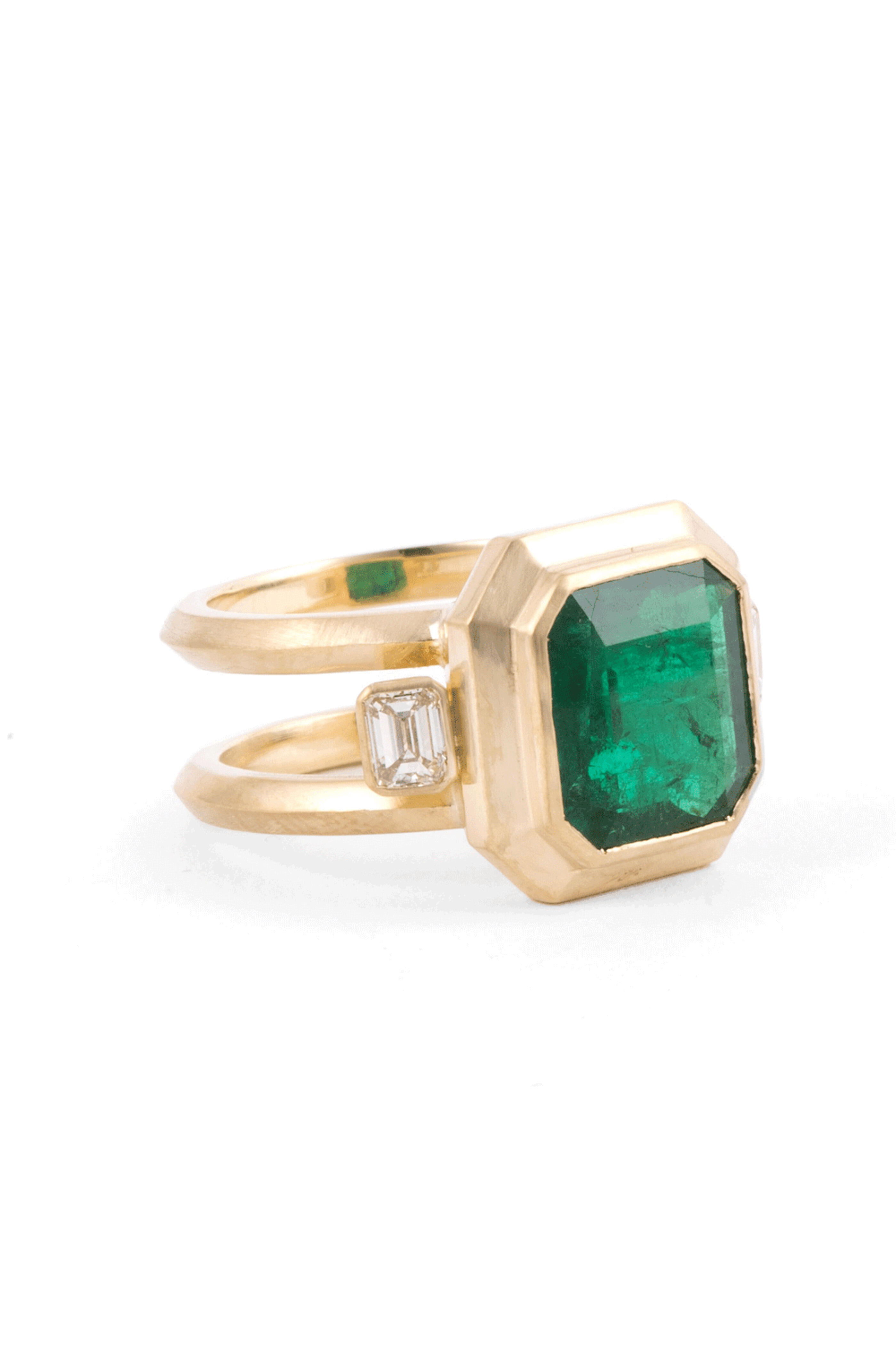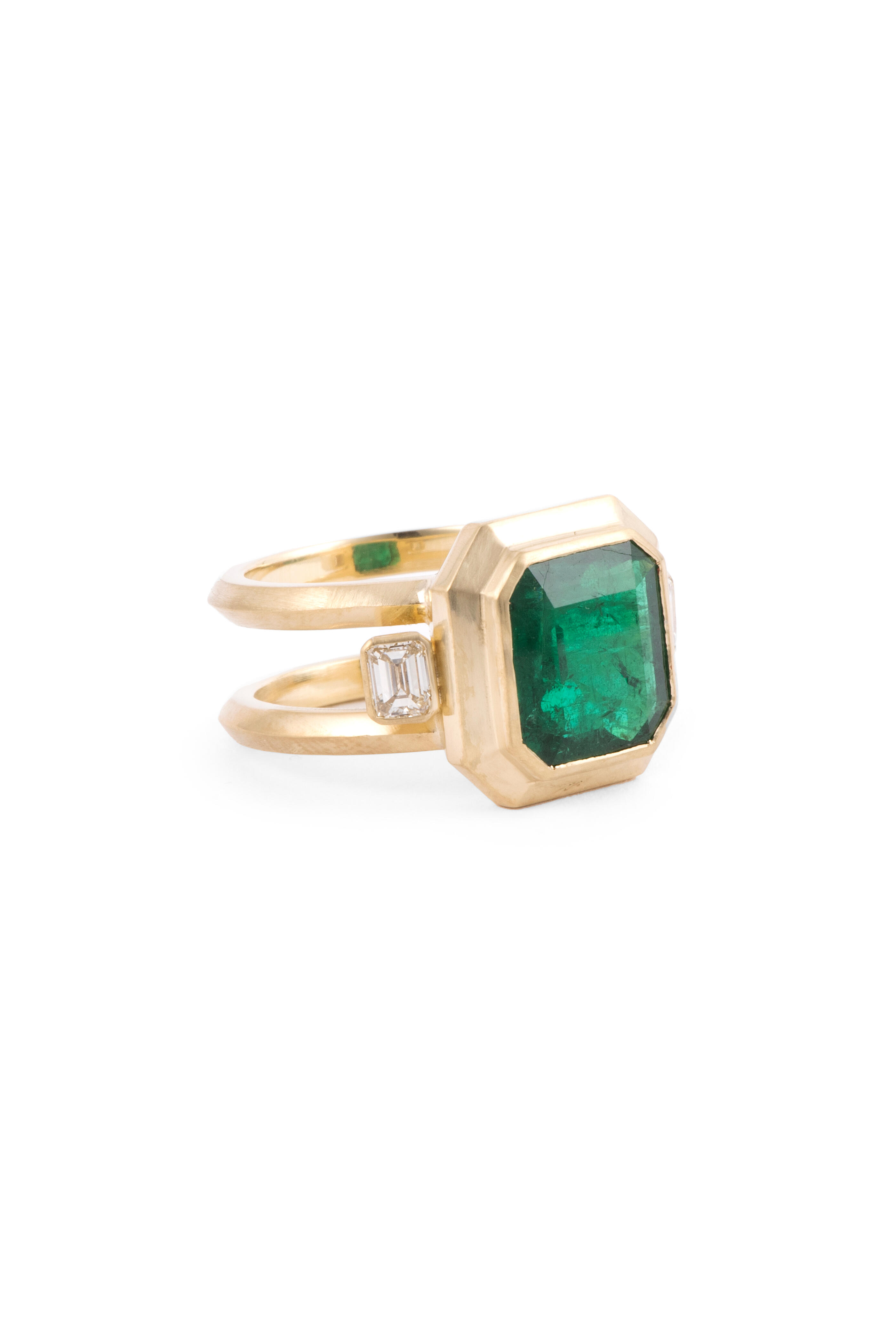 18k yellow gold. .58 carat diamond. 4.76 carat emerald.