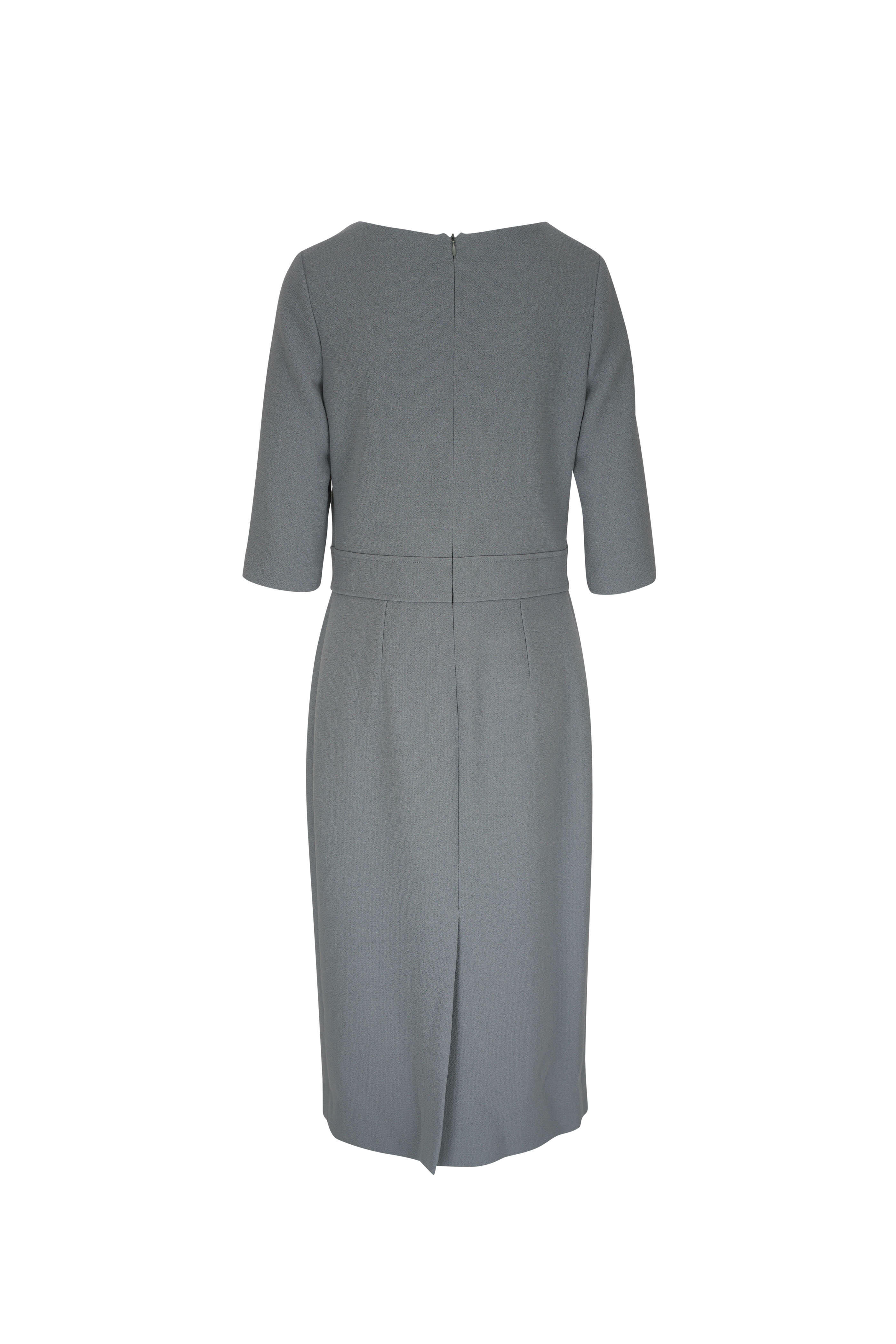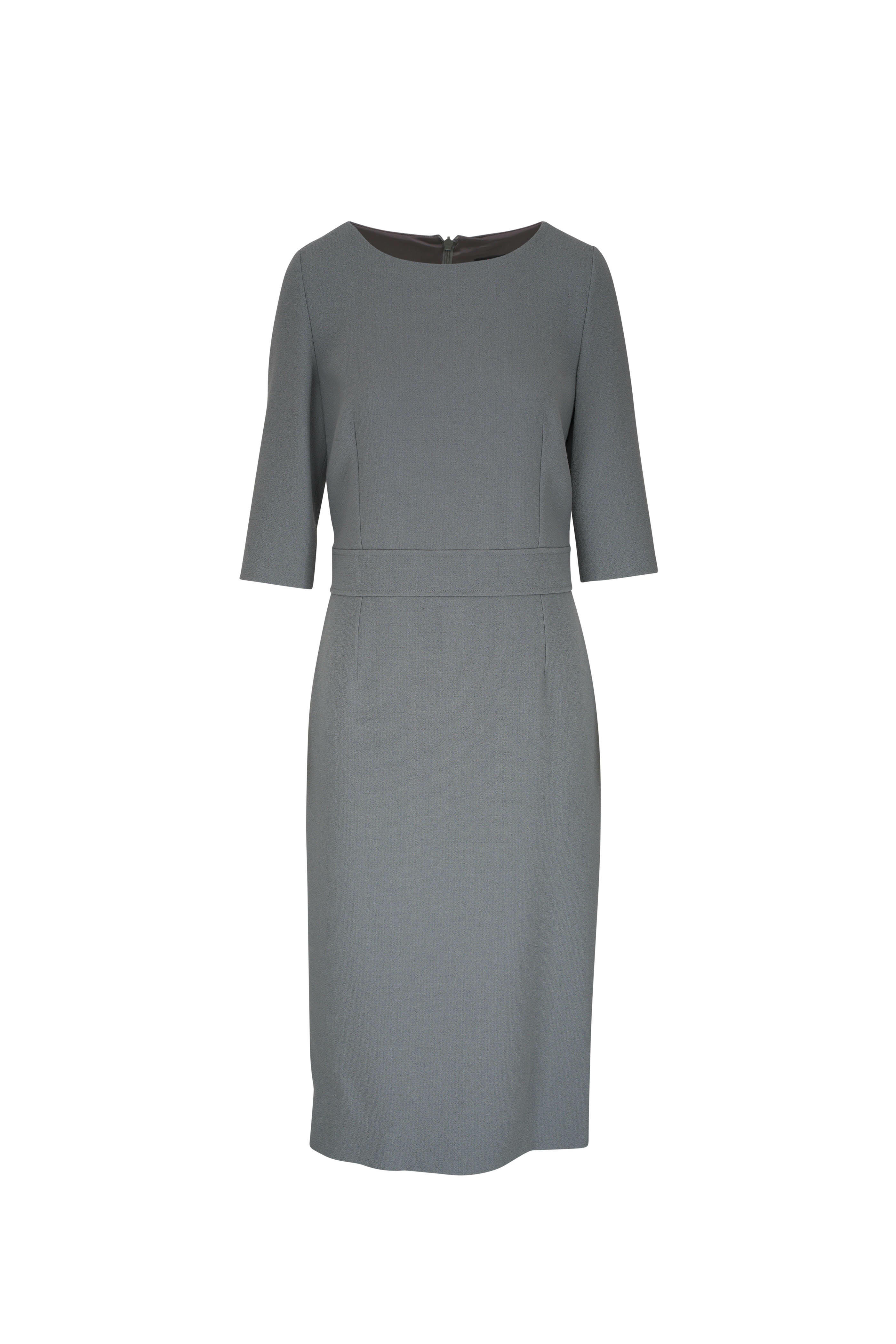 Round neckline. Concealed back zip. Elbow length sleeves. Made in Italy. 47" shoulder to hem. 100% wool; lined body. Dry clean.