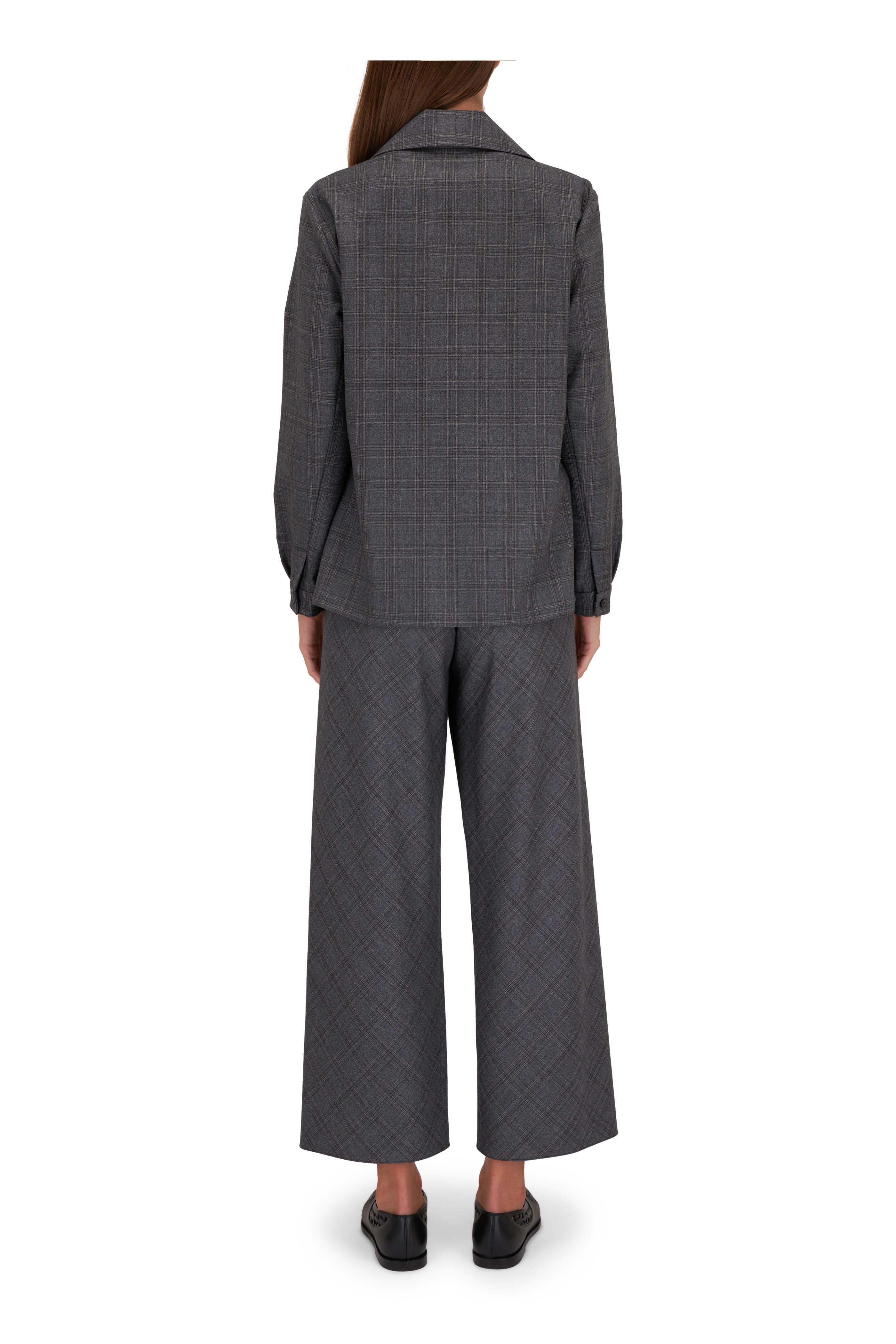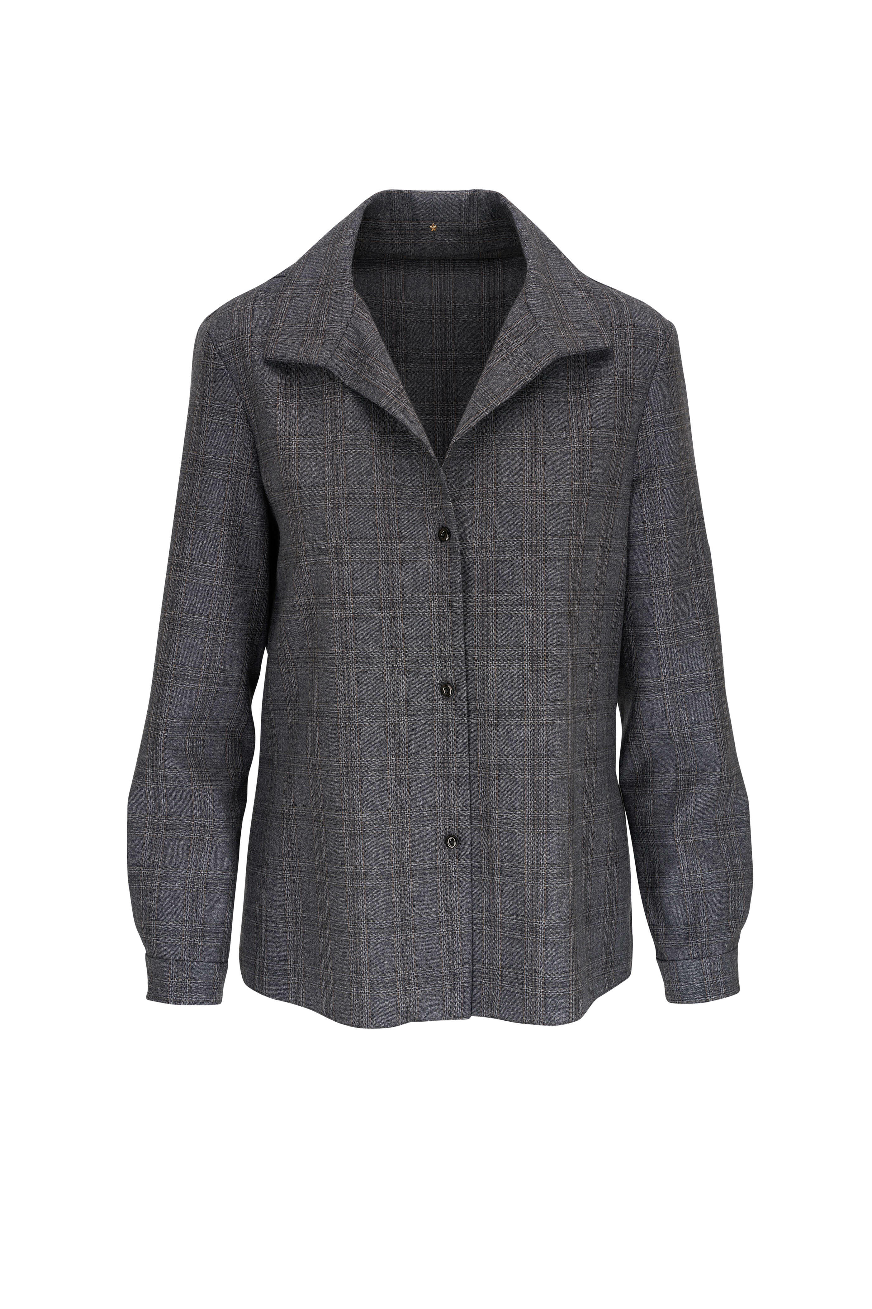 Spread collar. French placket. Single button cuffs. Side slits. Made in the USA. 25" shoulder to hem. 100% wool. Dry clean.