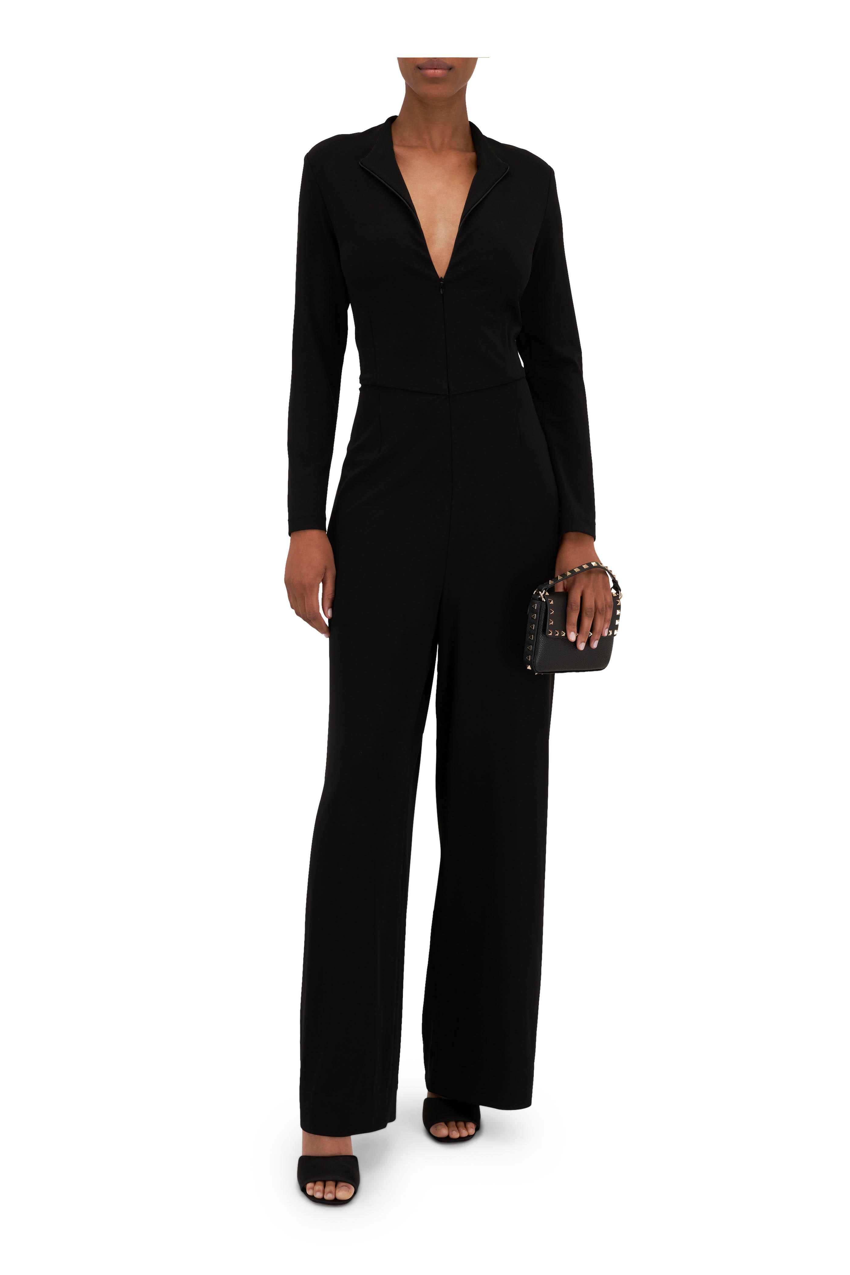Round neckline. Concealed front zip placket. Front seam details. Made in the USA. Inseam: 30". 88% viscose, 12% elastane. Dry clean.