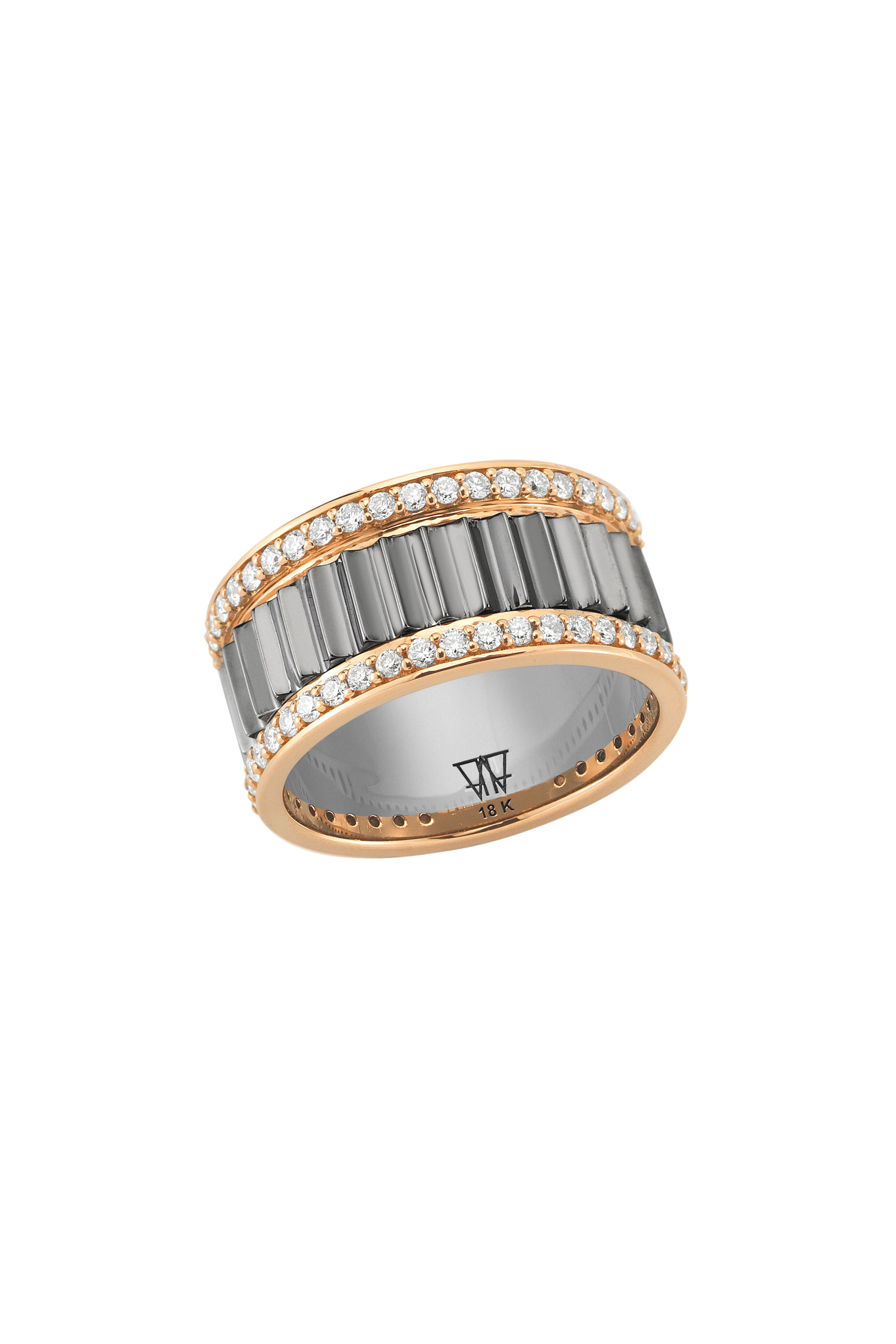 18K White & Rose Gold. Black Rhodium Finish. Diamond: 0.74 Total Carat Weight. Measures: 10mm Wide. Size 7.5.
