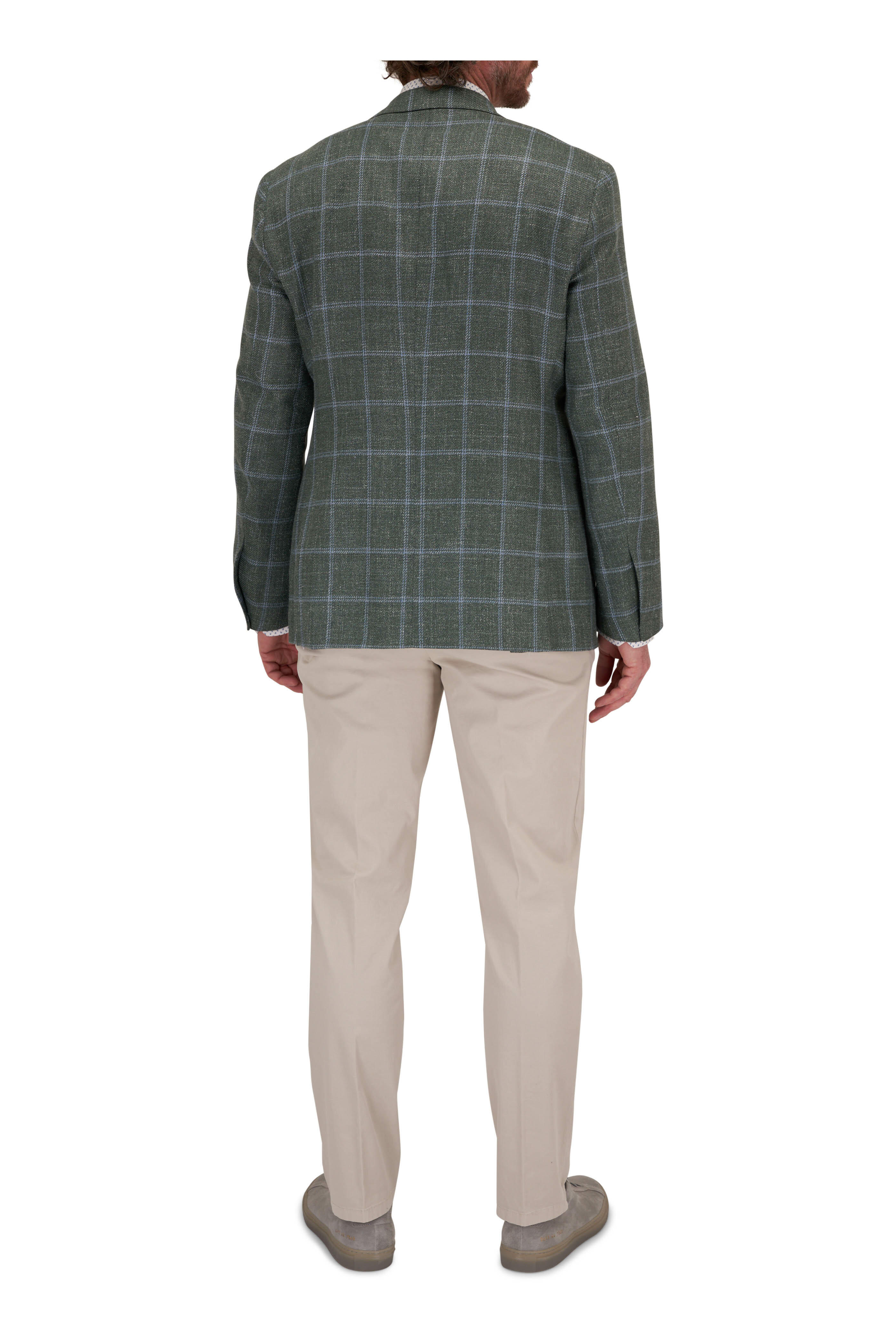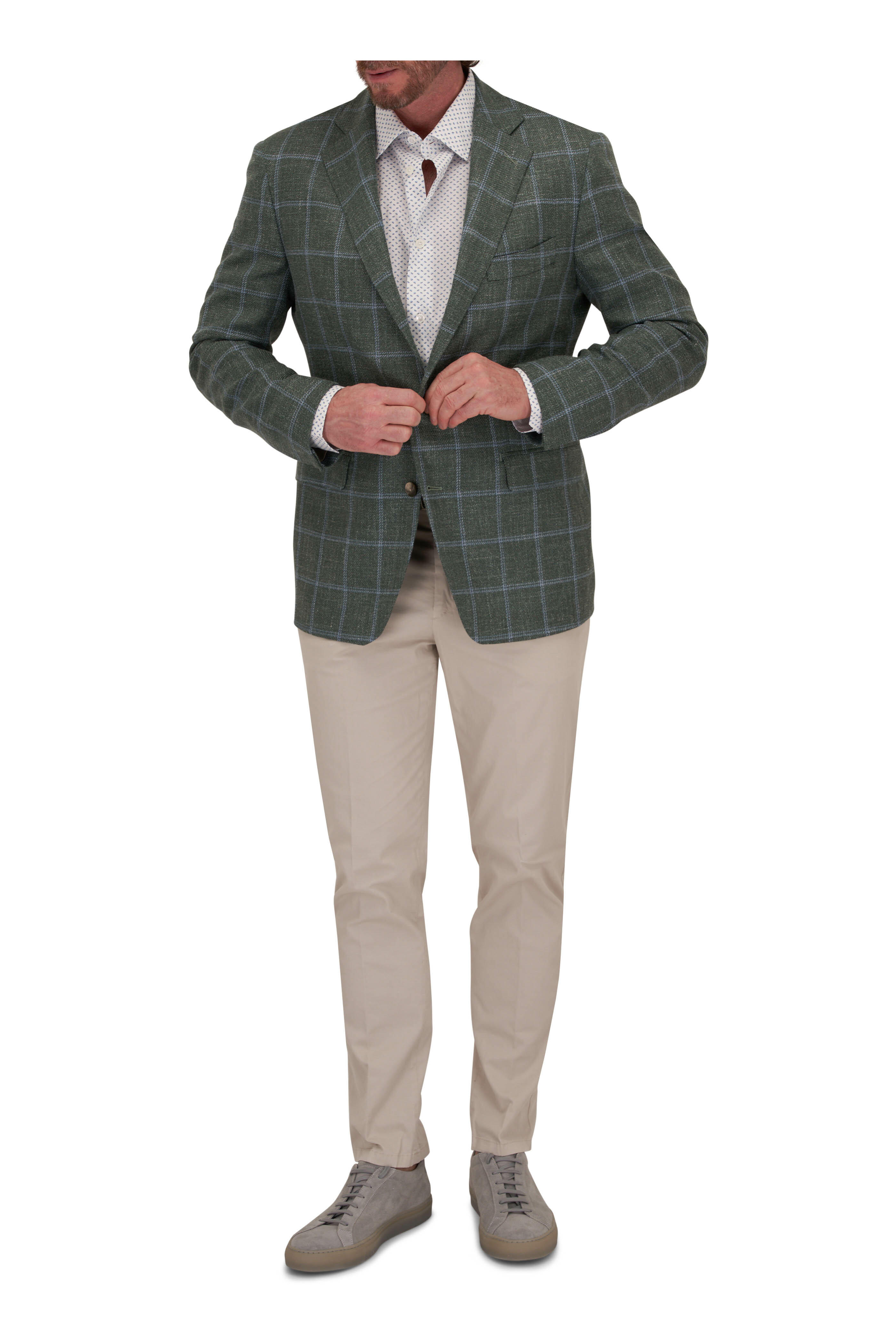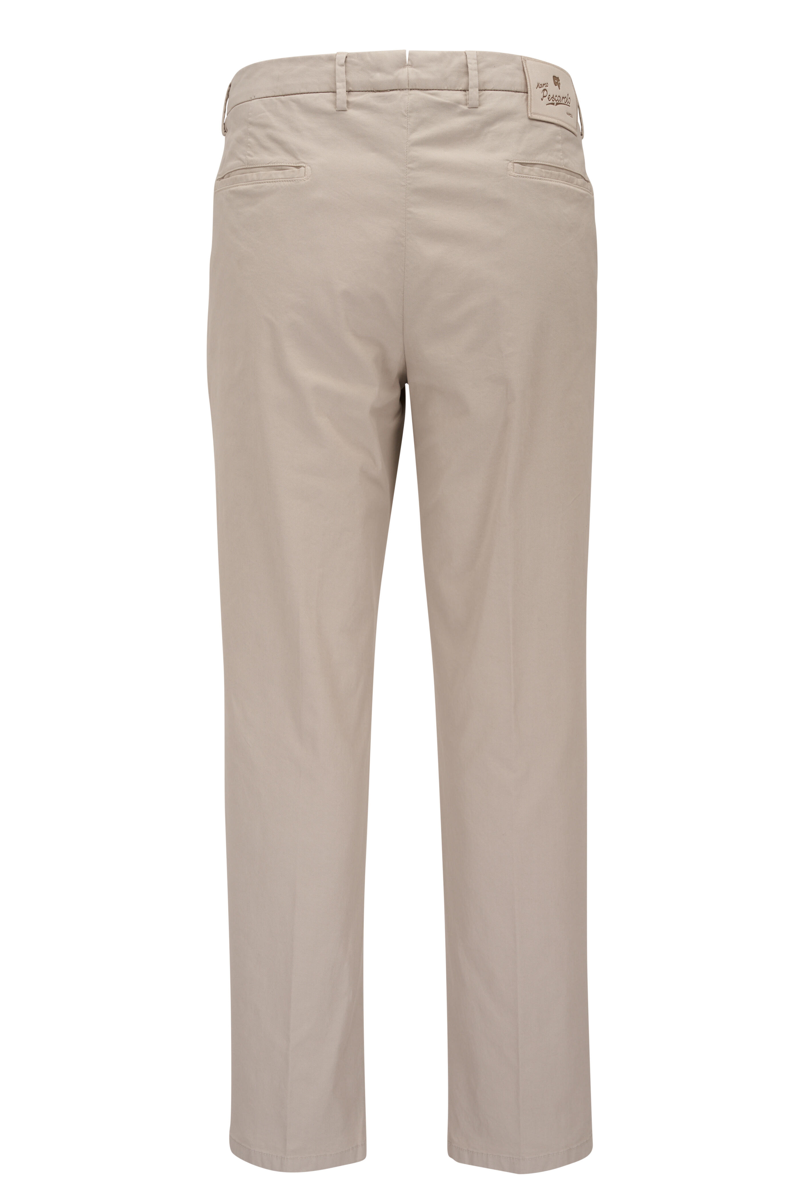 Zip fly with triple button tab. Belt loops; banded waist. Side slip pockets; back besom pockets. Made in Italy. 31" Inseam. 98% cotton, 2% elastane. Dry clean.