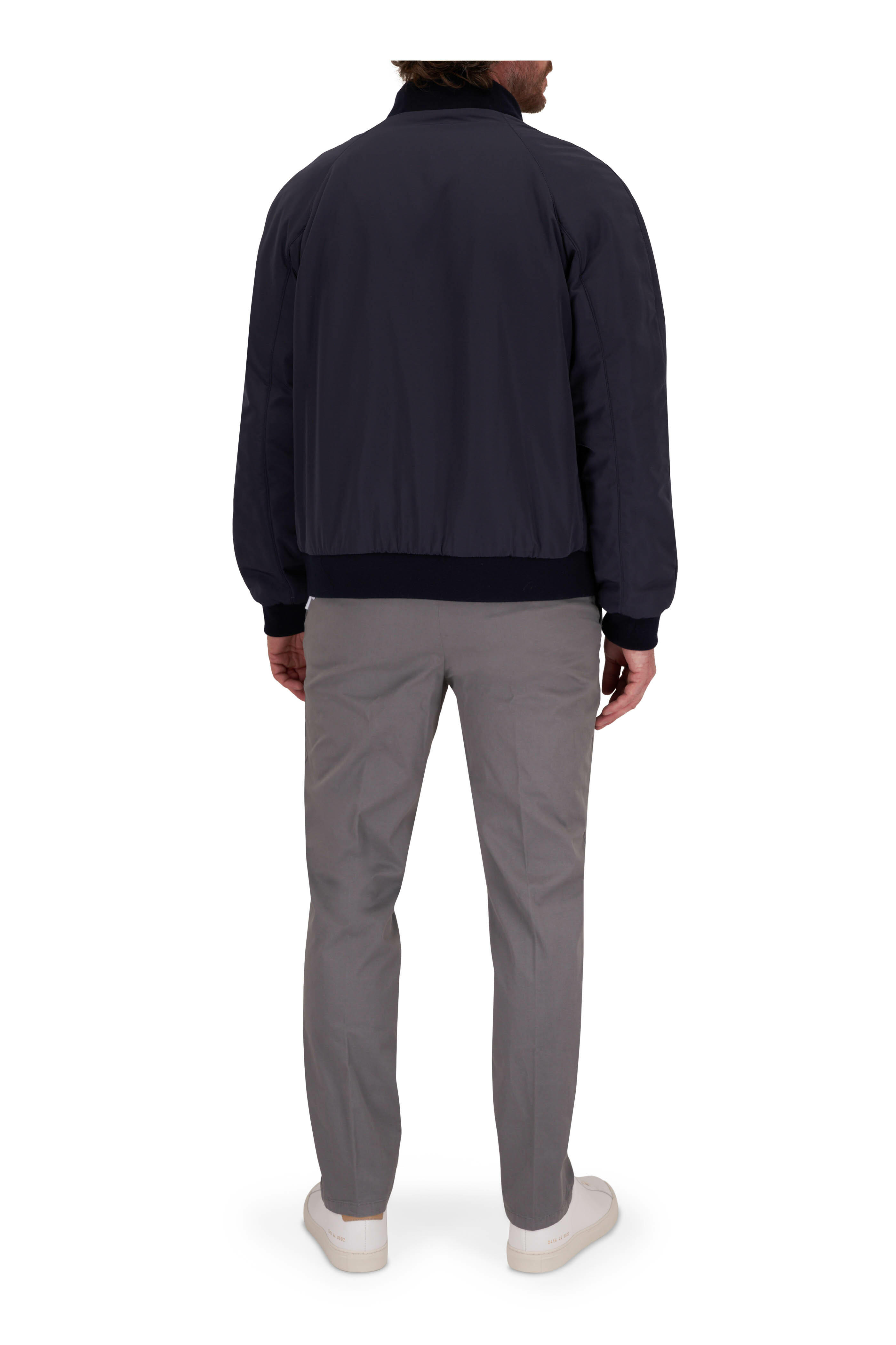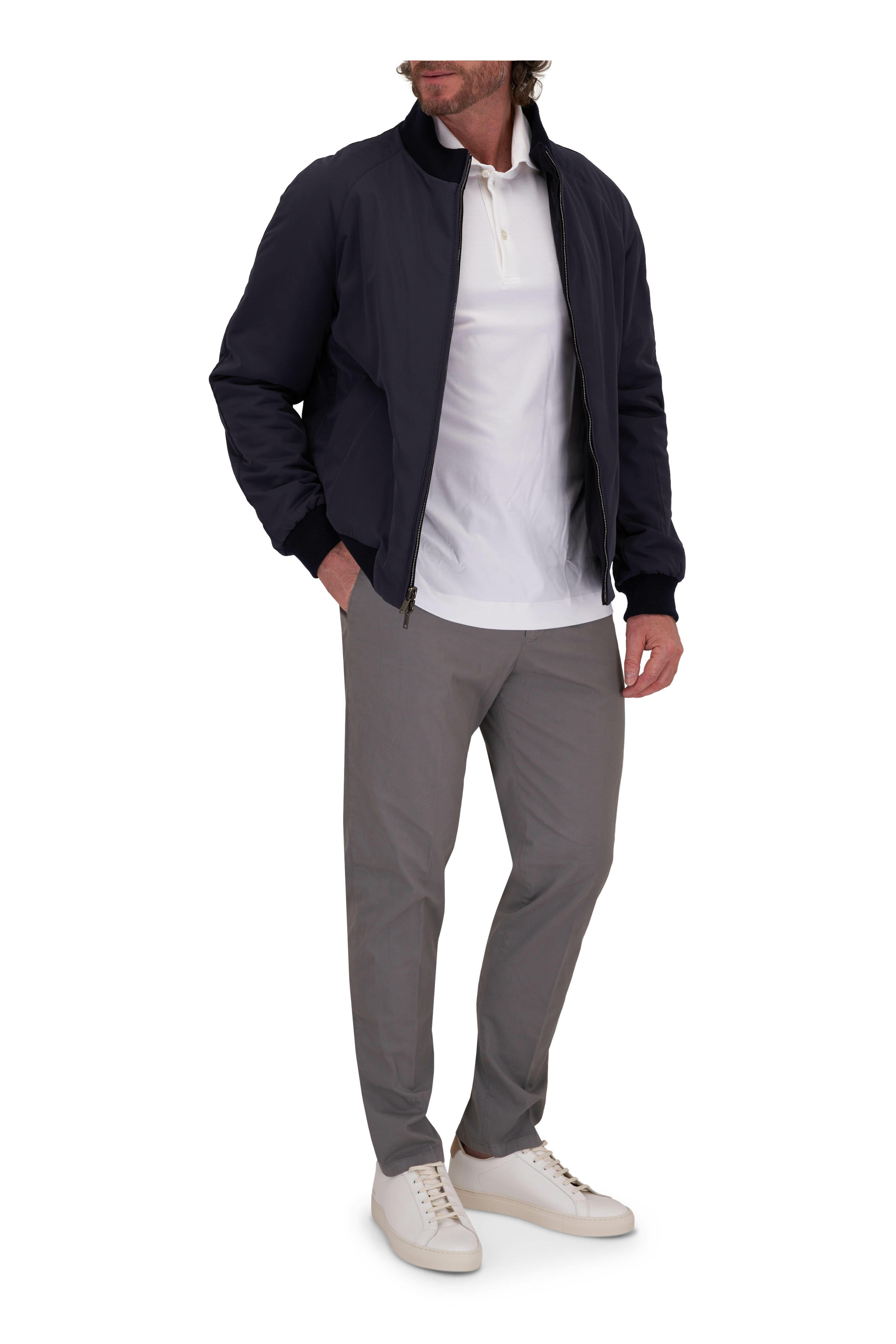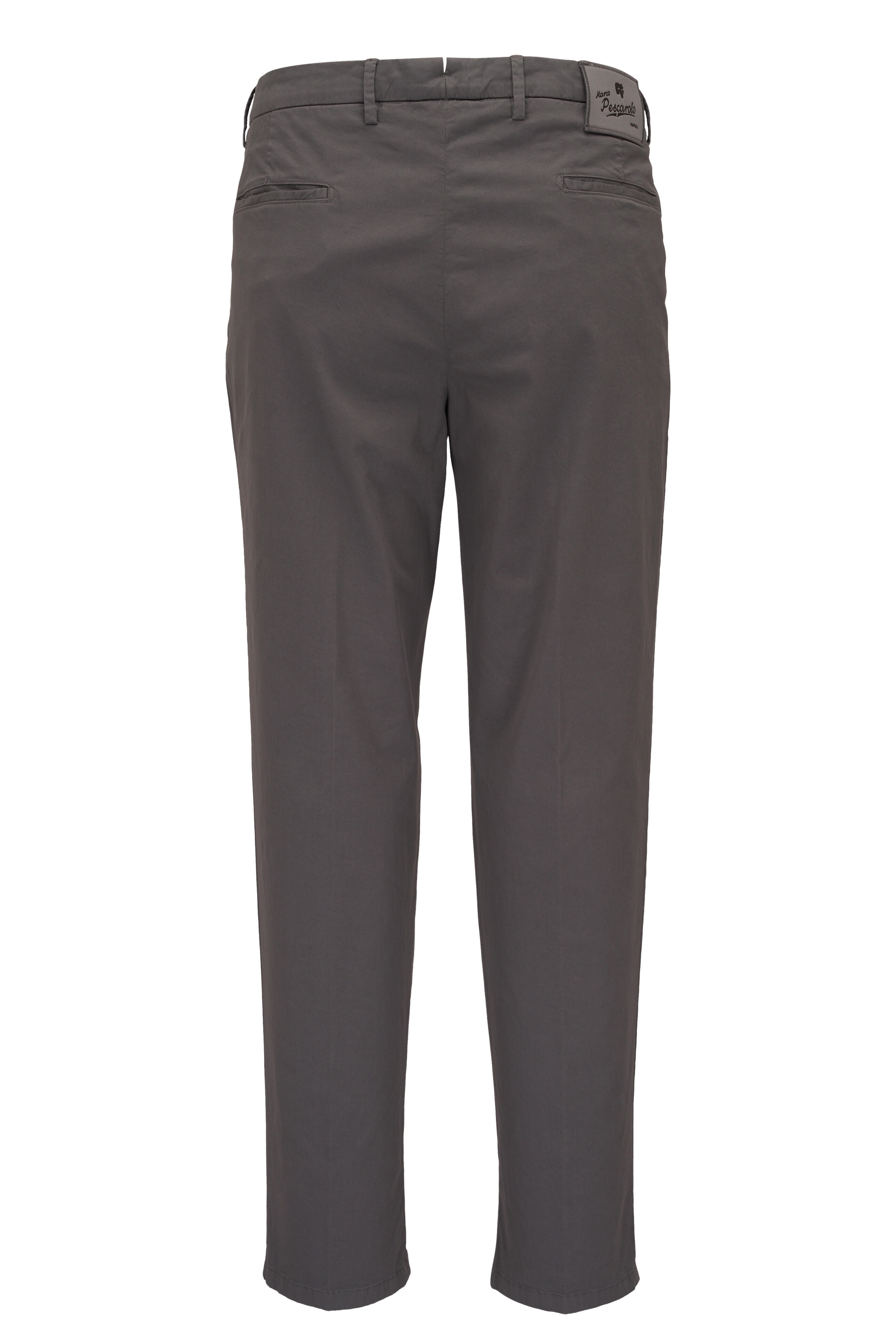 Zip fly; extended button tab. Banded waist; belt loops. Side slip pockets; back besom pockets. Made in Italy. Inseam: 30". 98% cotton, 2% elastane. Dry clean.