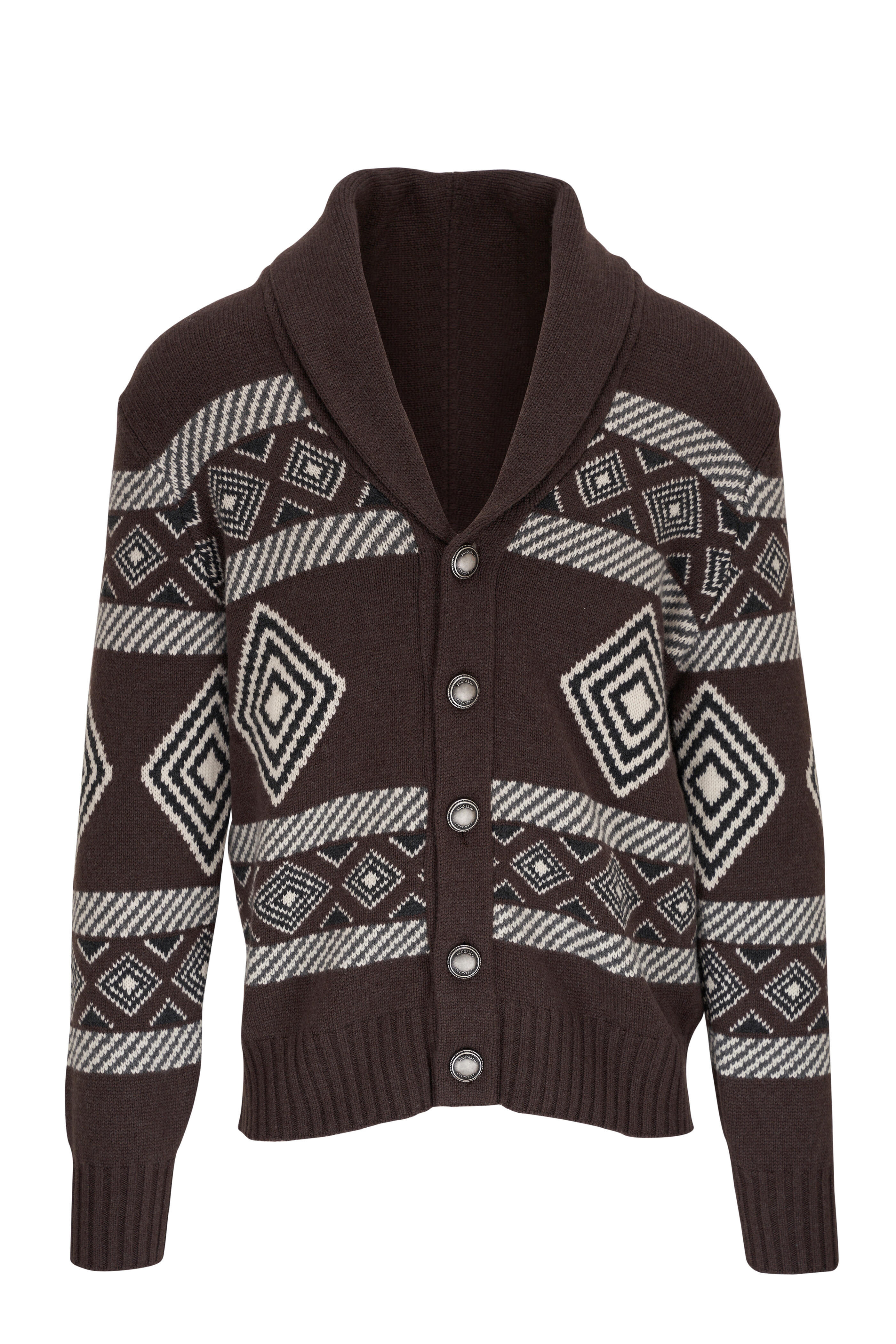 Shawl collar. Front button placket. Ribbed trims. Made in Italy. 100% cashmere. Hand wash.