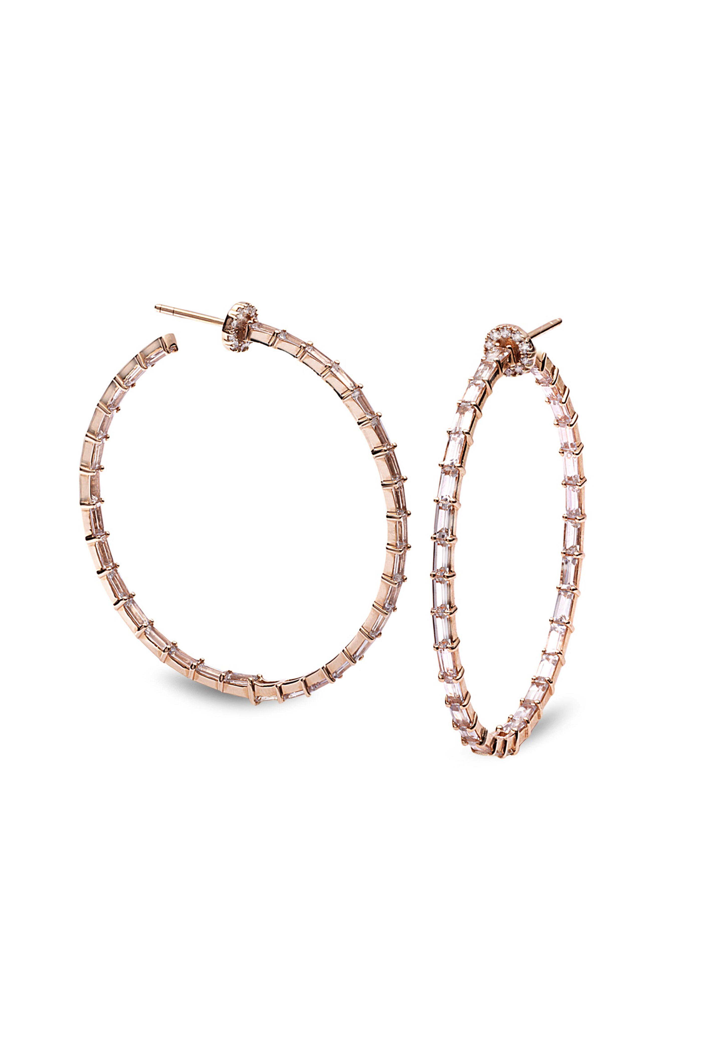 A bestselling style, these 2-inch statement hoops feature 8.22 carats of flawless prong-set white sapphire baguettes that radiate with refined brilliance. The posts display our signature pavé diamond disk—a luminous finishing touch that catches the light from every angle. Lightweight and versatile, they’re crafted in 18-karat rose gold and offered in a range of colorful gemstone “flavors” and finishes.