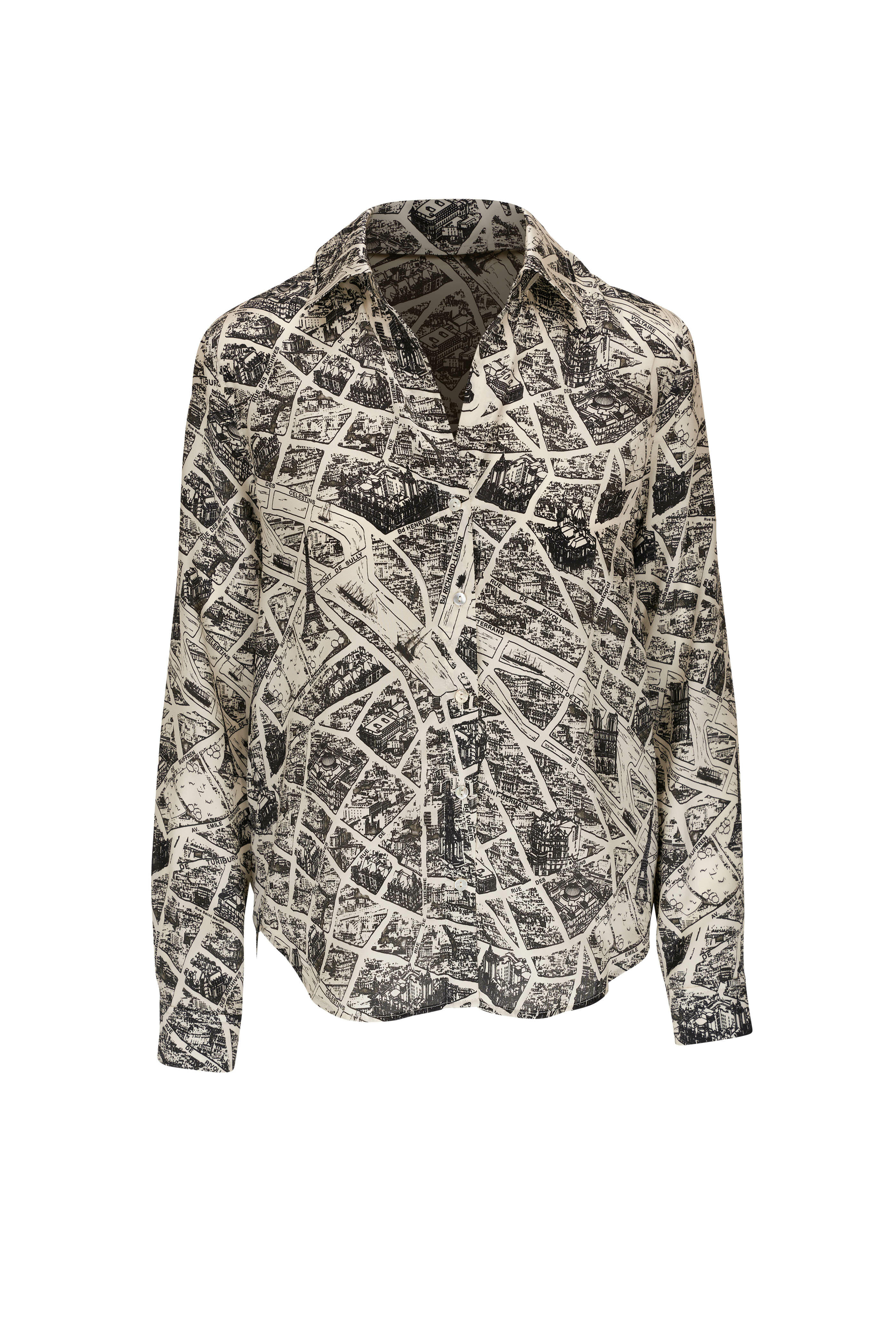 V-neckline; Spread collar. Front button placket. Three-quarter length sleeves. Single button square cuffs. Rounded, shirttail hem. Imported. Color: Ecru Multi Map of Paris. 100% silk. Dry clean.