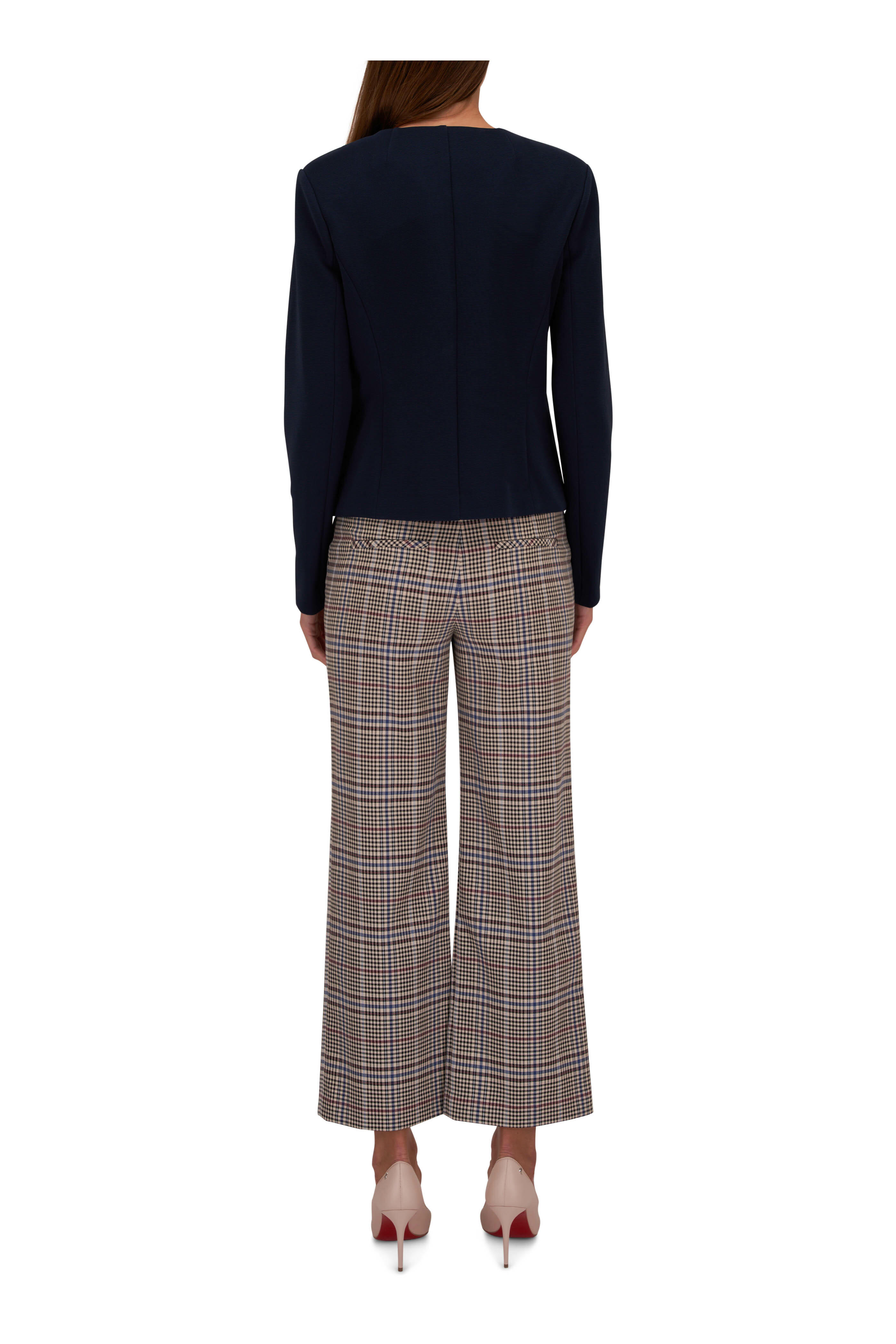 Zip fly; hook-&-bar closure. Banded waist. Side slip pockets; back welt pockets. Imported. Rise: 11 ½". Inseam: 27". Wide leg. 64% polyester, 34% viscose, 2% elastane. Dry clean.