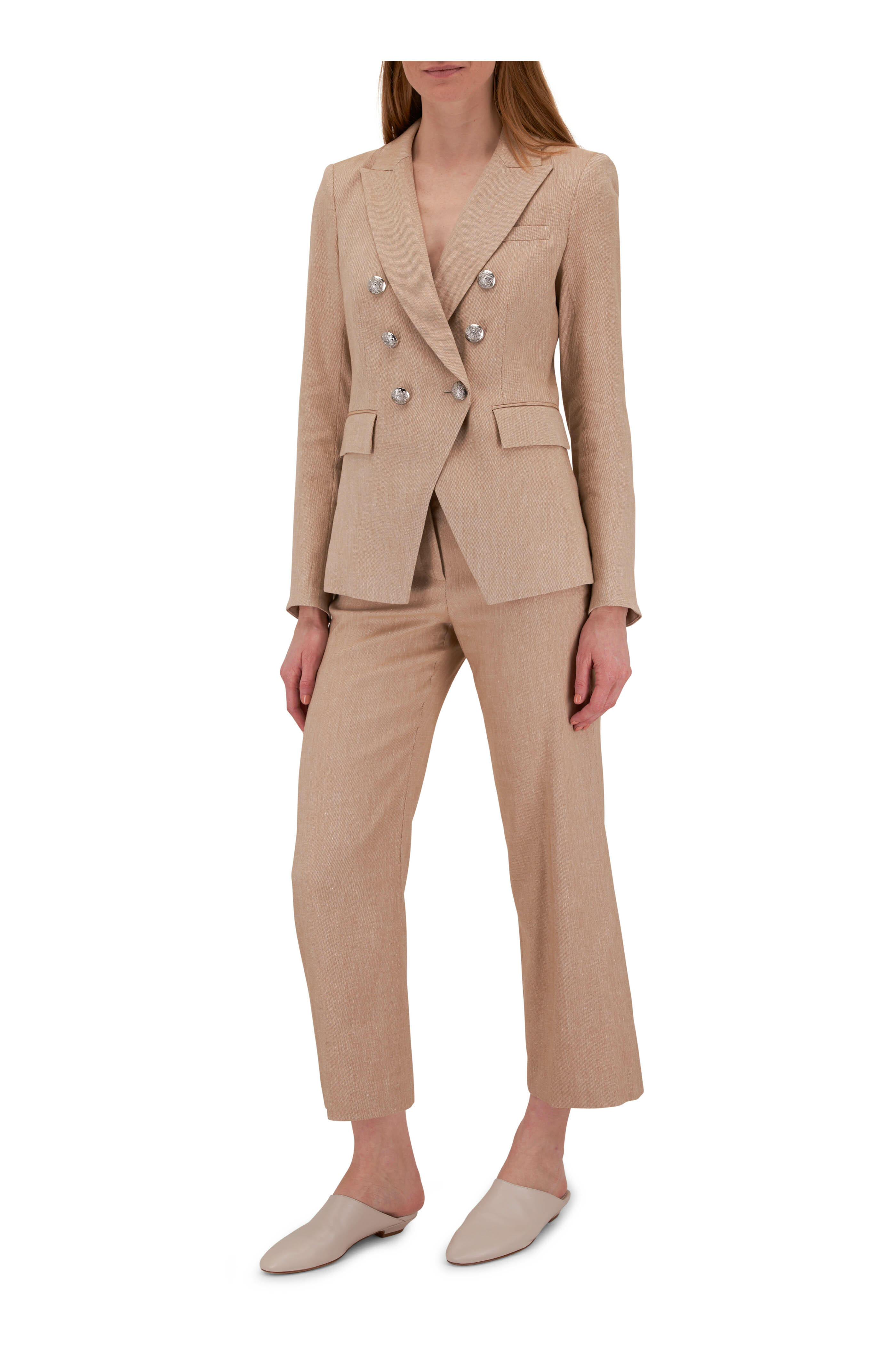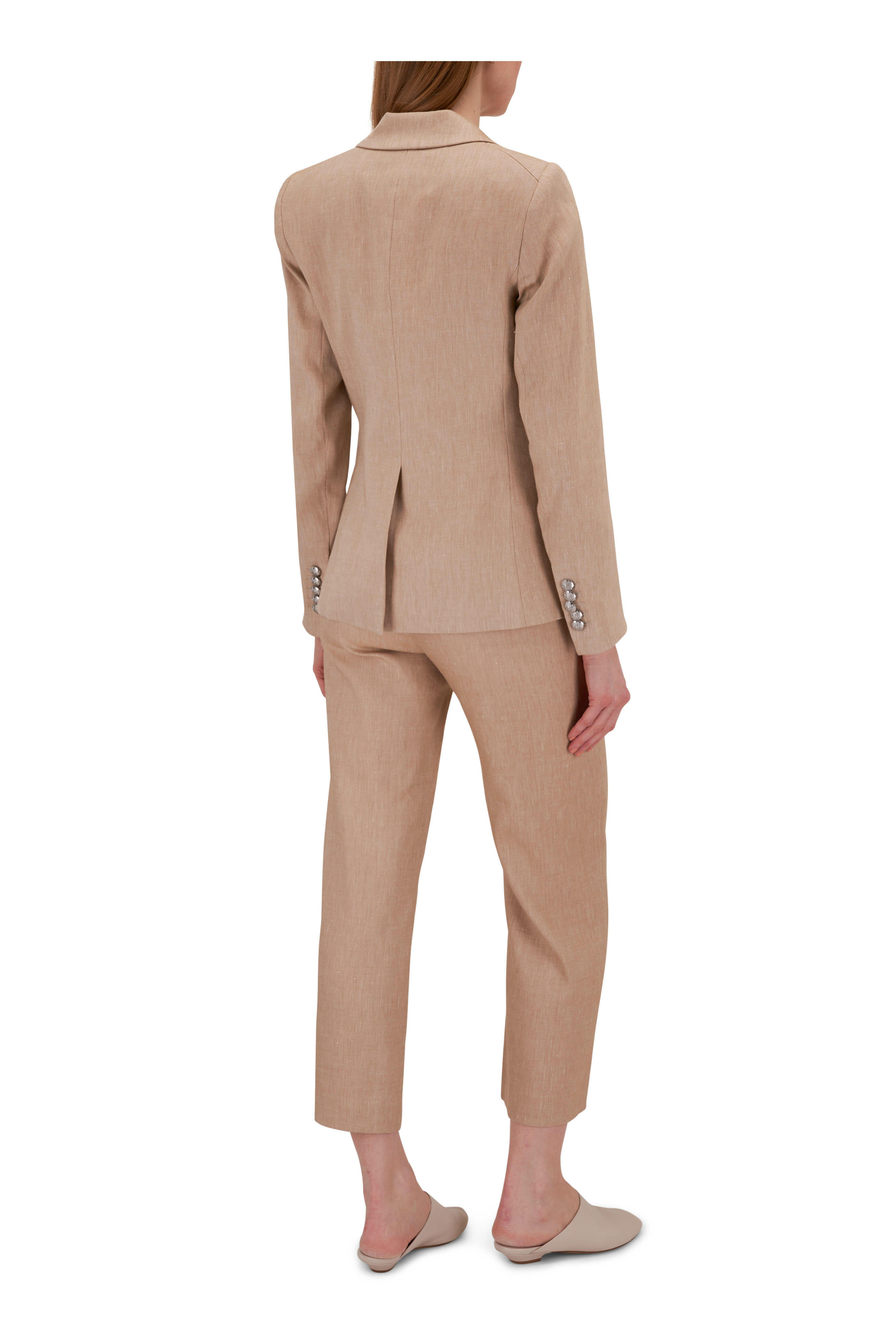 Lined. Peak lapels. Single button closure. Chest welt pocket; Lower waist flap pockets. Five button cuffs. Single vent. Made in the USA. Compatible with all Veronica Beard dickeys (sold separately).. 58% linen, 27% polyester, 14% viscose, 1% elastane. Dry clean.