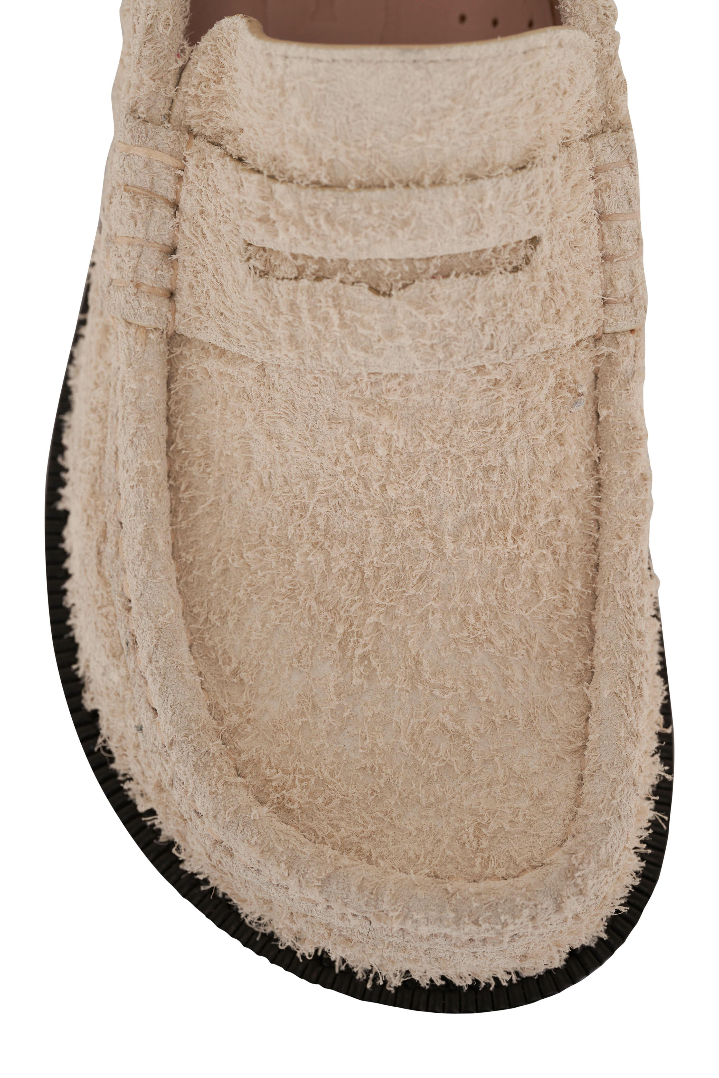 Brushed suede upper. Moc toe. Slip on style. Penny strap at vamp. Leather lining and cushioned insole. Leather sole. Made in Italy. Heel height: 13mm (½").