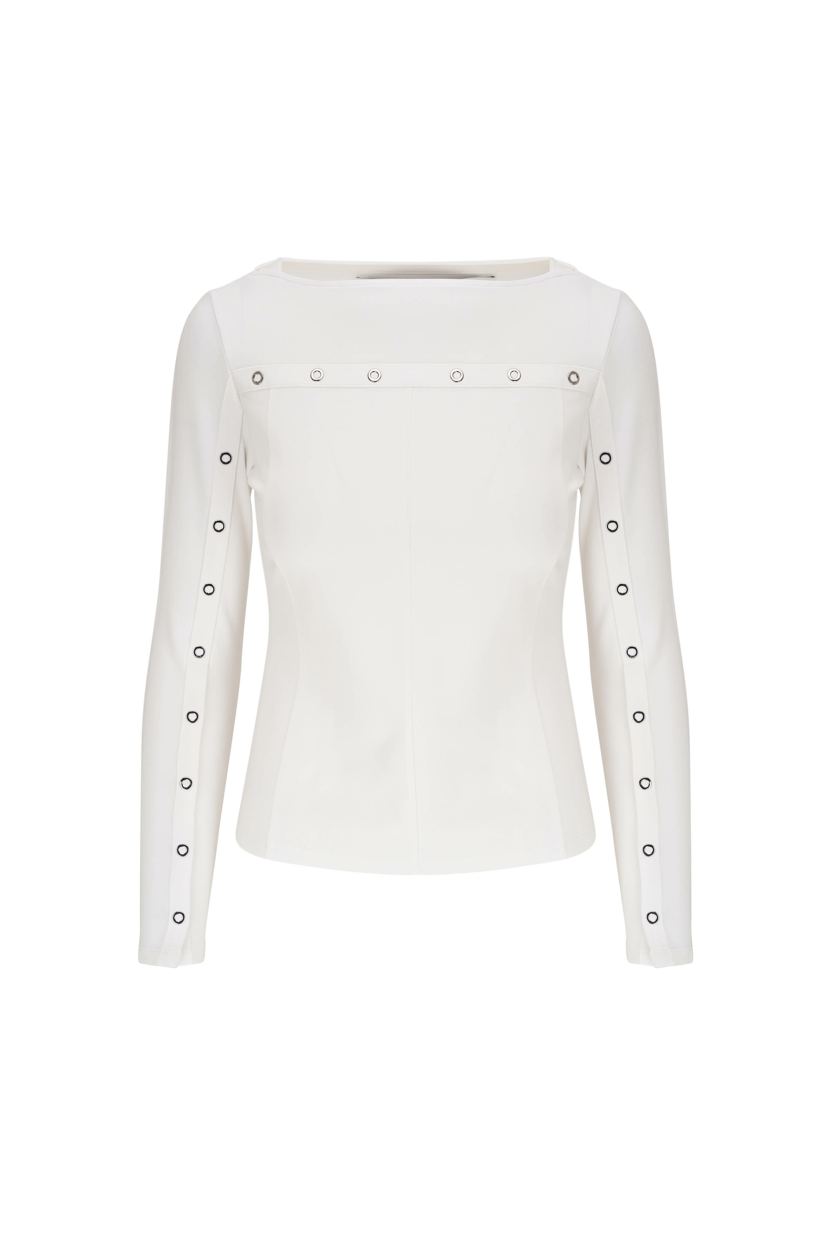 Bateau neckline. Slip-on style. Grommet snap button details. Imported. 65% rayon, 30% nylon, 5% elastane. Dry clean.
