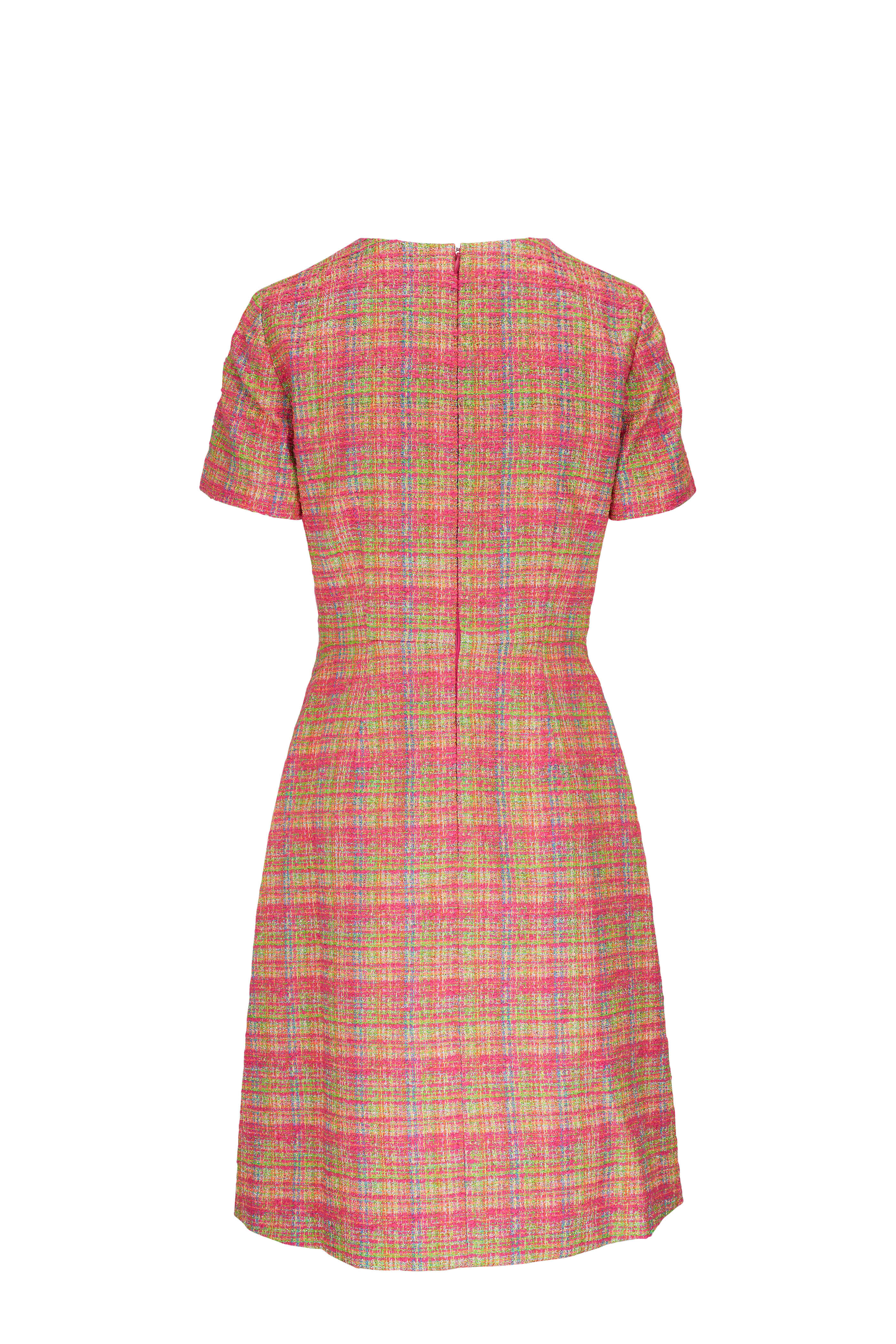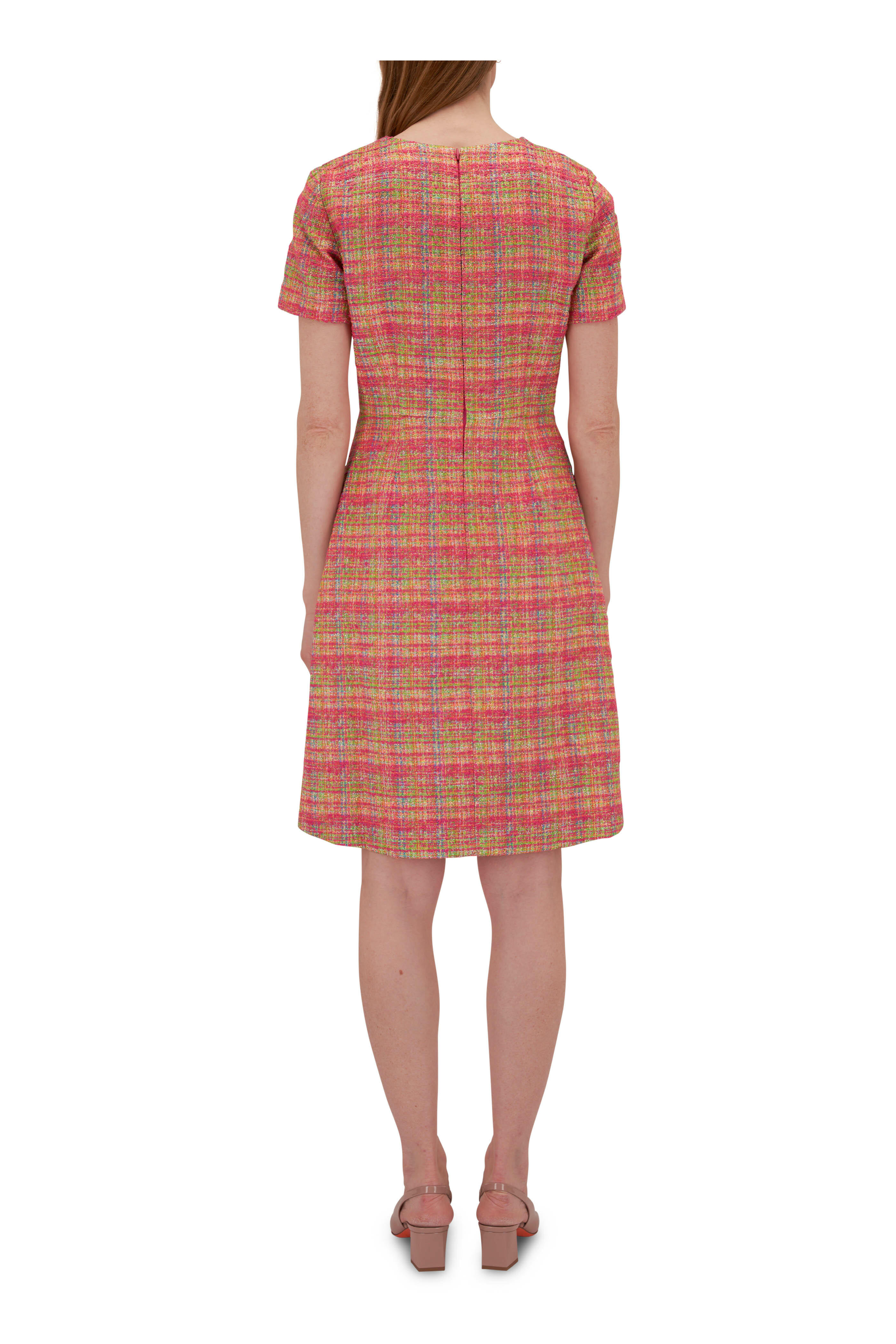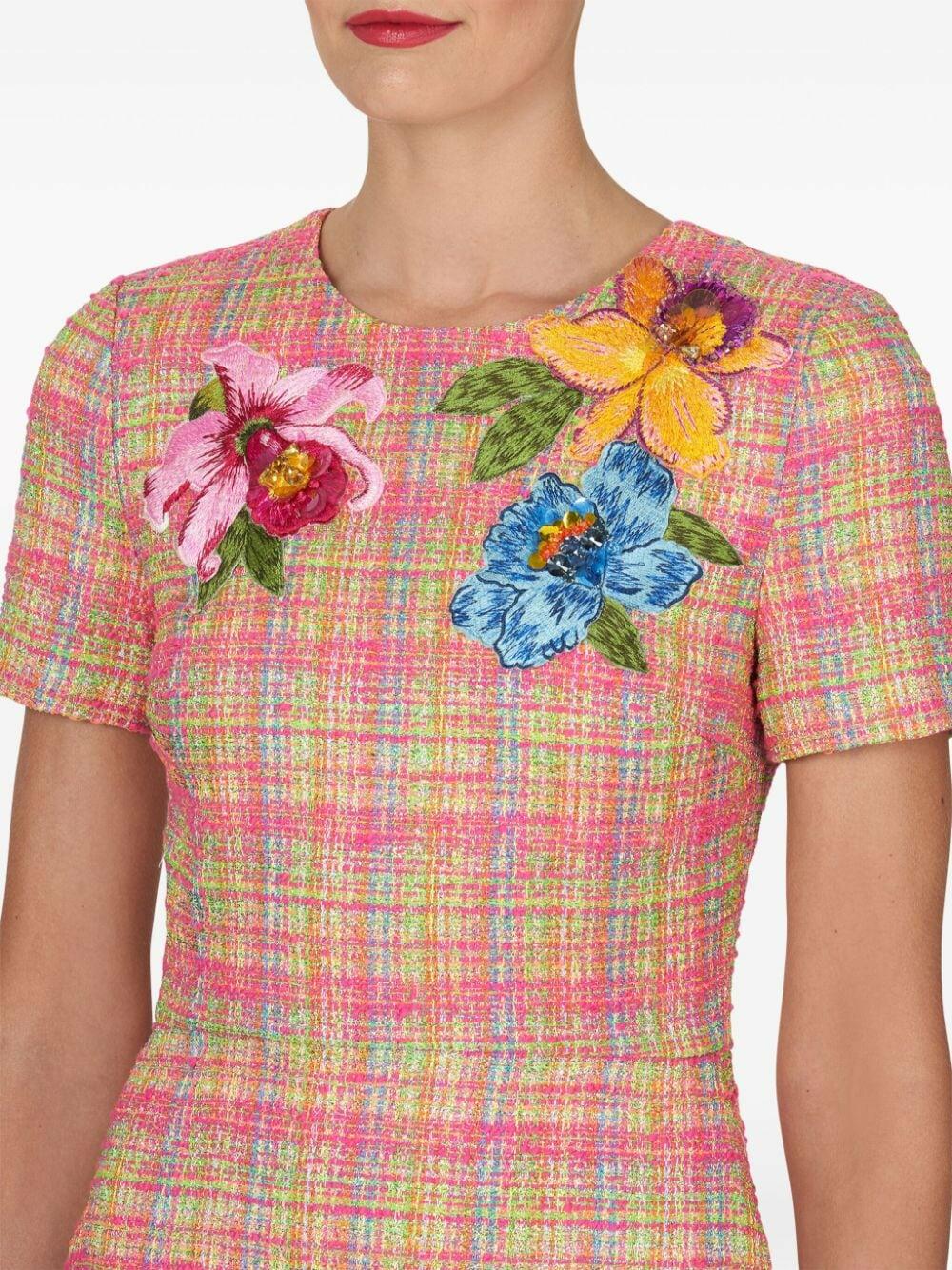 Fully lined. Round neckline. Concealed back zip. Floral embellishment. Concealed lower waist pockets. Straight hem. Imported. Approx. 39" shoulder to hem. 49% polyester, 46% cotton, 5% polyamide. Dry clean.