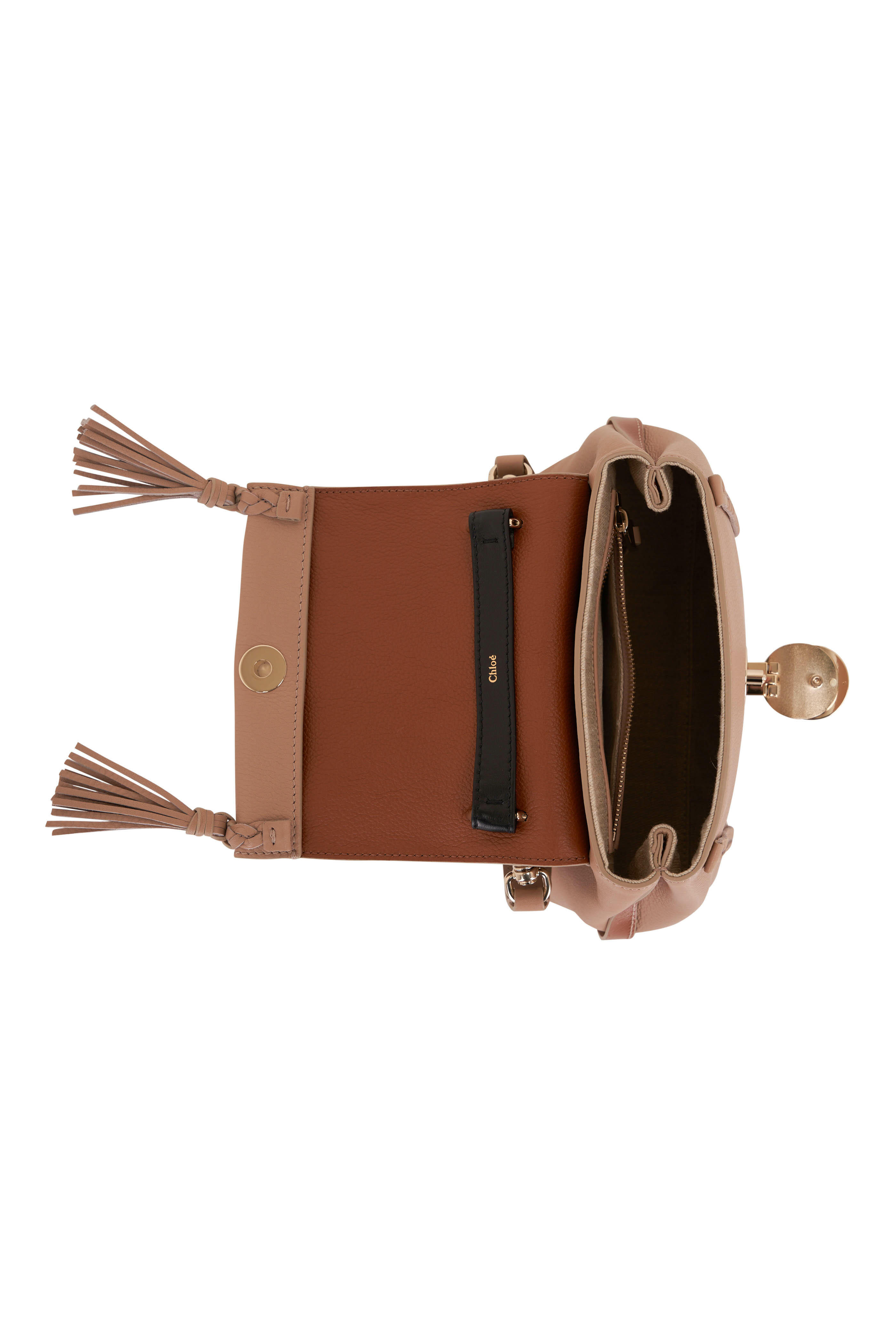Leather. Removable top handle. Removable leather shoulder strap. Flap with round metallic closure system. Single compartment. Internal zip pocket. Linen lining. Made in Spain. Width: 9.8" (25 cm). Height: 7.9" (20 cm). Depth: 3.9" (10 cm). Handle drop: 7.5" (19 cm). Strap drop: 19.7" (50 cm). Carry: shoulder & cross-body.
