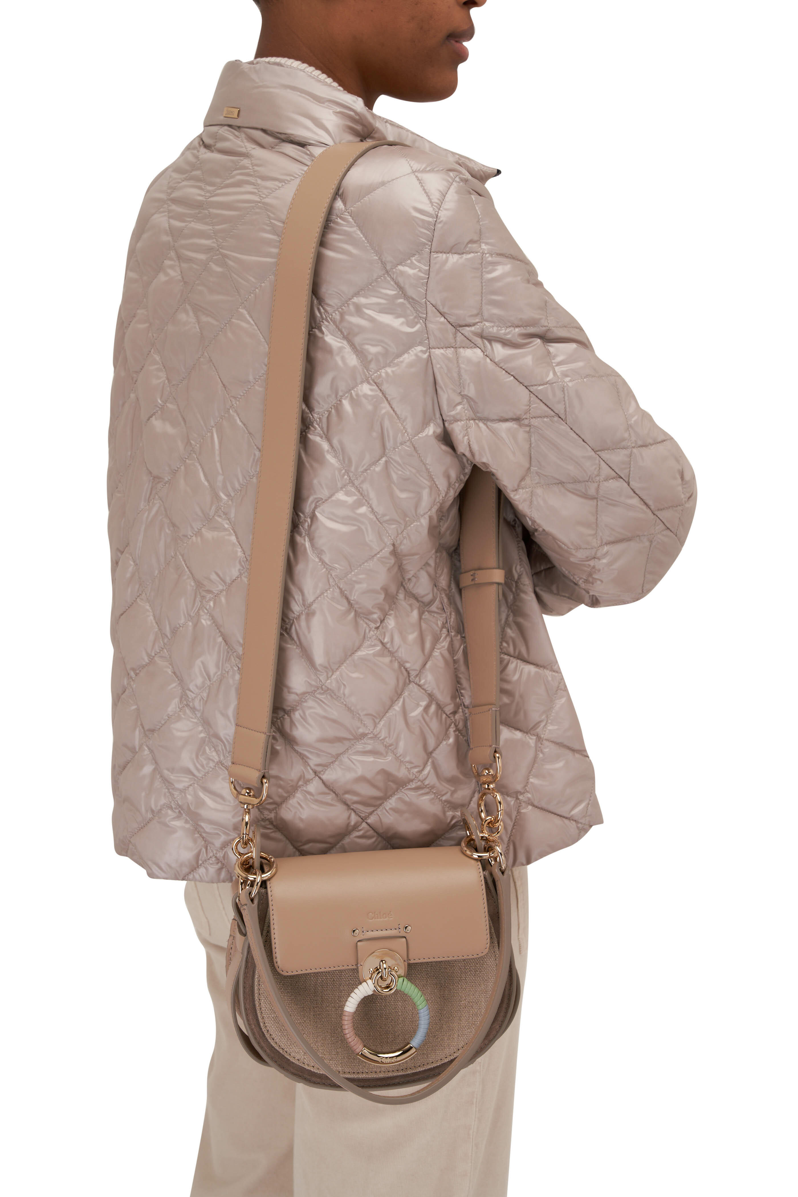 Calfskin and linen. Removable top handle strap. Removable, adjustable shoulder strap. Front flap with magnet closure. Single front under flap pocket; Single flat interior pocket. Linen lining. Gold-toned hardware. Made in Spain. Width: 7.9" (20 cm). Height: 6.7" (17 cm). Depth: 2.8" (7 cm). Min. long strap drop: 18.1" (46 cm). Max. long strap drop: 22.4" (57 cm). Short strap drop: 8.7" (22 cm). Carry: Hand, long shoulder & crossbody.