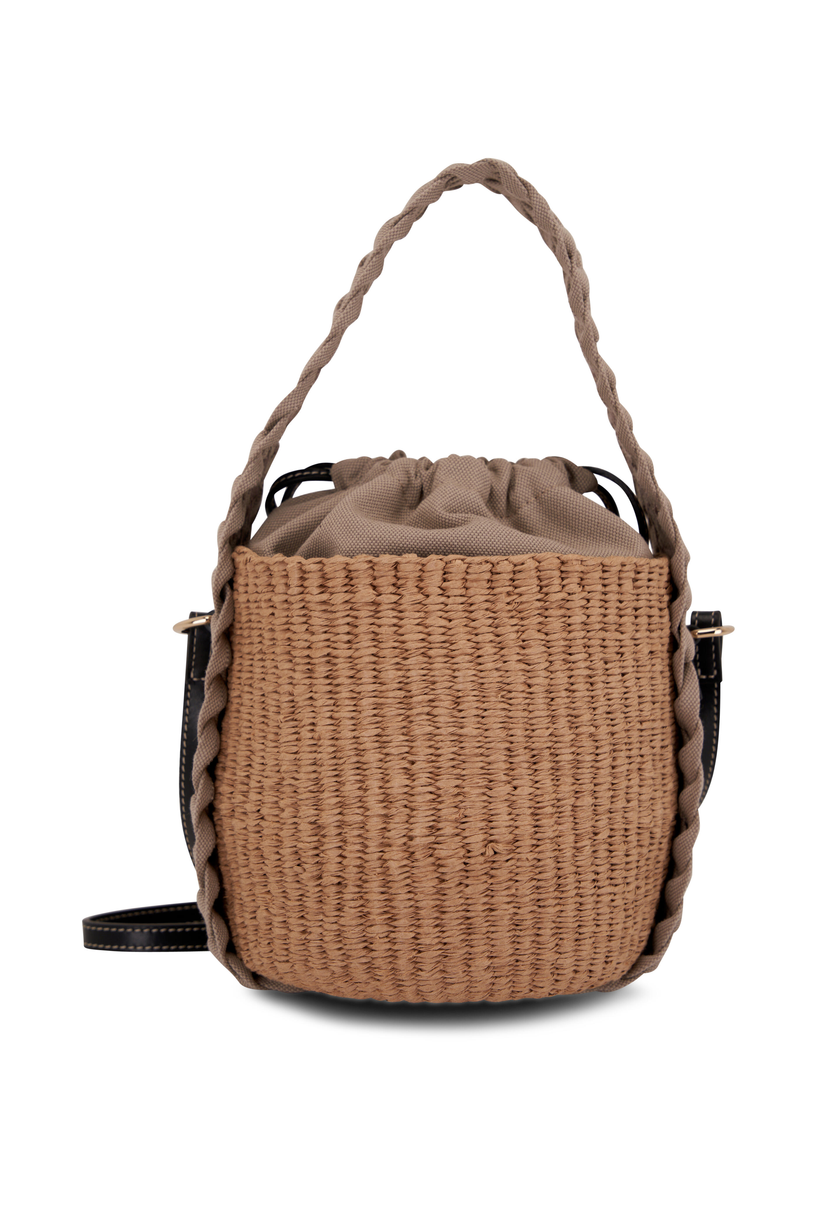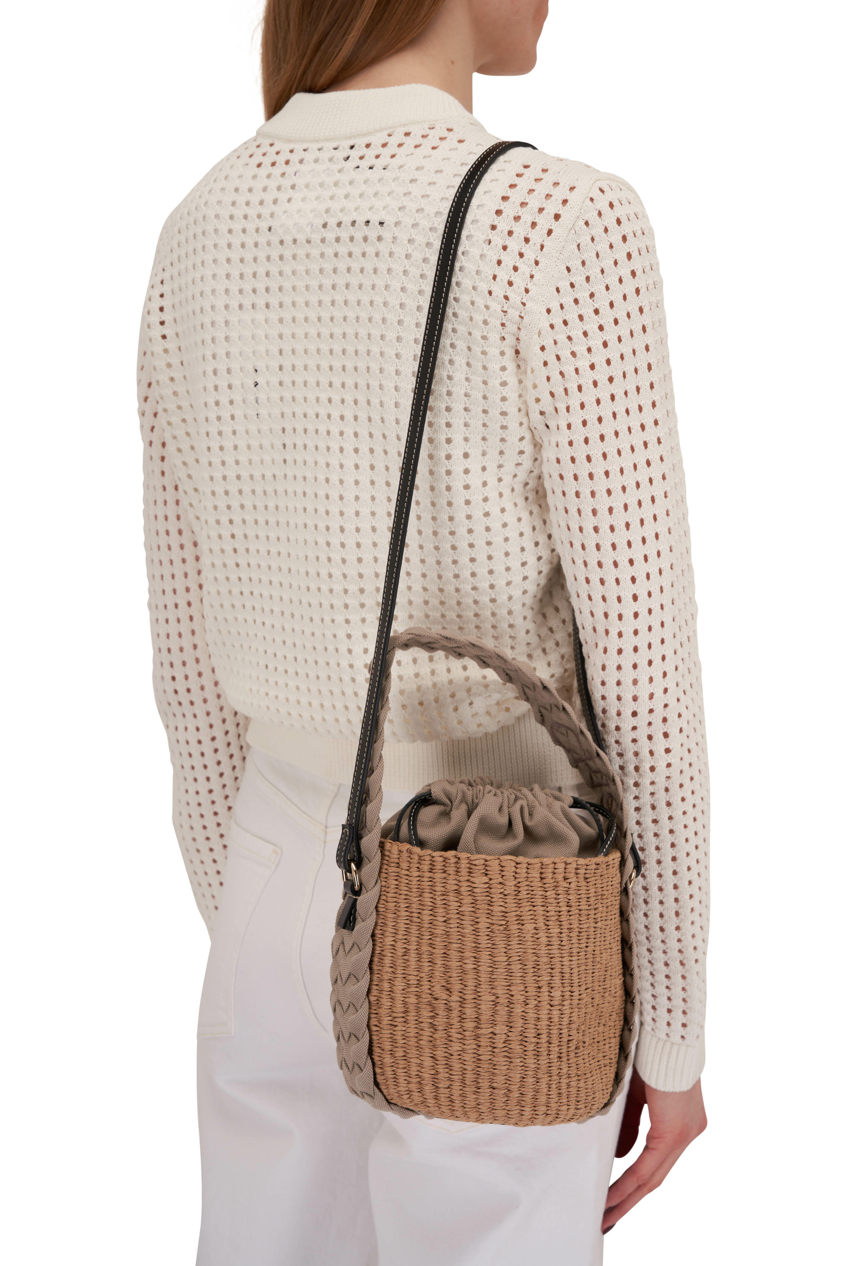 - Woven top handle; leather shoulder strap