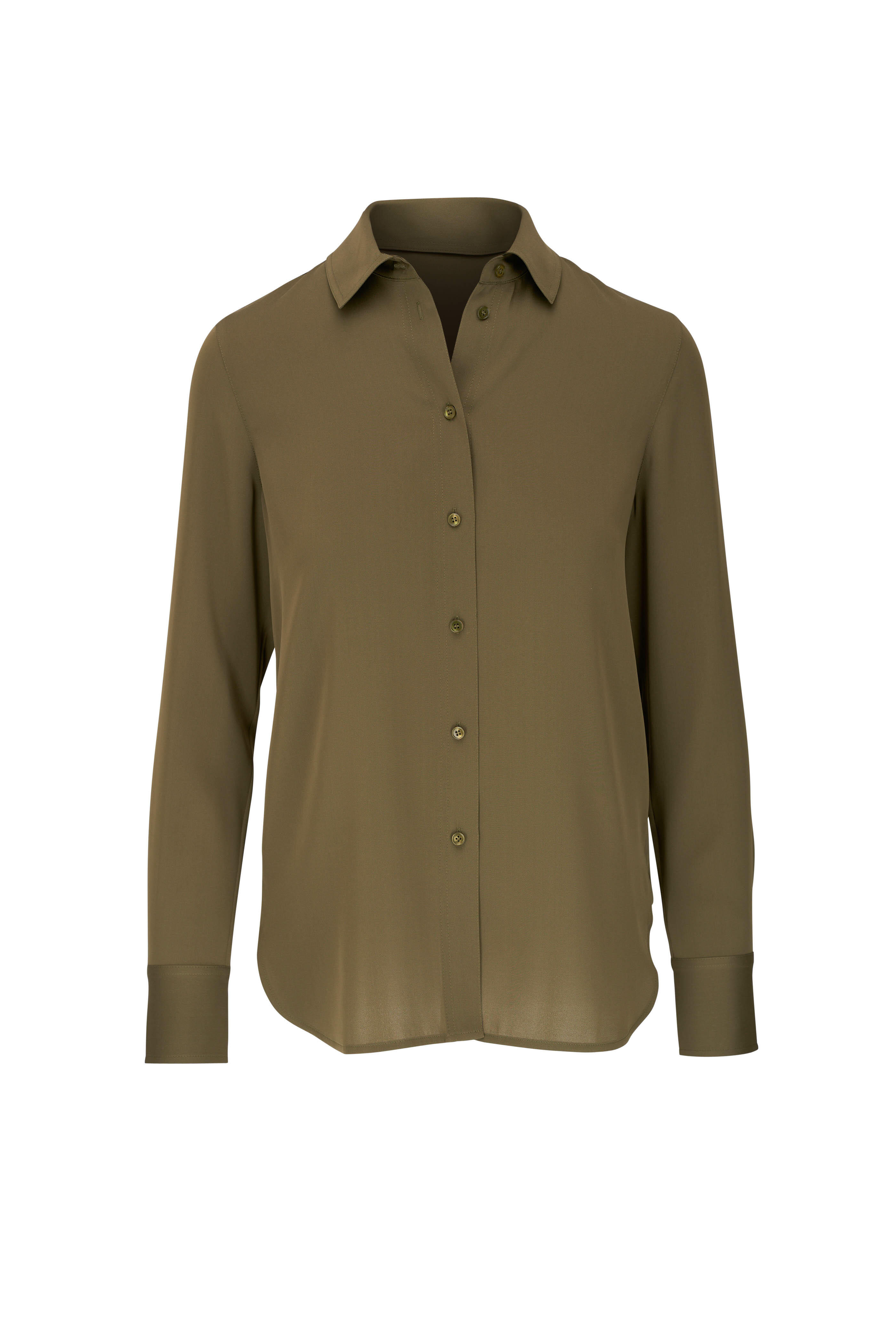 Spread collar. French placket. Single button square cuffs. Imported. 92% silk, 8% elastane. Dry clean.