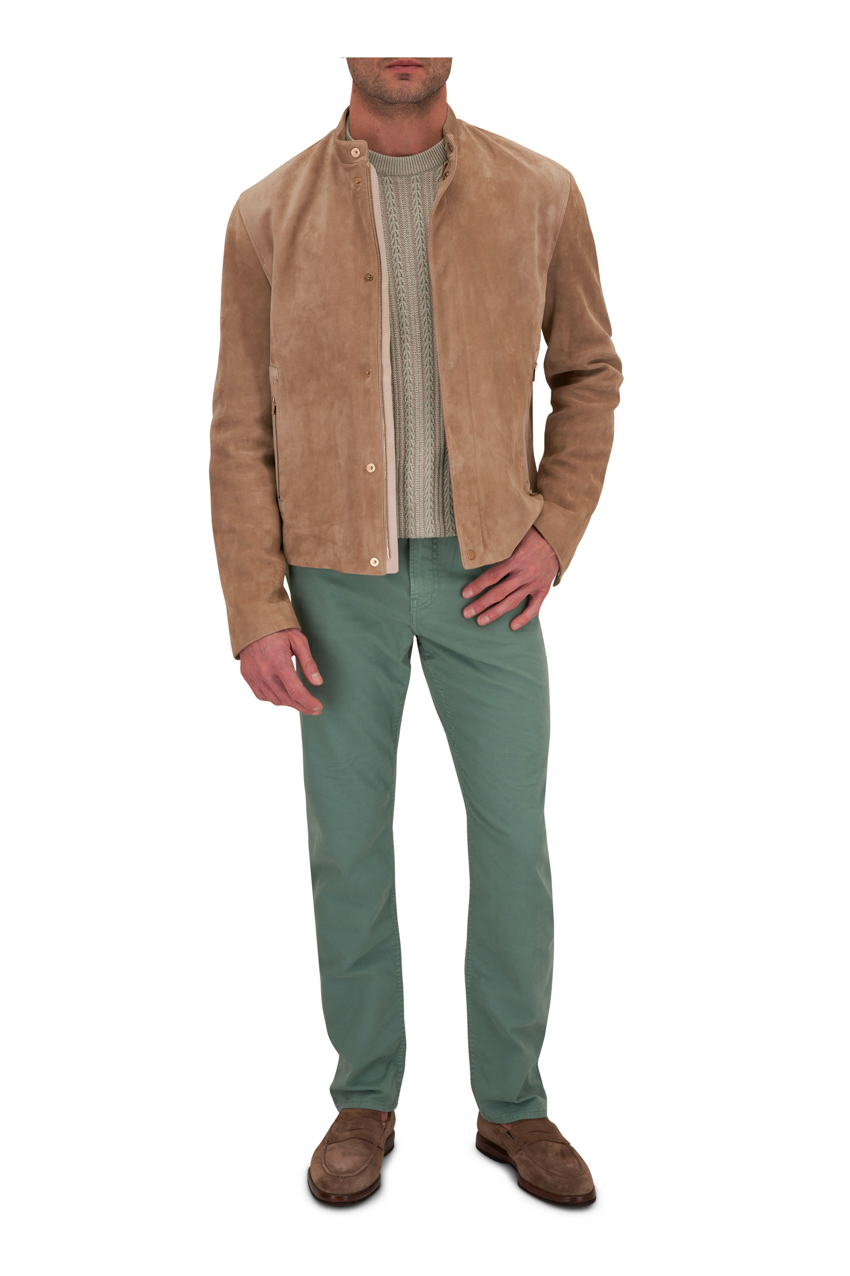 - Lower waist vertical zip pockets; Interior chest pocket; Interior waist leather pocket