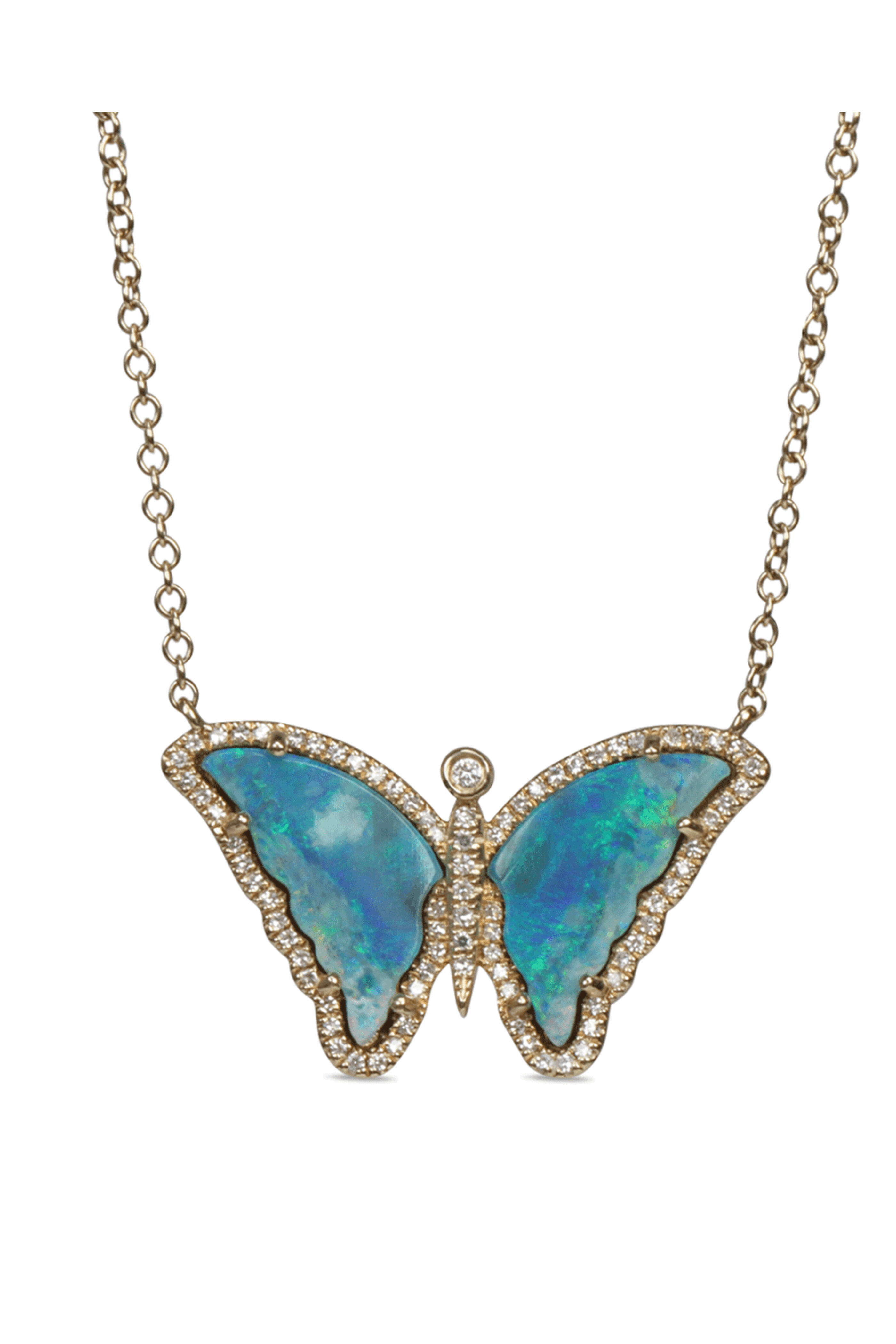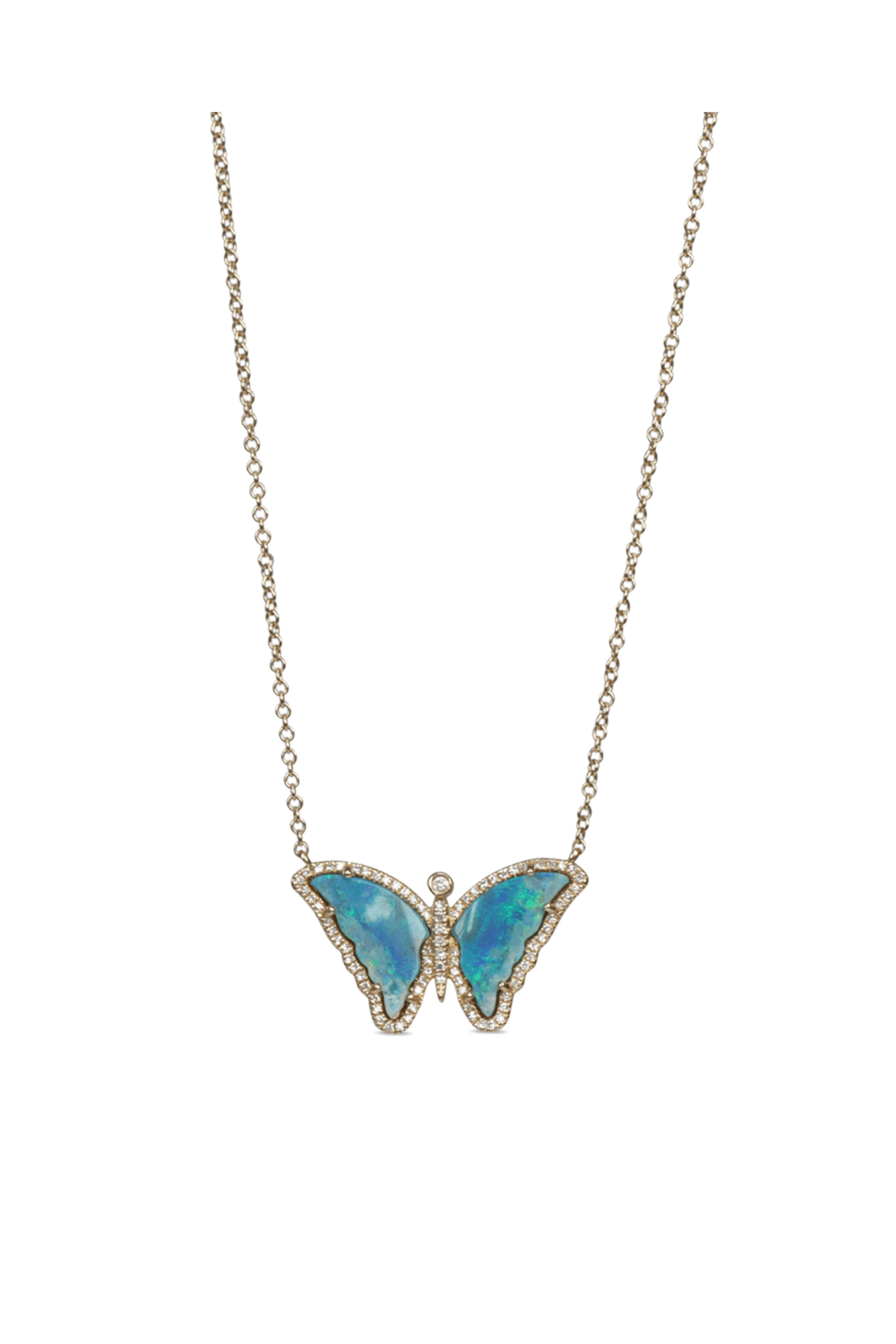 Kai Linz Diamond Opal Butterfly Necklace. 14k gold. Diamond. Opal. Butterfly design. Prong setting. Cable chain. Lobster claw clasps.