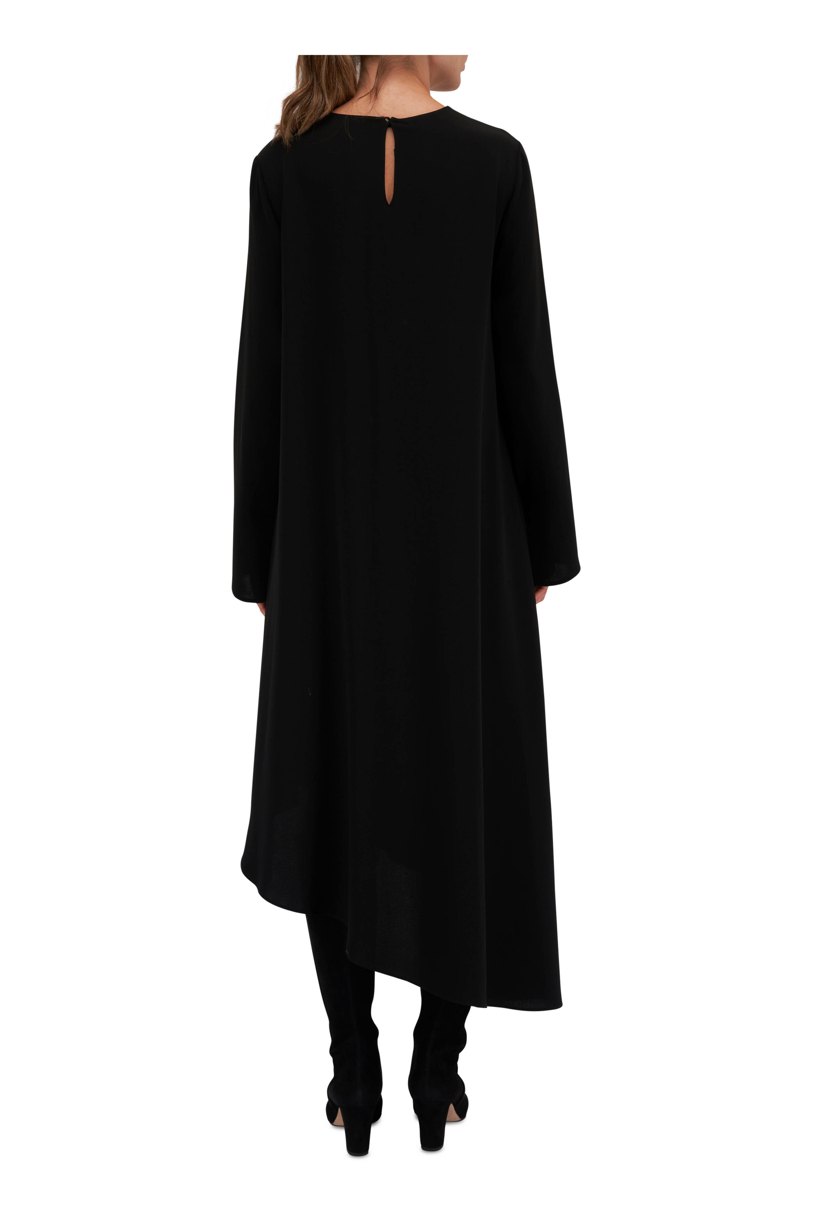 Round neckline. Keyhole back button closure. Split cuffs. Asymmetric hem. Imported. Shoulder to hem shortest 37", longest 51". 71% acetate, 29% polyester. Dry clean.