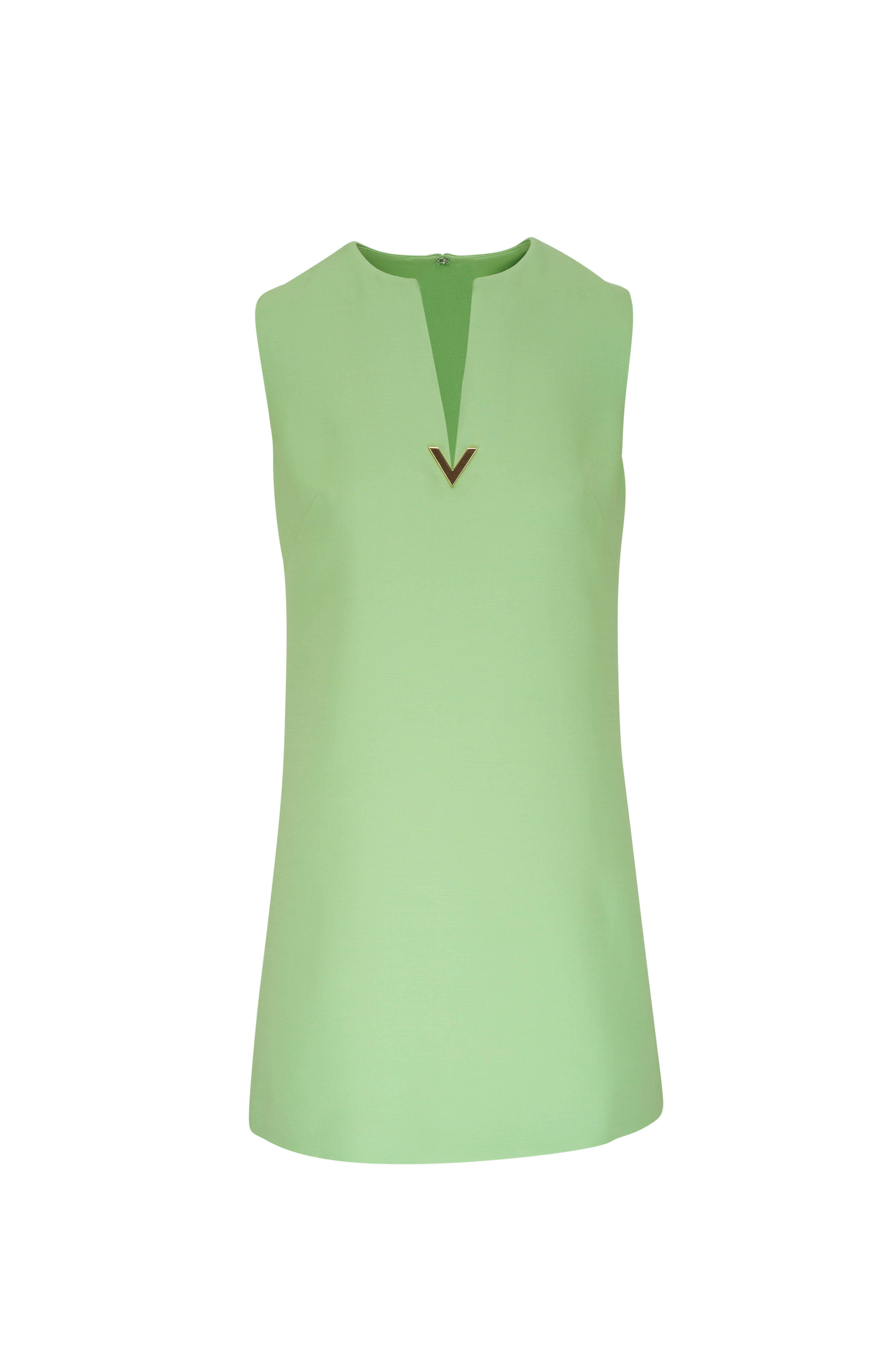 V- neckline; v gold detail on neckline. Concealed back zip. Straight hem. Made in Italy. 32" Shoulder to hem. 65% wool, 35% silk; Lining: 100% silk. Dry clean.