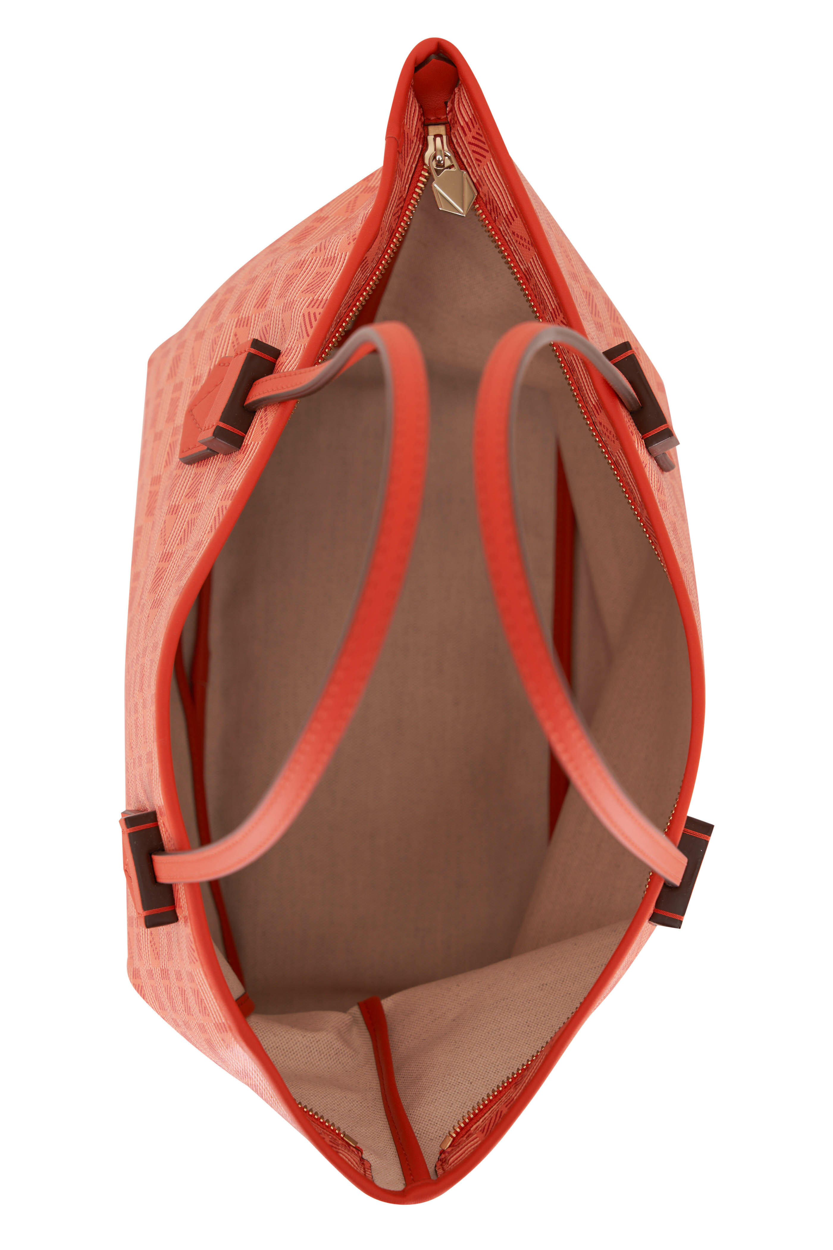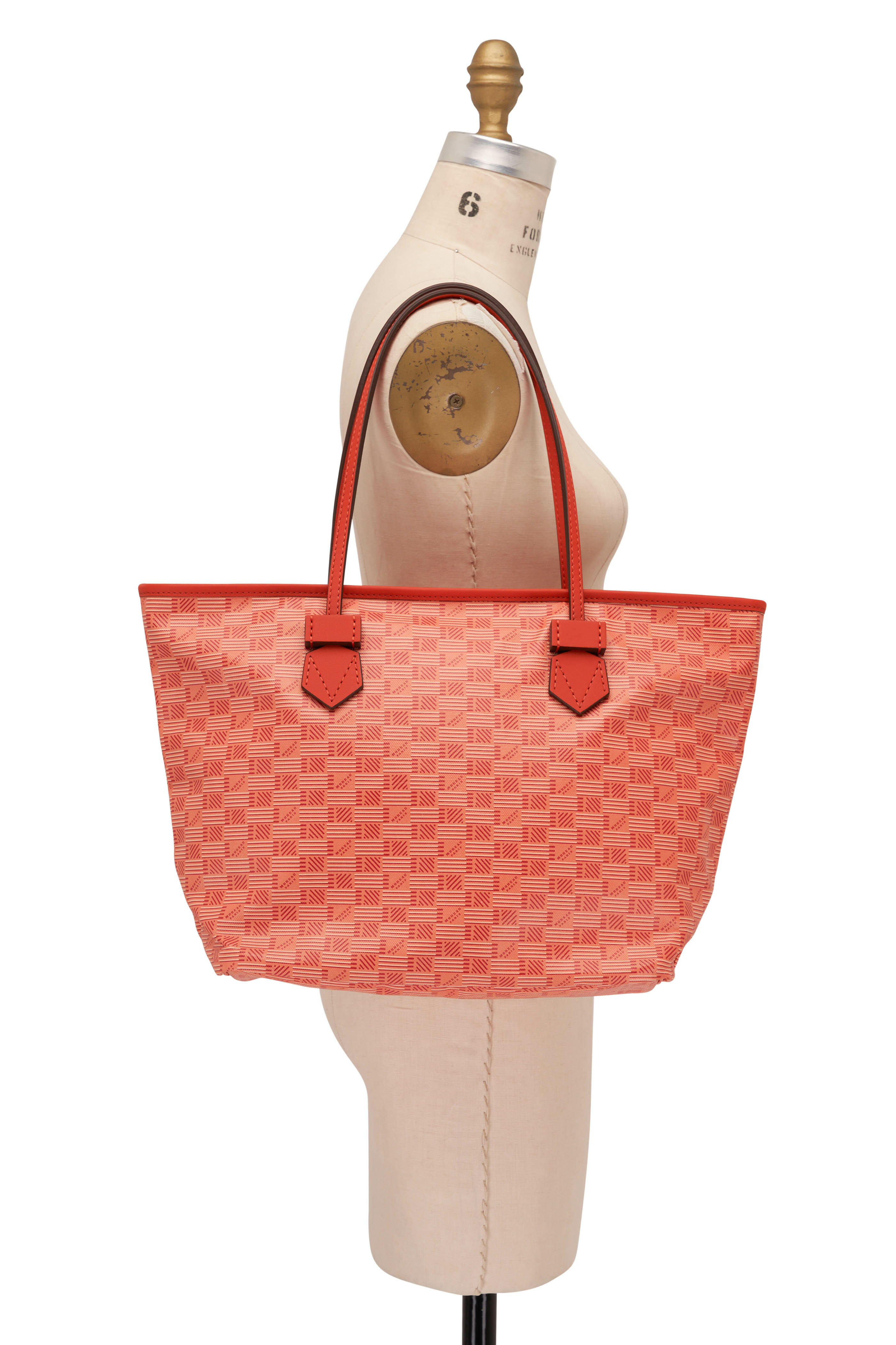 Coated canvas; Trim: EcoCalf leather. Dual top handles. Top zip closure. Single compartment; interior wall pocket. Canvas lining. Made in Italy. Width: 17”. Height: 11”. Depth: 6 ½”. Handle drop: 8 ½”.