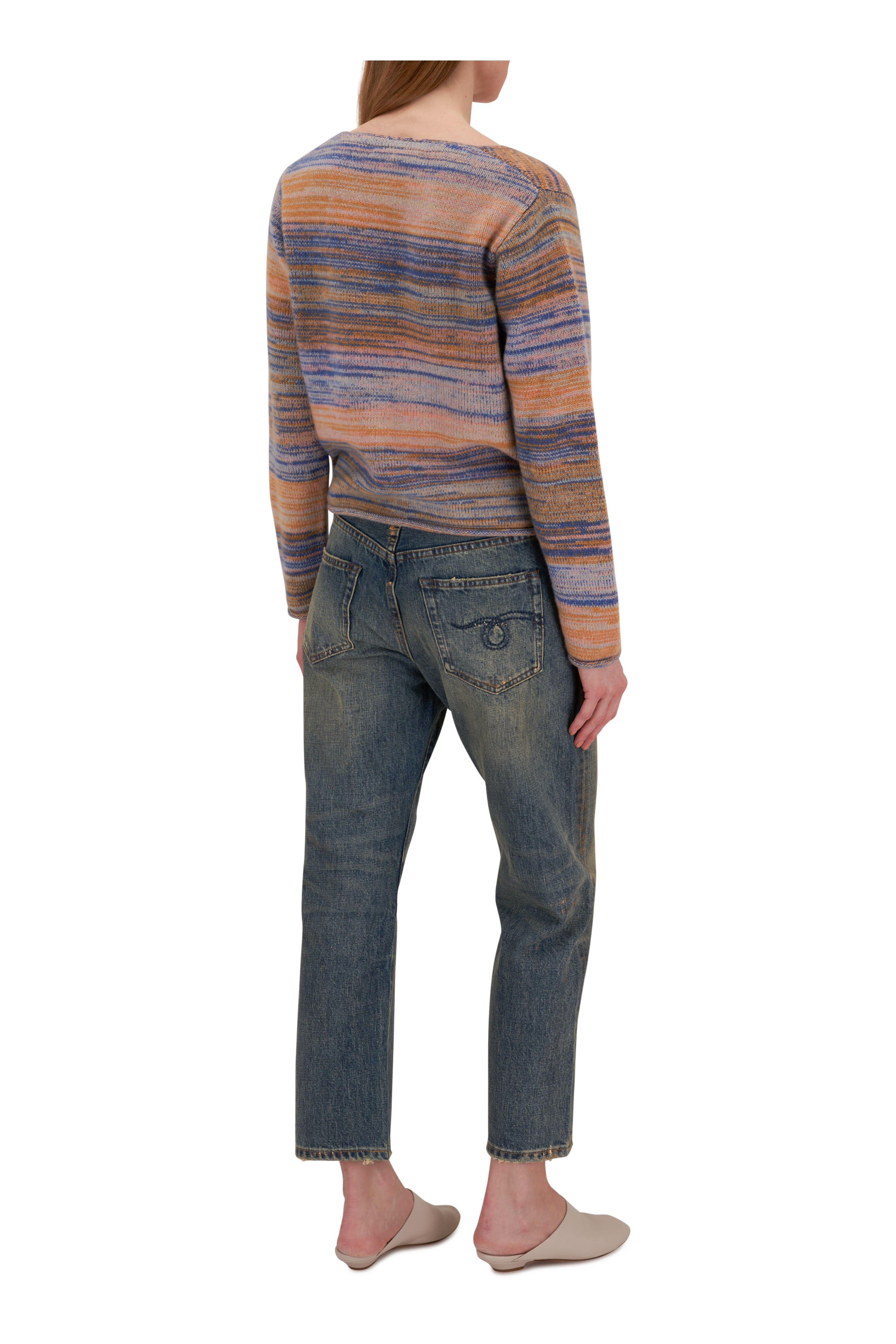 Scoop neckline. Front button placket. Rolled cuffs and hem. Made in the USA. Color: Cosmic Stripe. 21" shoulder to hem (size Small). 100% cashmere. Dry clean.