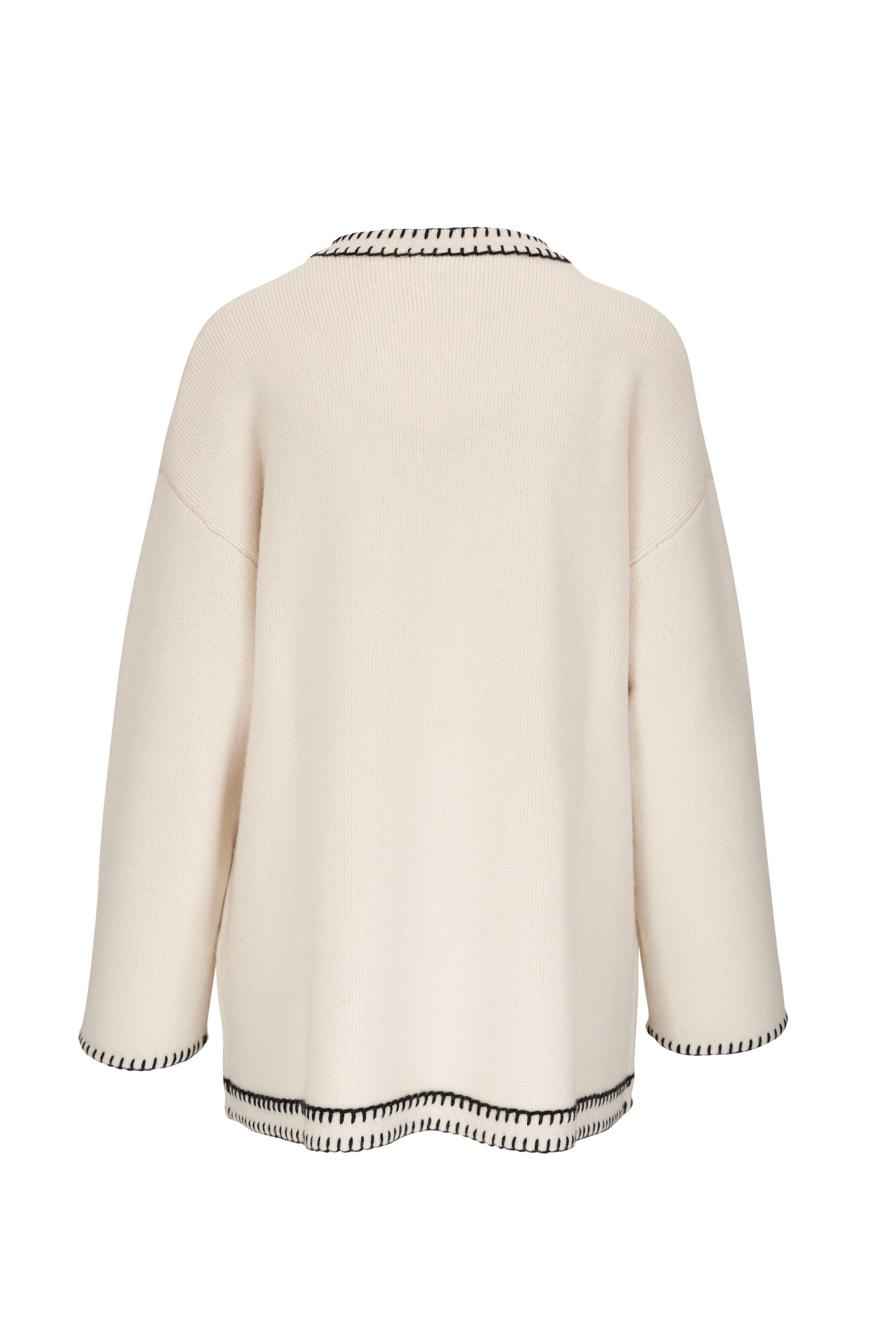 Round neckline. Front button placket. Lower patch pockets. Imported. 100% cashmere. Hand wash.