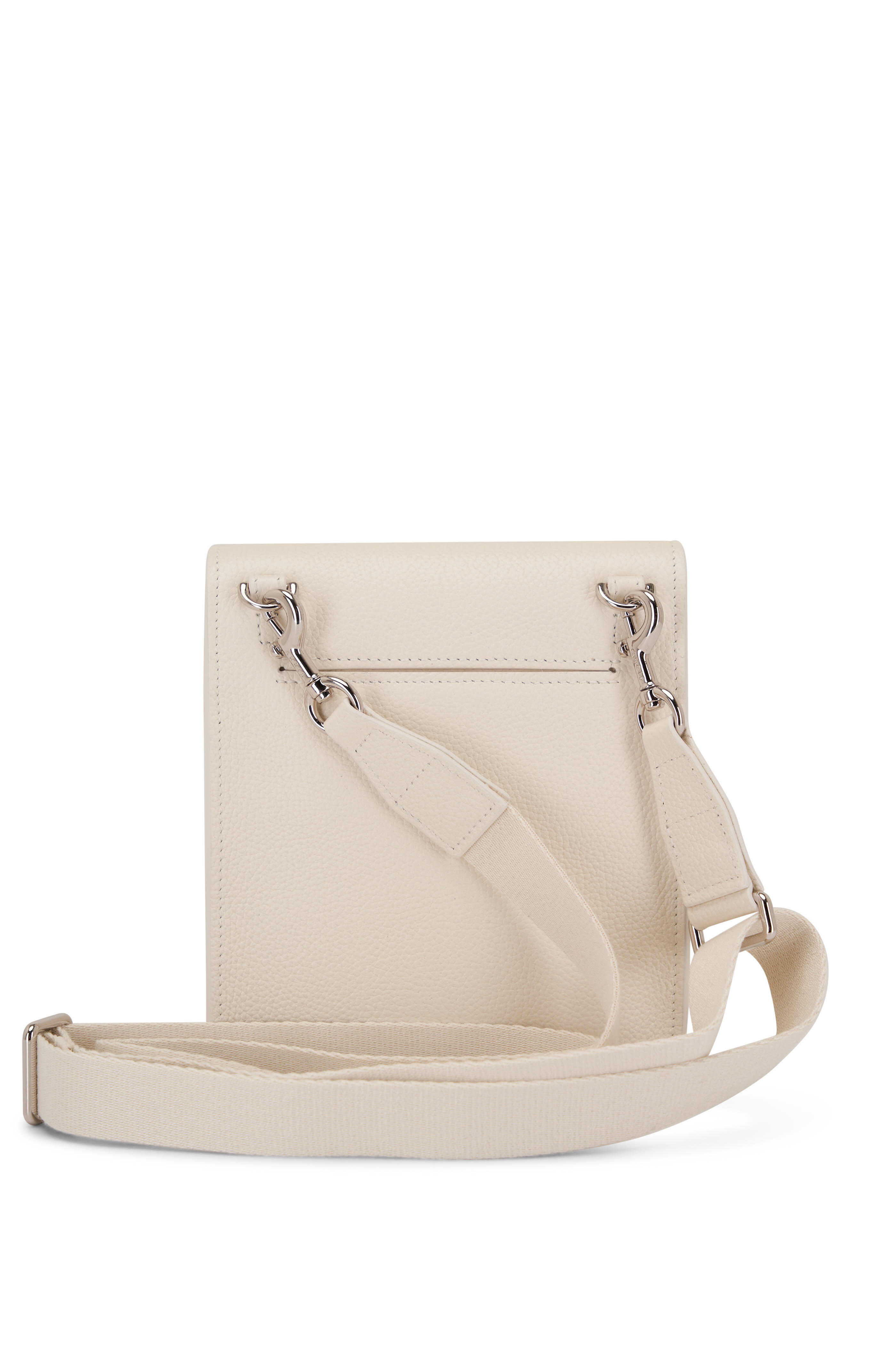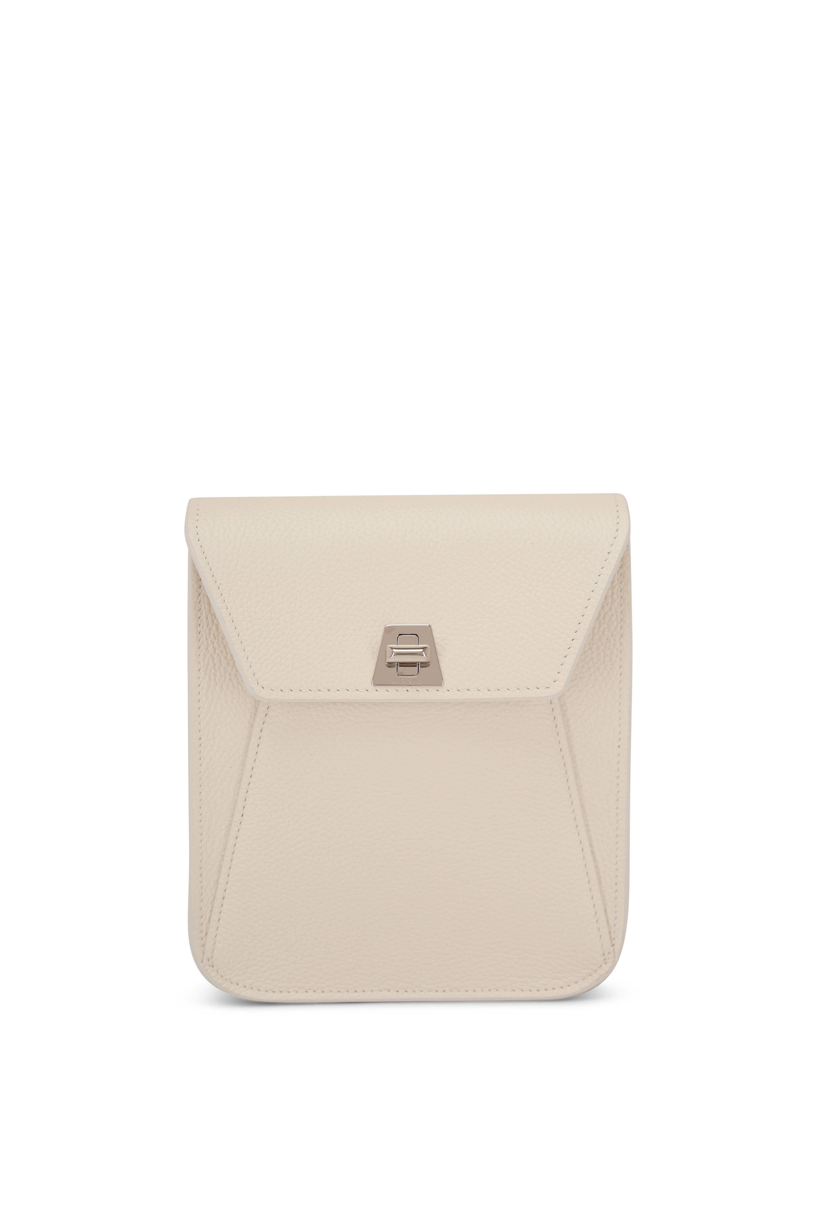 Grained leather. Detachable, adjustable grosgrain shoulder strap. Flap with latch closure. Under flap pocket. Exterior back wall pocket. Single compartment. Single interior wall pocket. Leather lining. Made in Italy. Width: 5 ½". Height: 6 ½". Depth: 2".