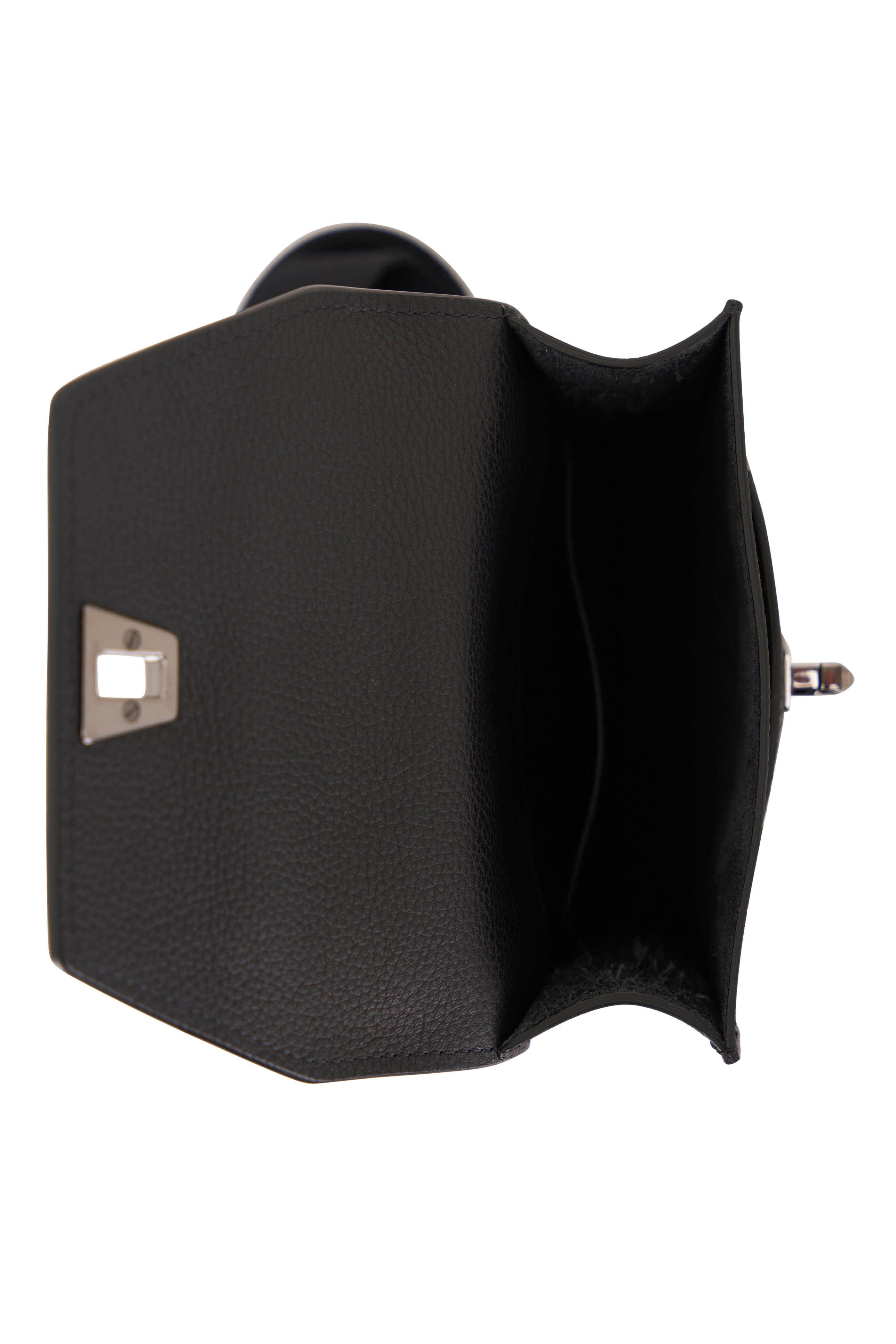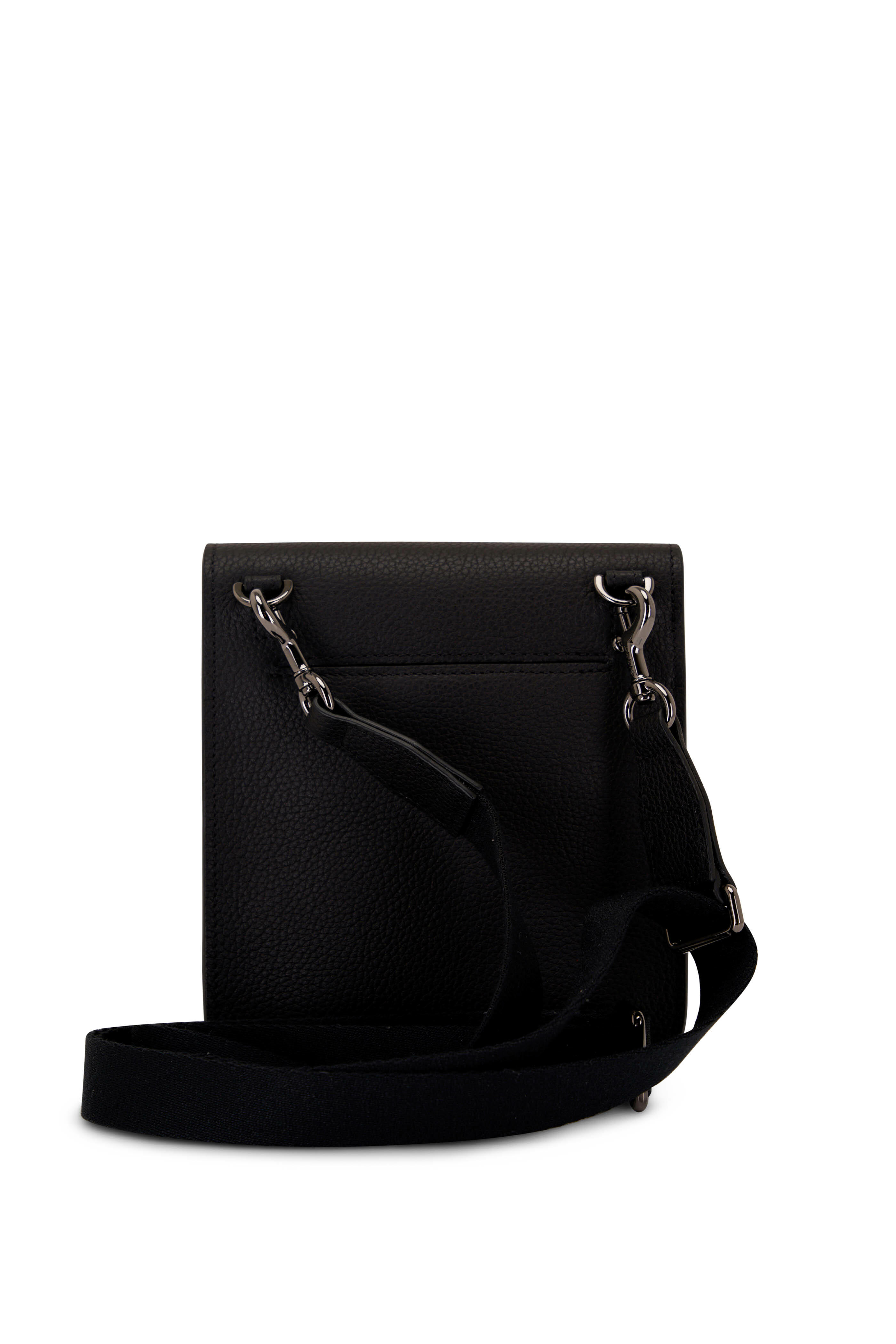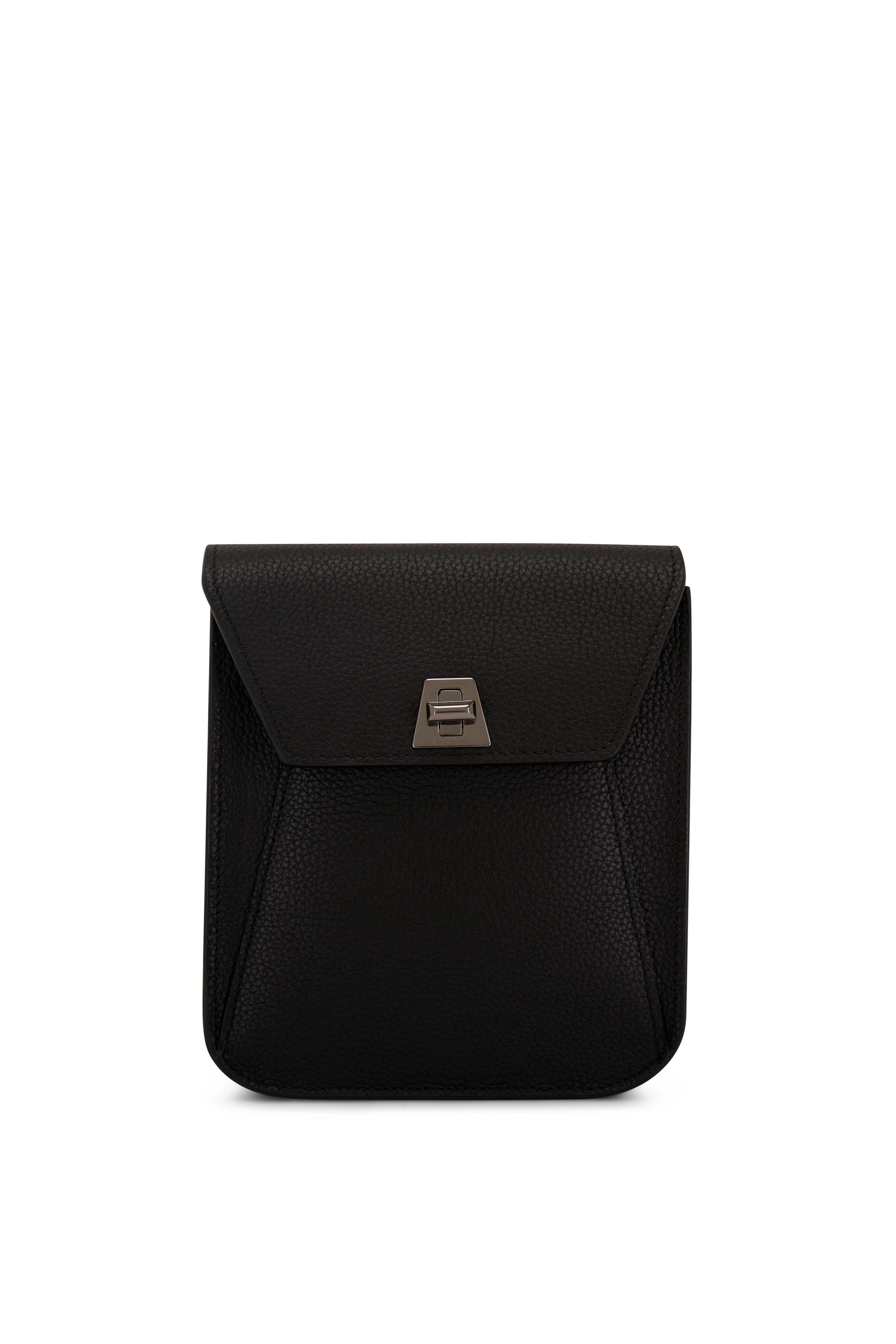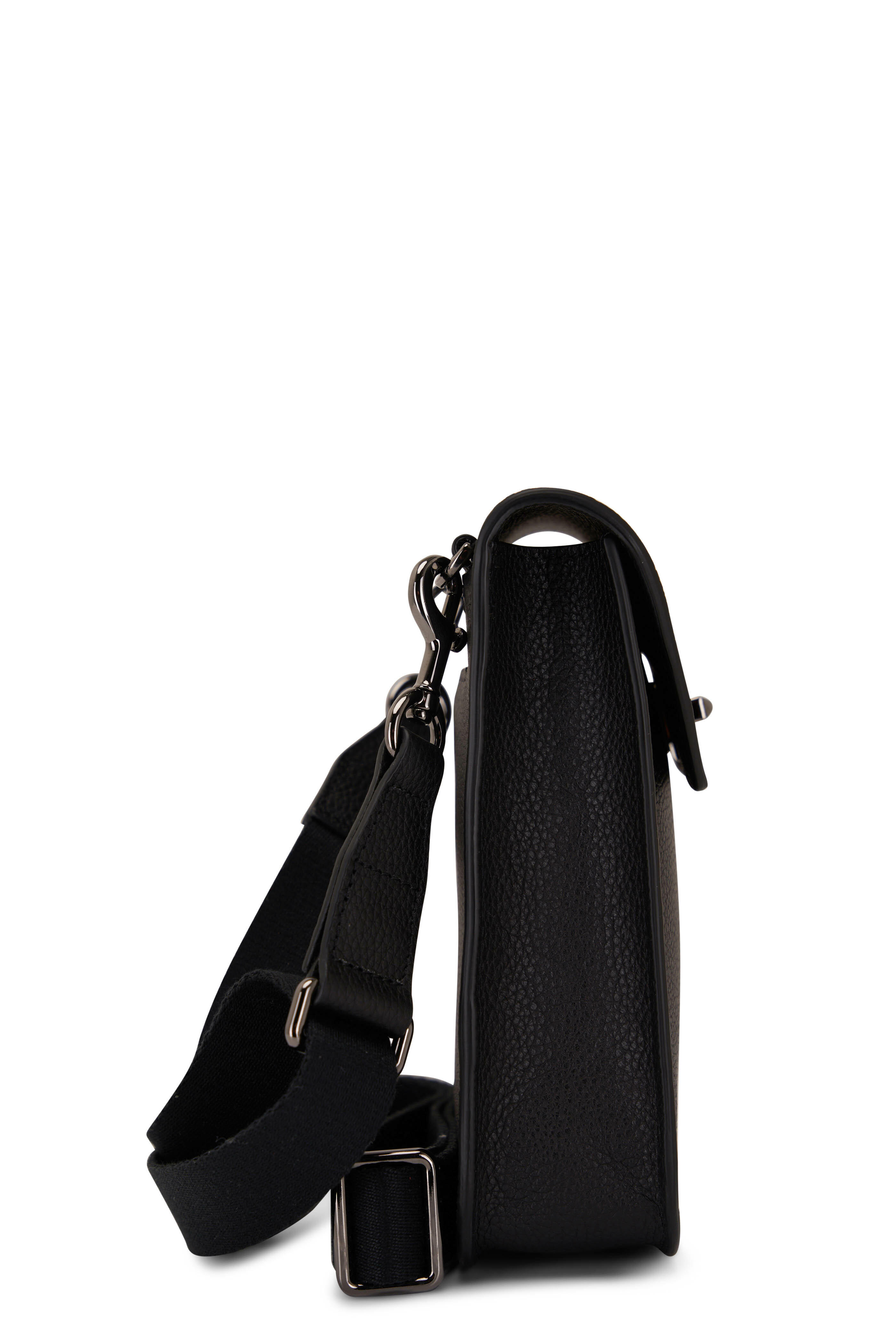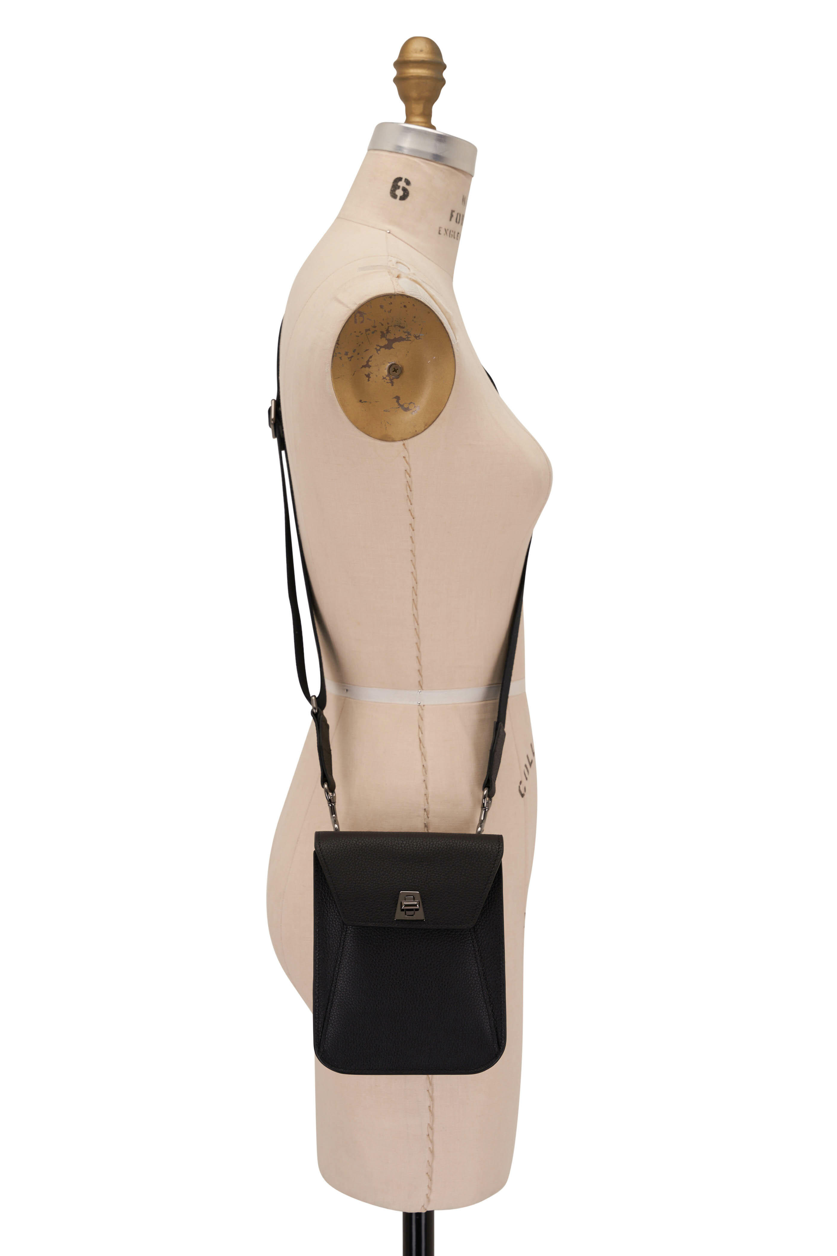 Grained leather. Detachable, adjustable grosgrain shoulder strap. Flap with latch closure. Under flap pocket. Exterior back wall pocket. Single compartment. Single interior wall pocket. Leather lining. Made in Italy. Width: 5 ½". Height: 6 ½". Depth: 2".