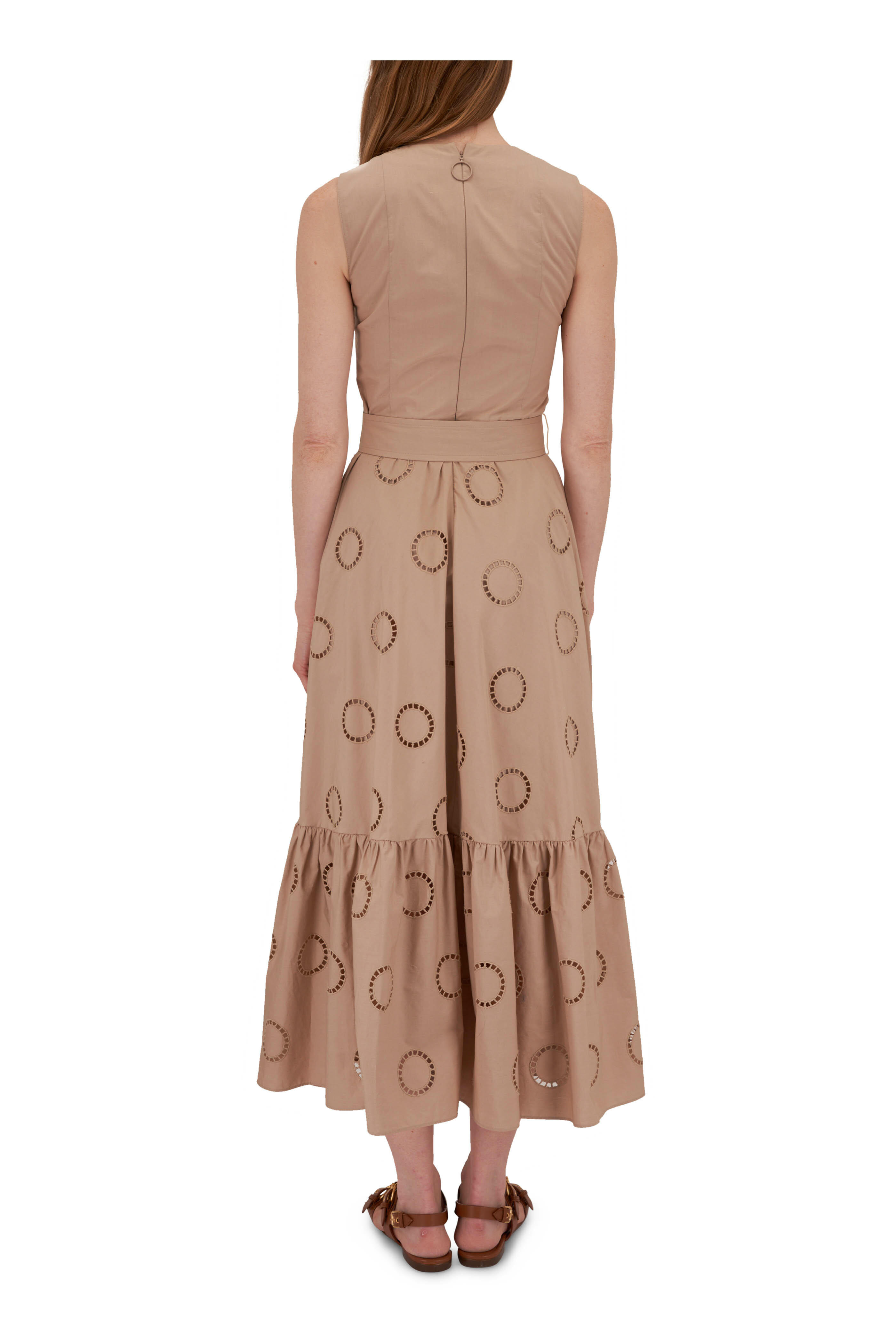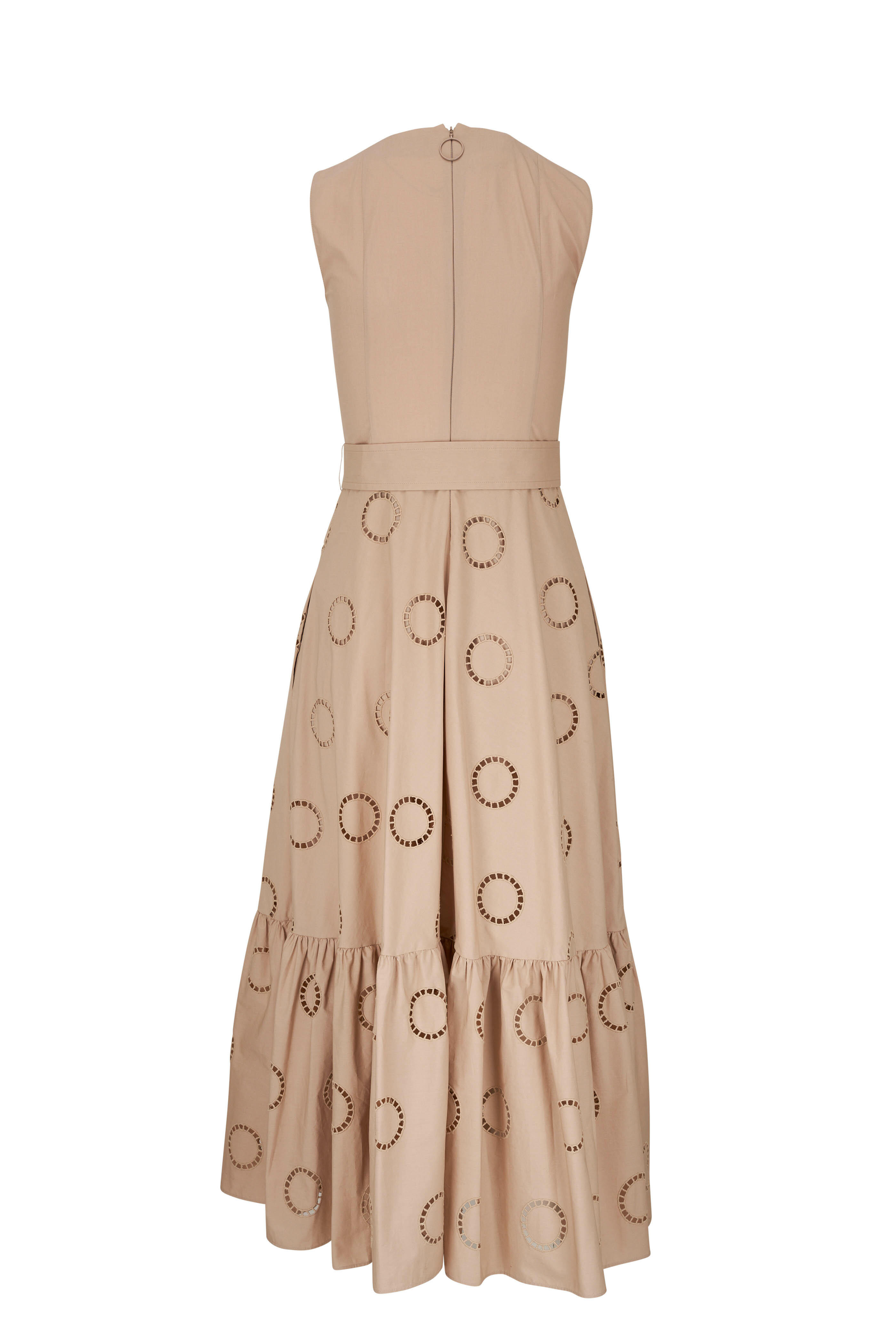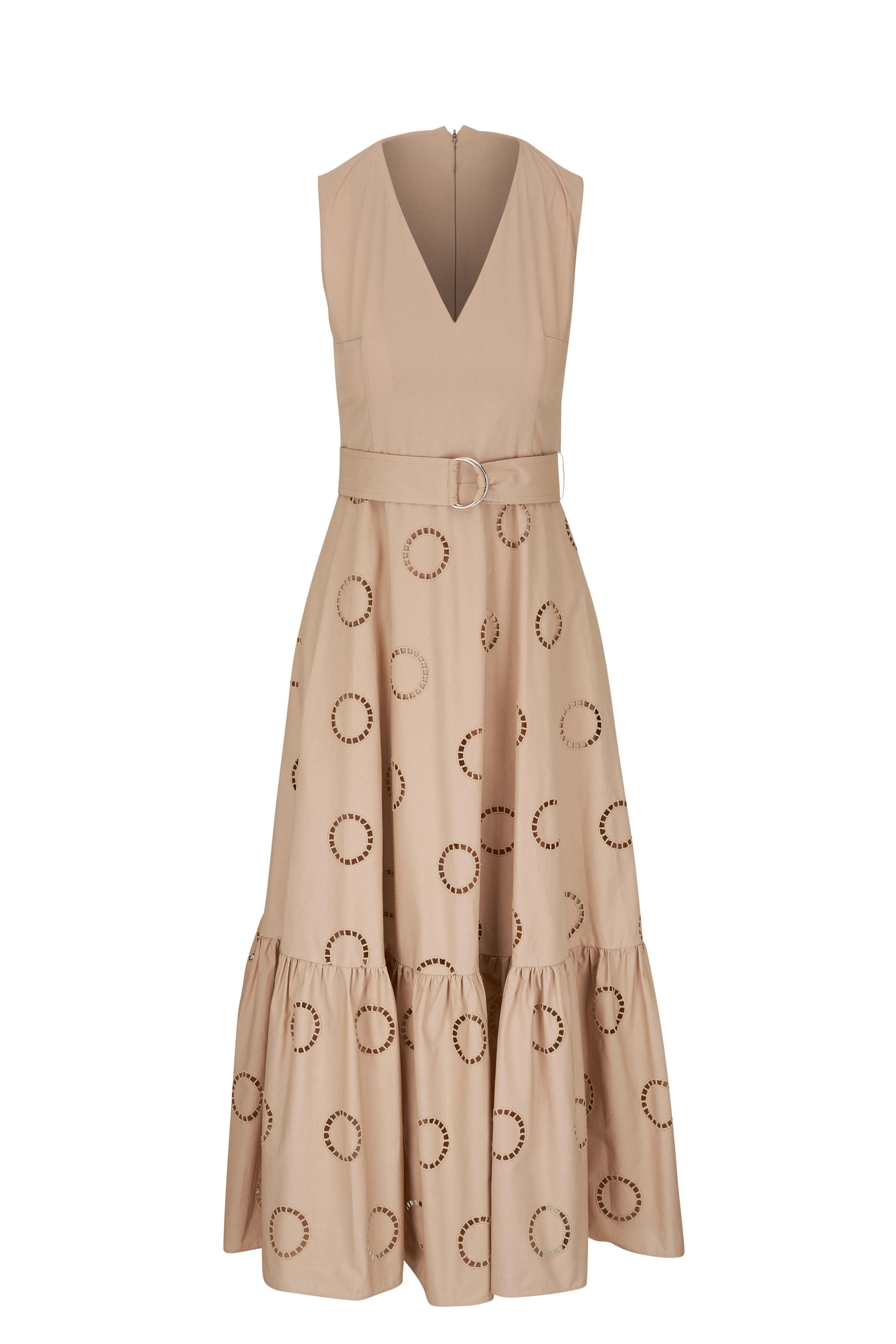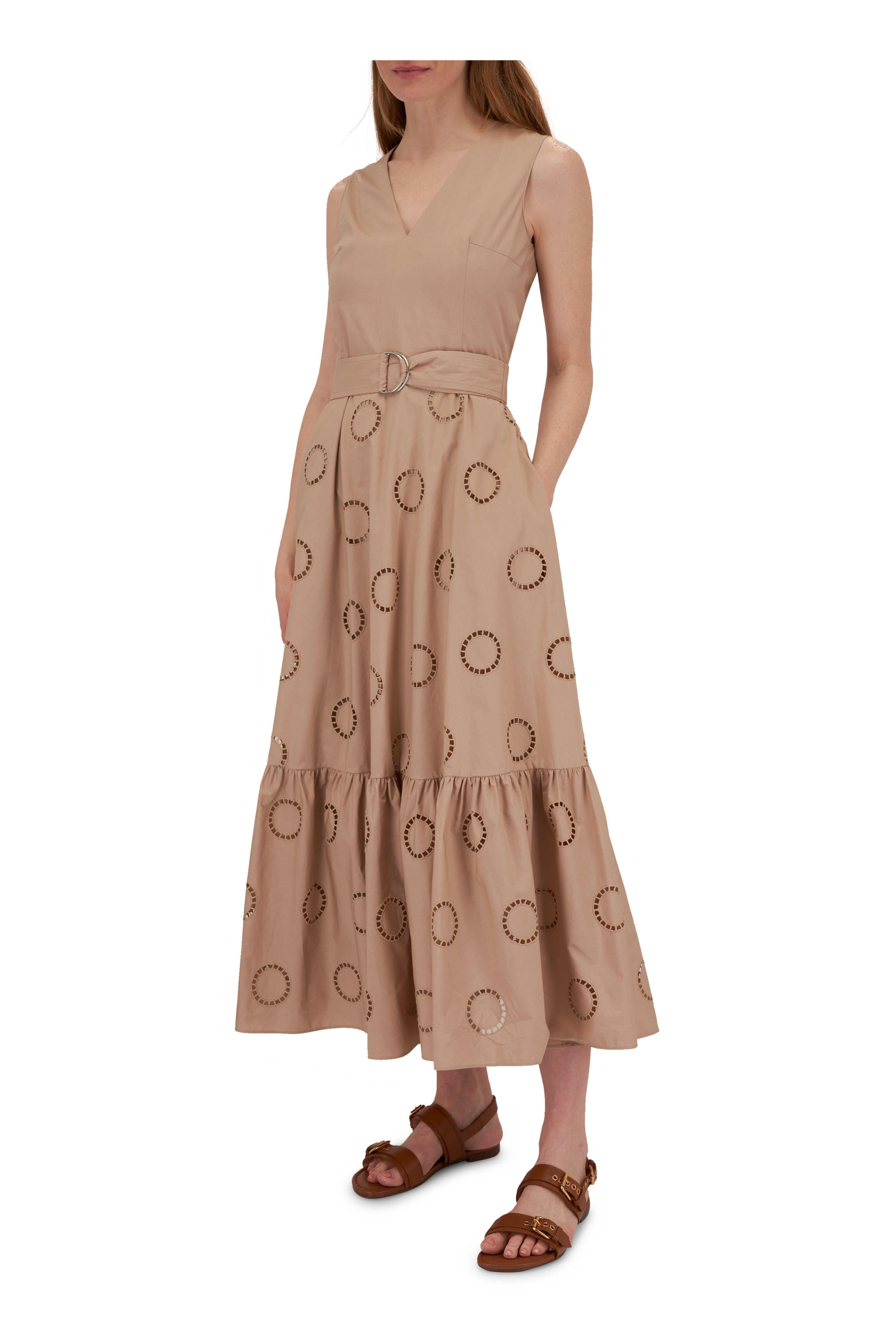 Removable self d-ring belt; concealed back zip. On-seam pockets. Flounce hem. Imported. Midi length. 100% cotton. Dry clean.