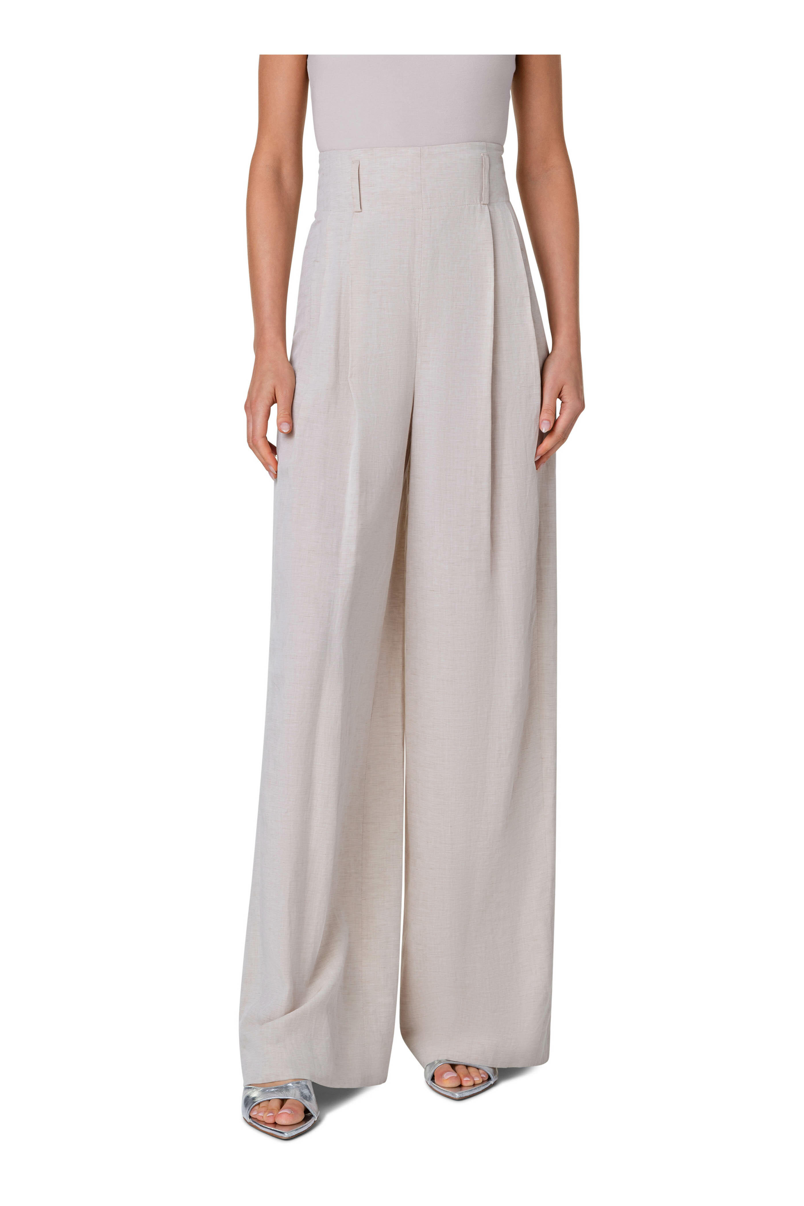 Concealed side zip. Side seam pockets. Banded waist; belt loops. Pintuck pleated front detail. Imported. High waist. Relaxed fit. 76% viscose, 24% linen. Dry clean.