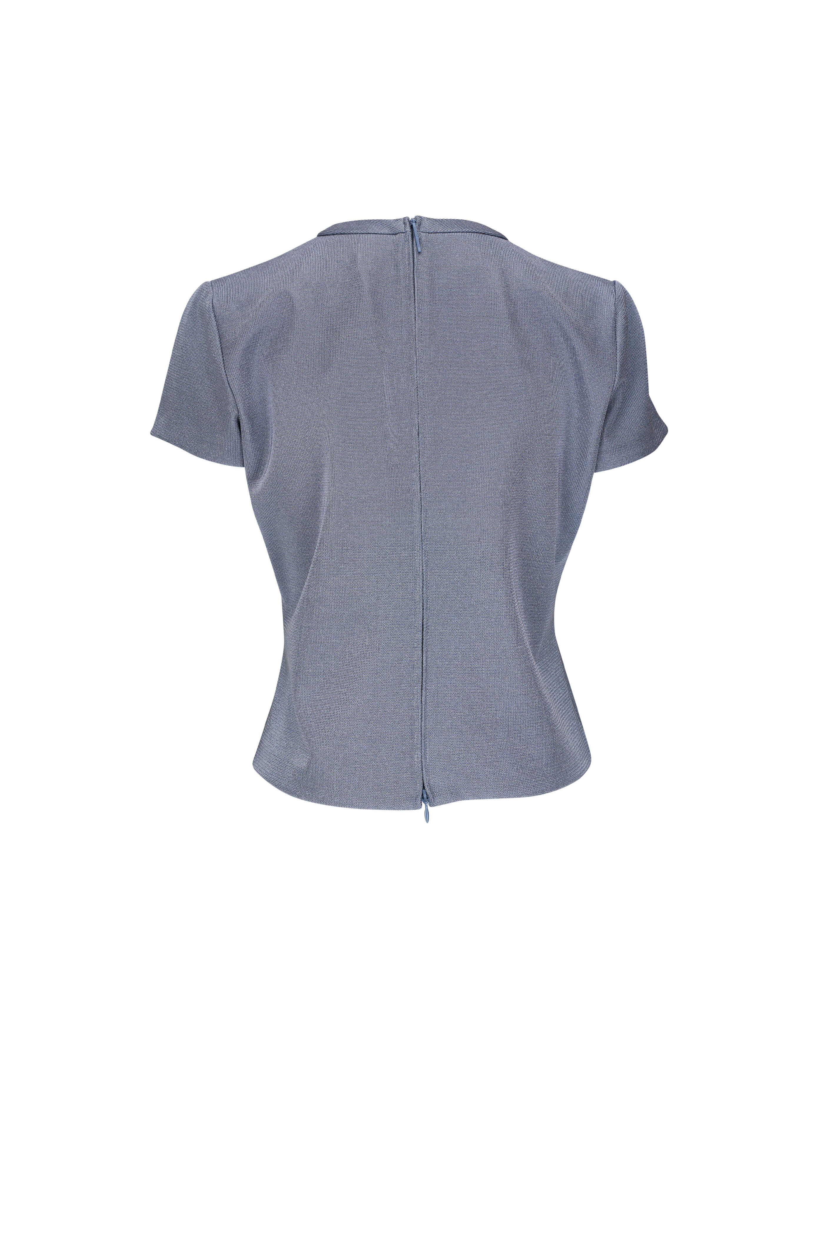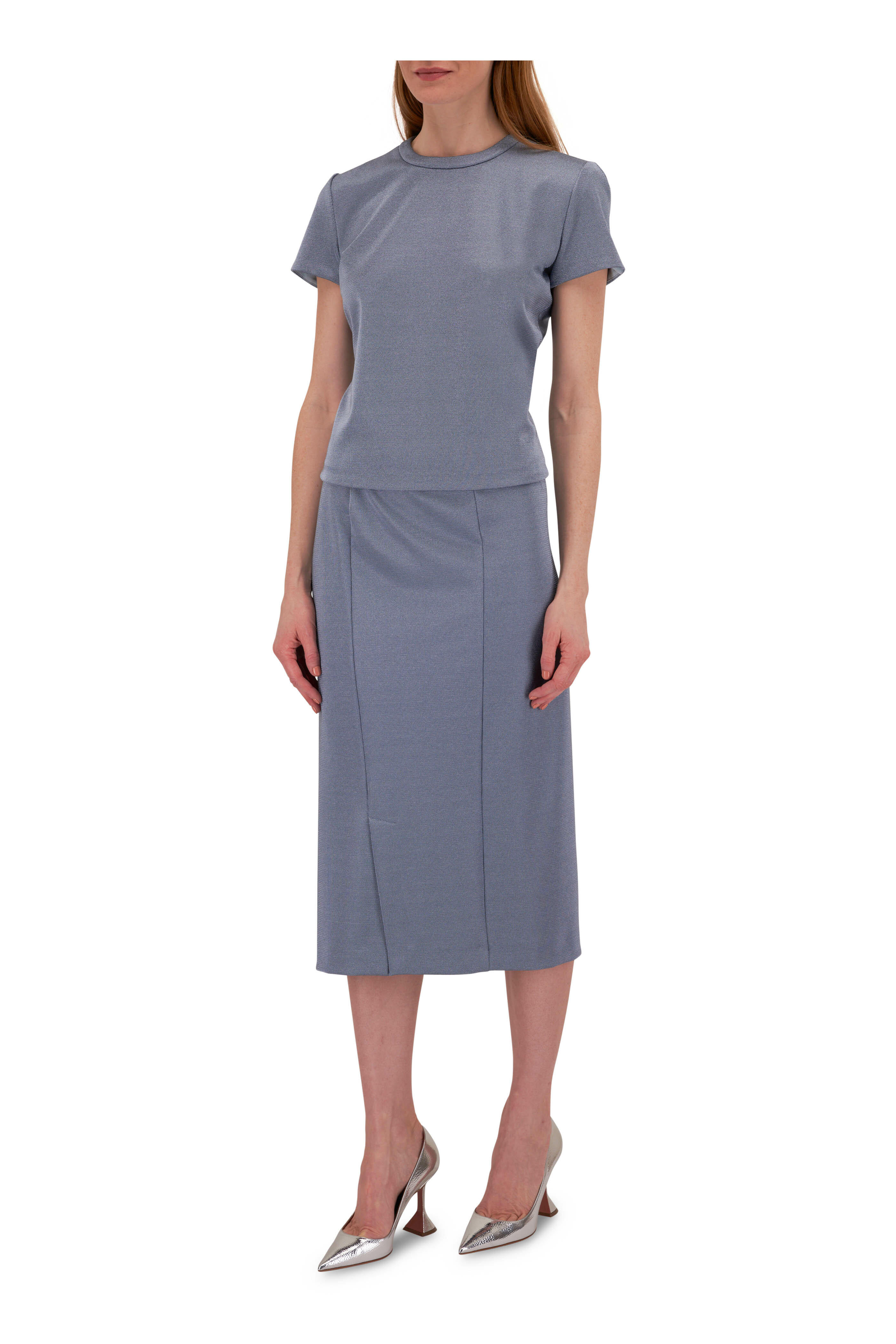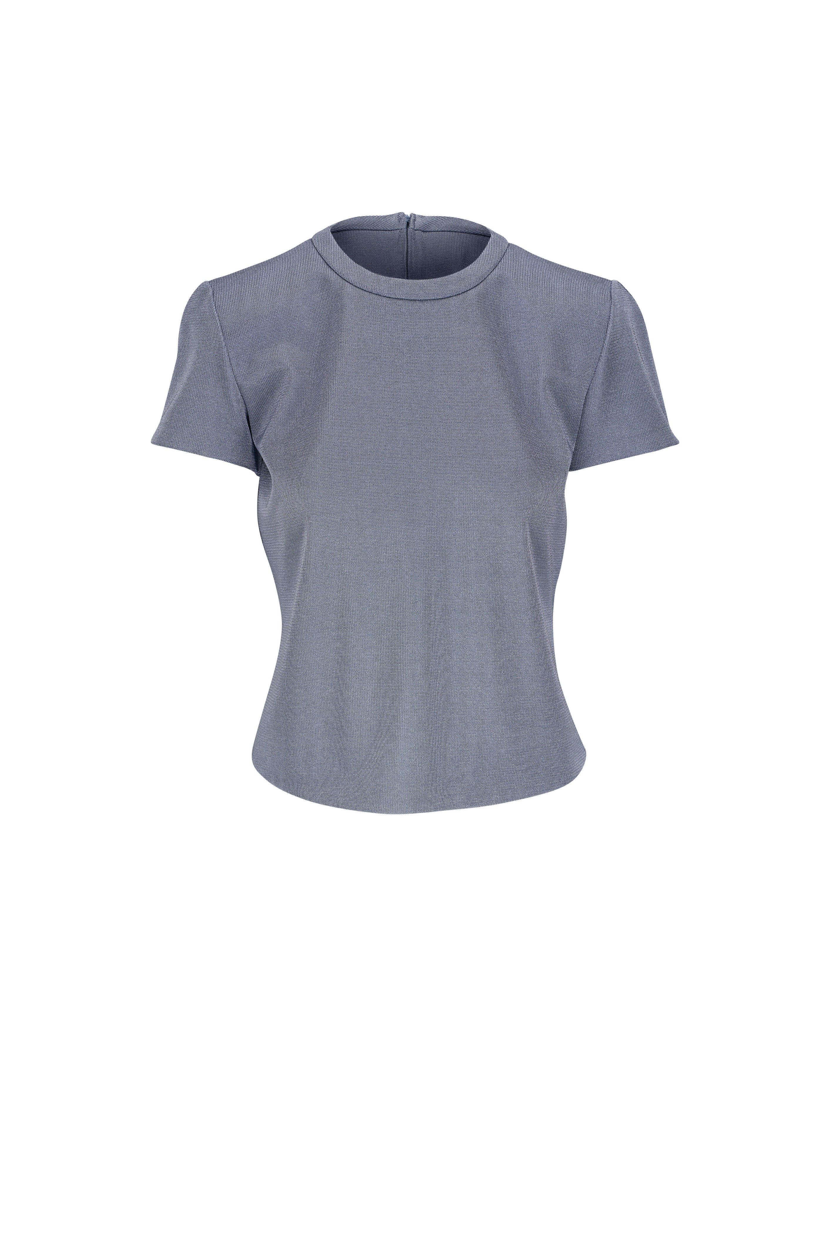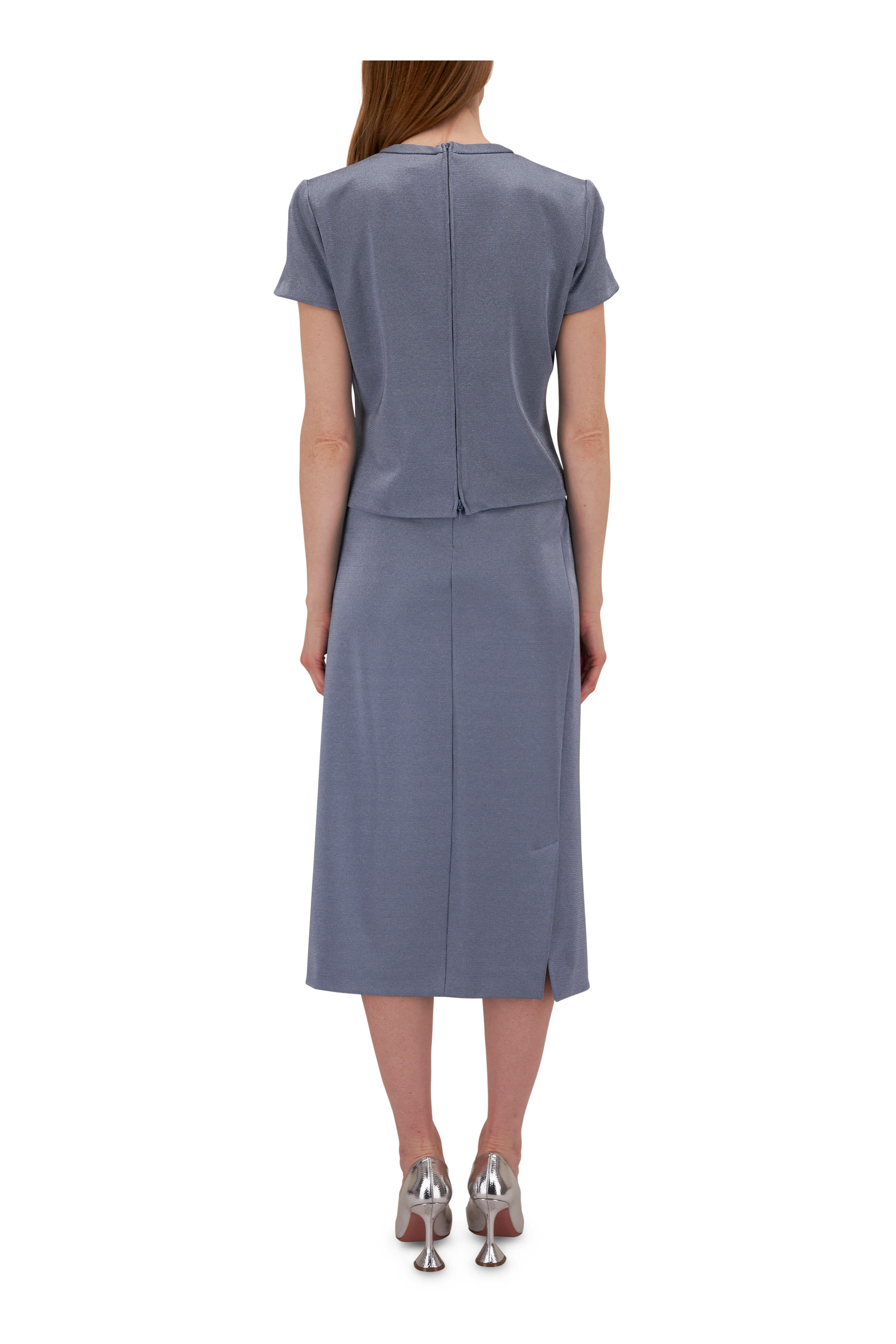 Round neckline. Concealed back zip. Made in Italy. 72% viscose, 28% metallized fiber; fully lined. Dry clean.