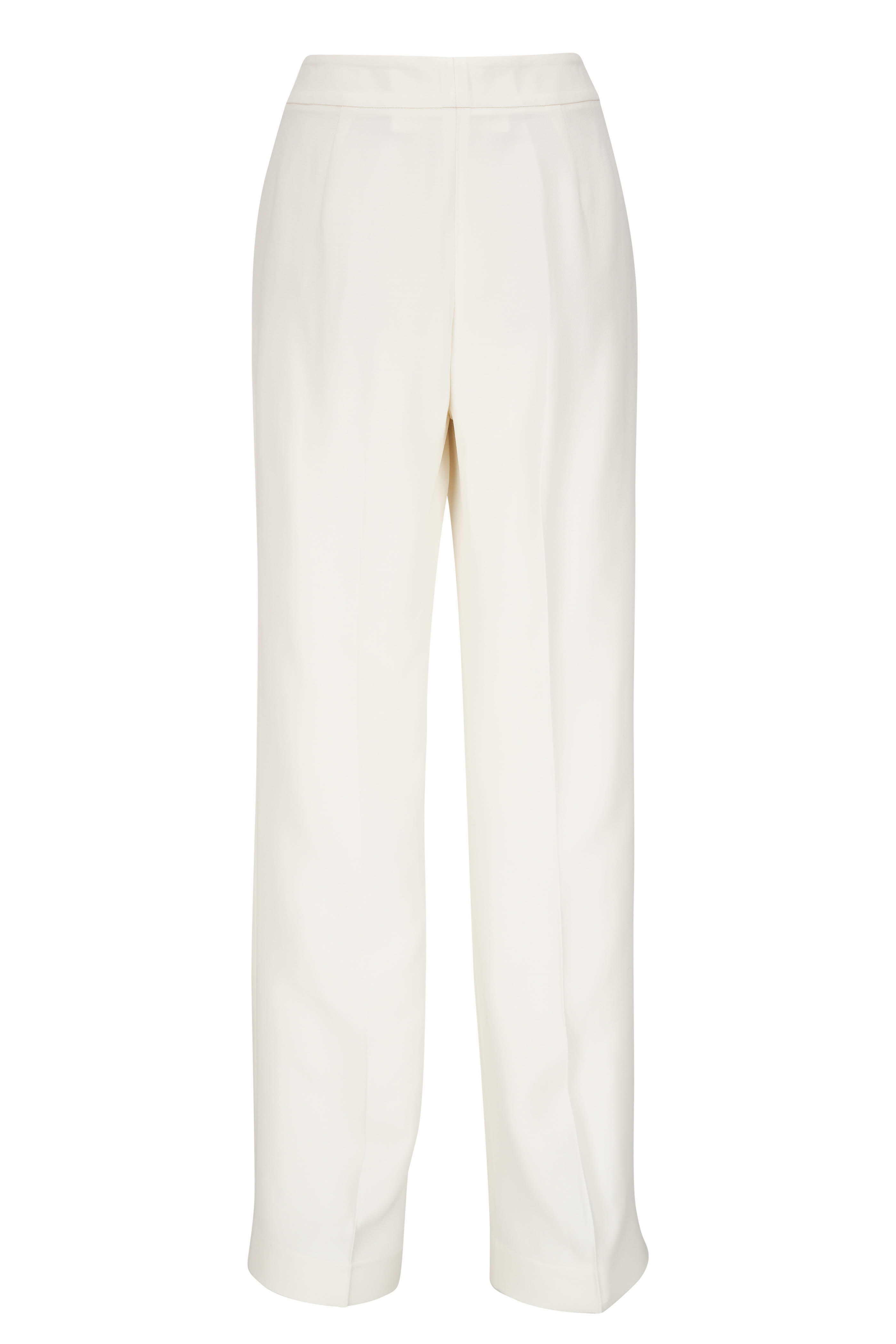 Zip fly; double hook-&-bar closure. Banded waist. Imported. Rise: 10". Inseam: 32". 70% wool, 30% silk. Dry clean.