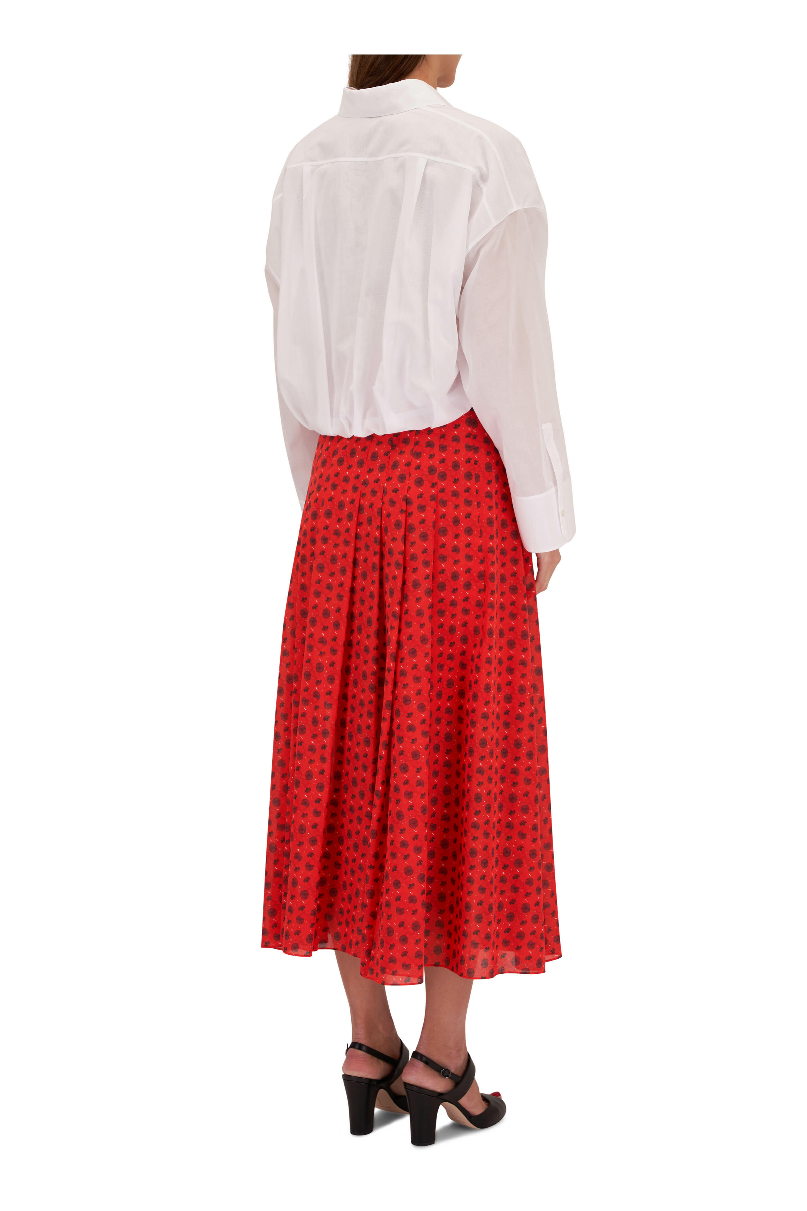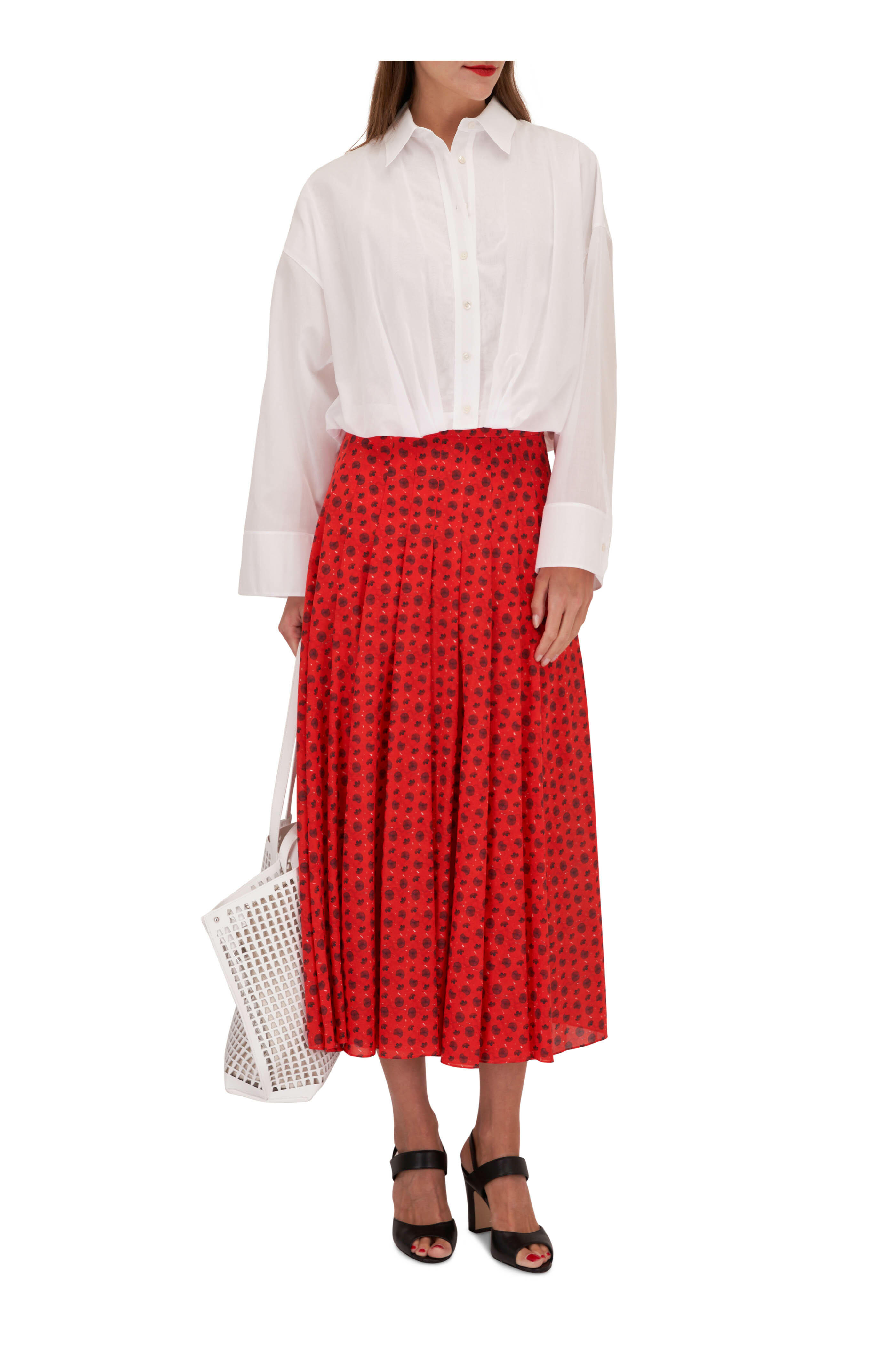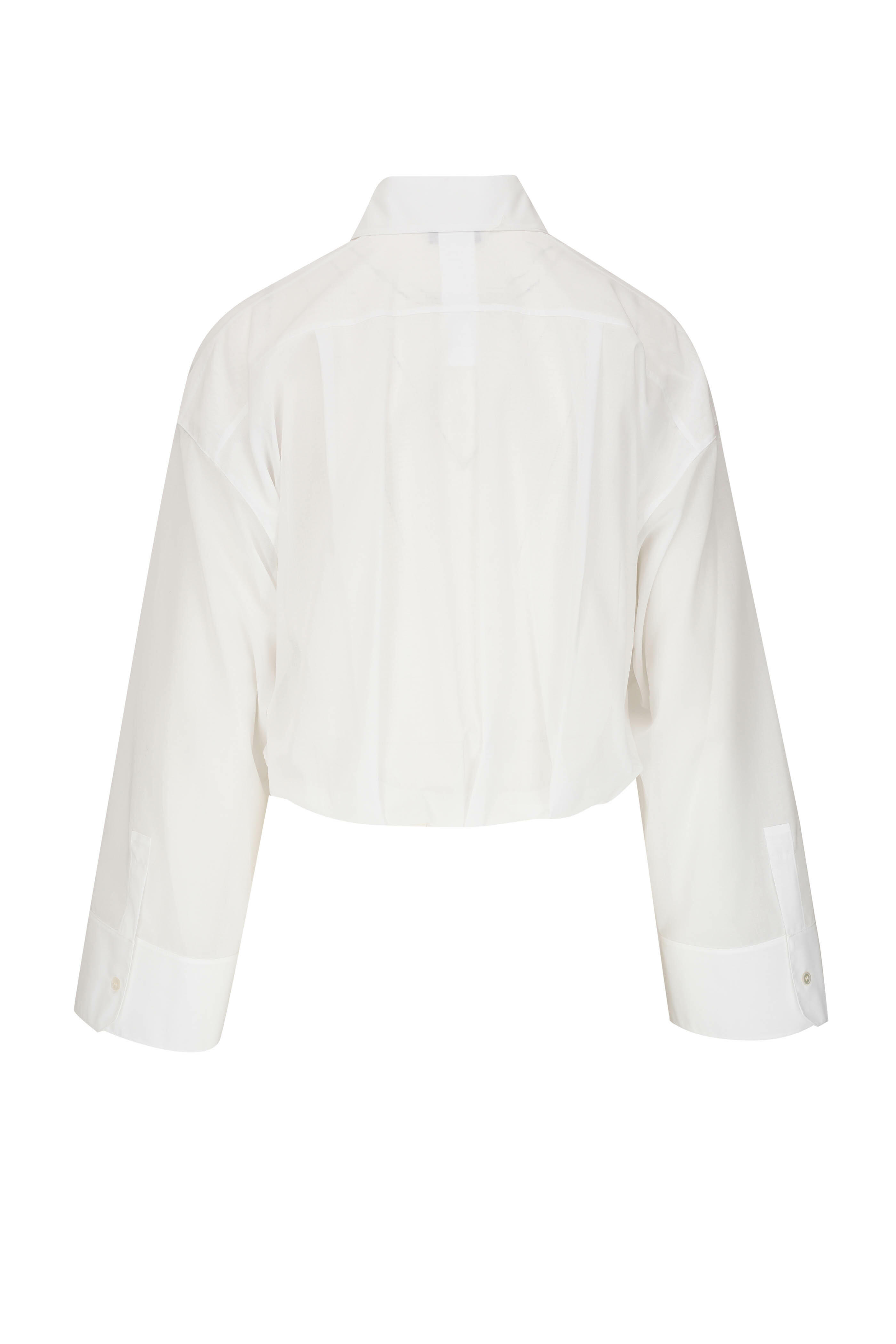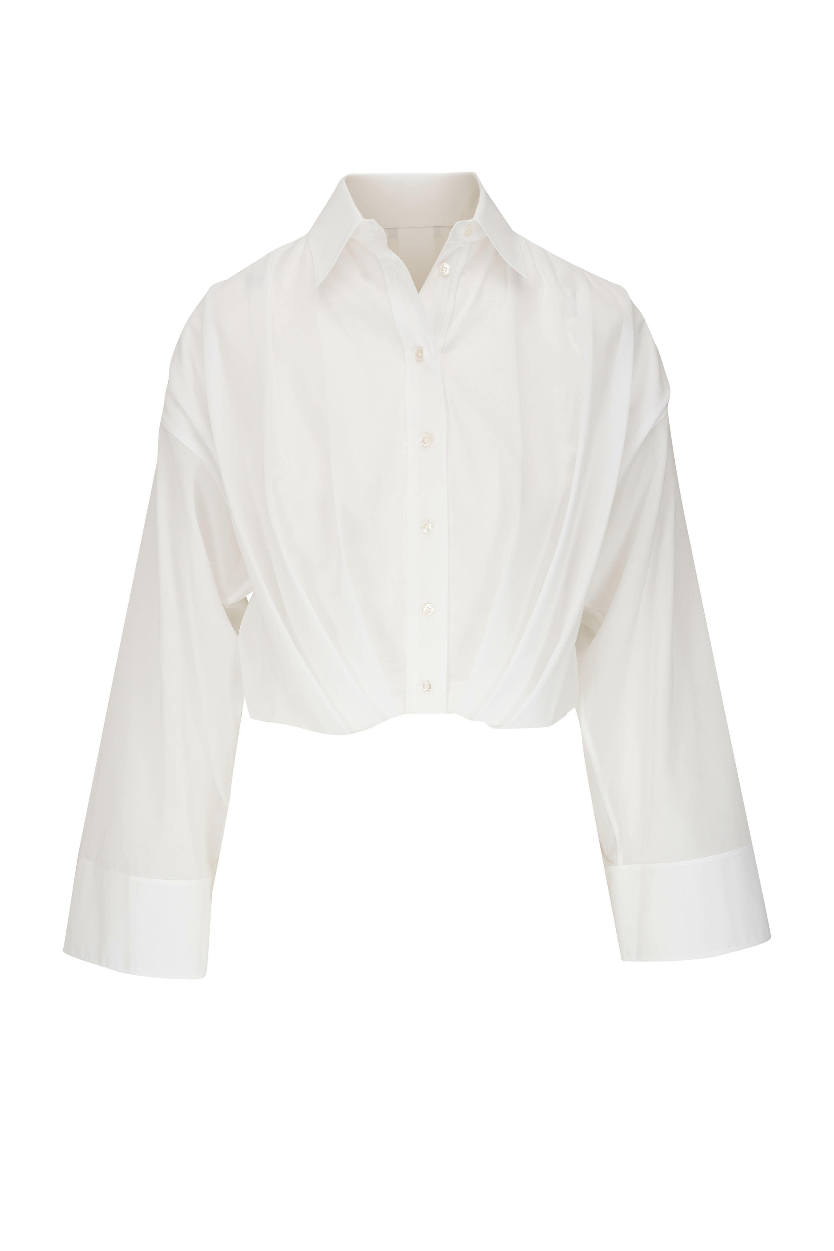 Point collar. Front button placket. Single button mitered cuffs. Pleated hem. Imported. Shoulder to hem 17". 100% cotton. Dry clean.