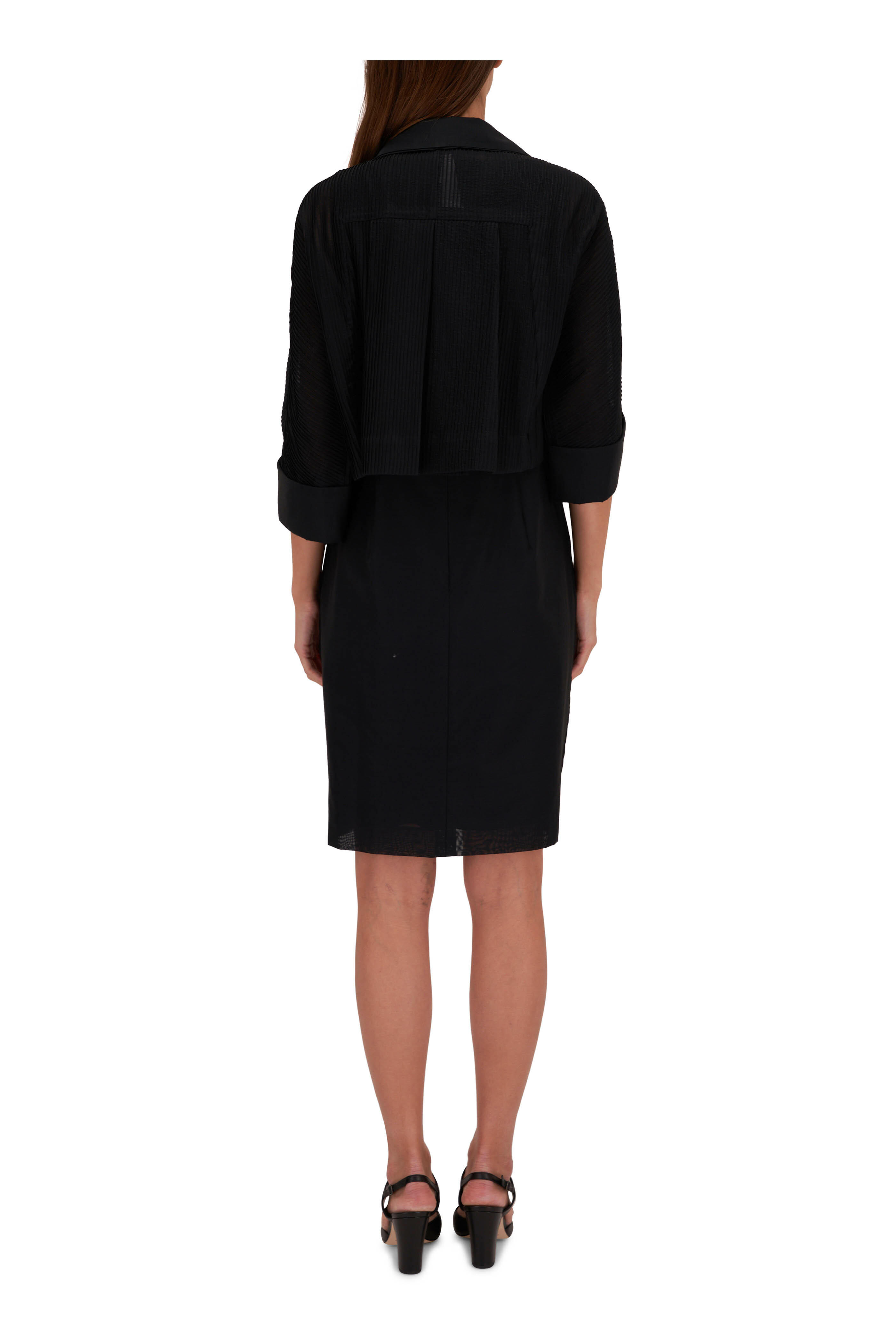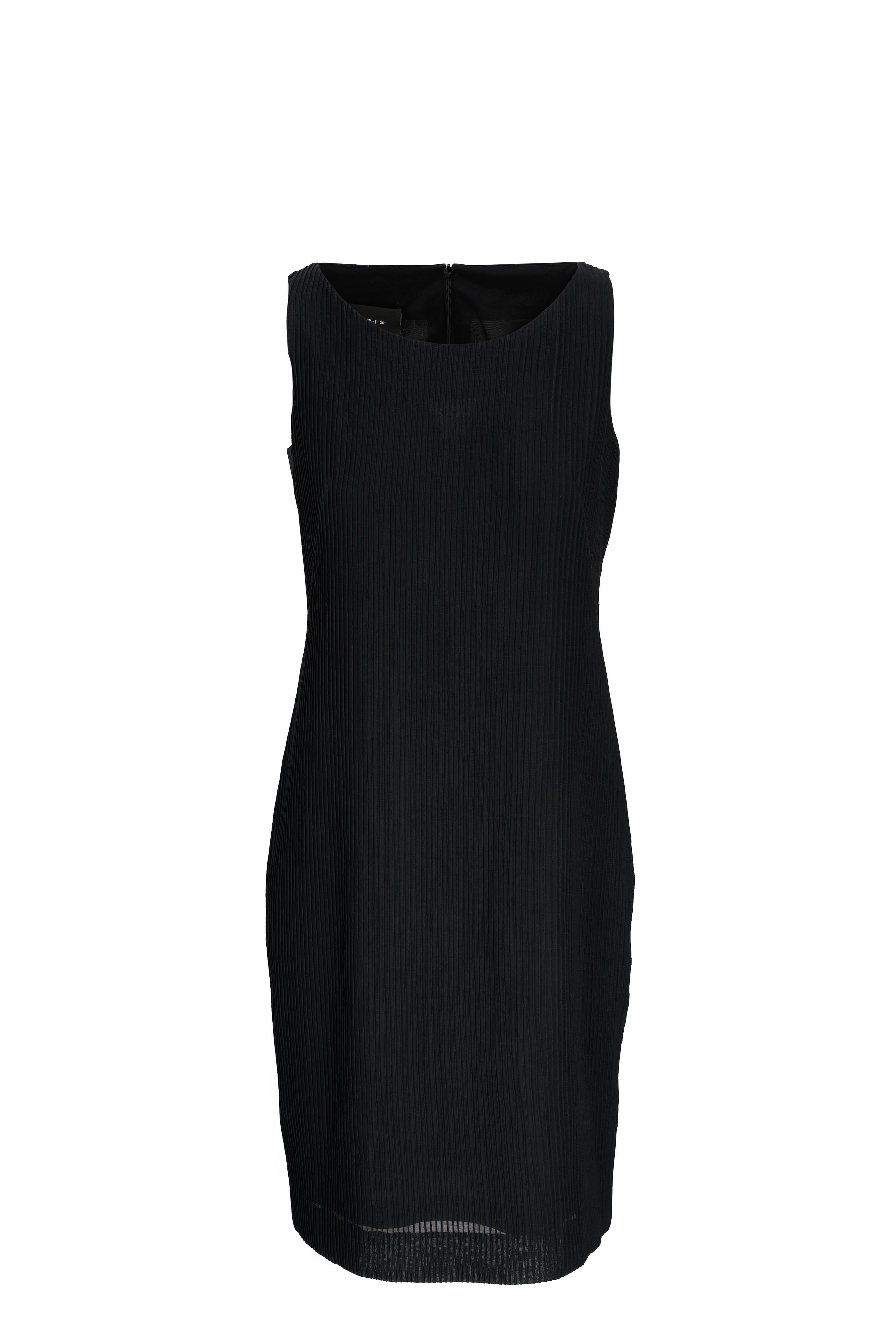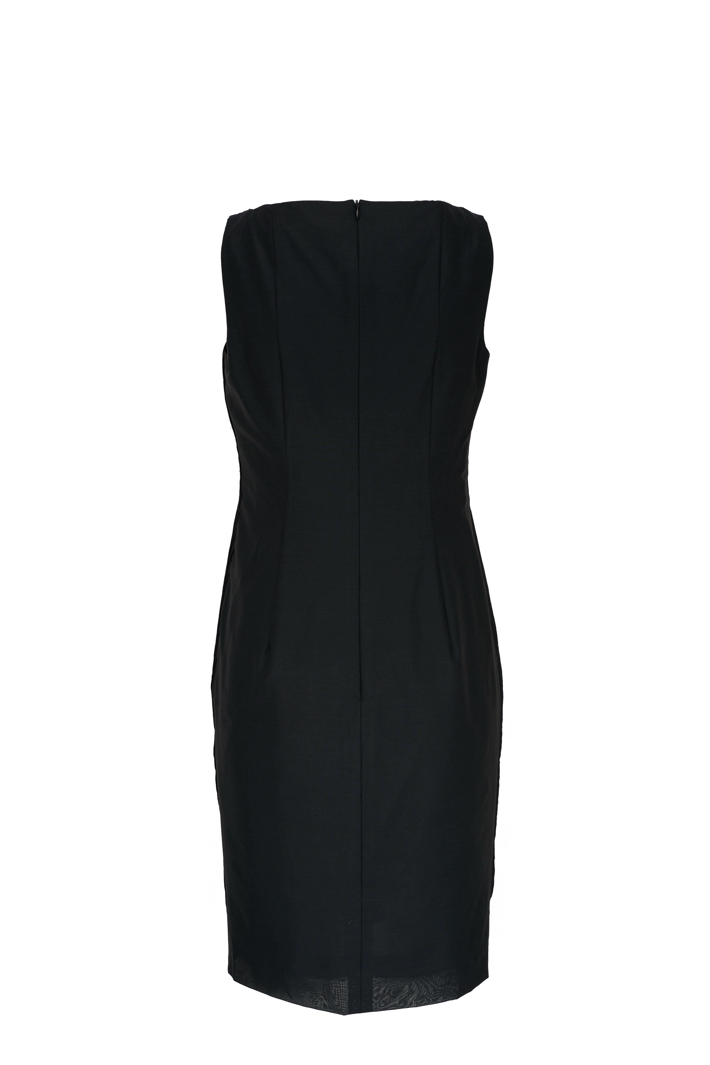 Round neckline. Concealed back zip. Straight hem. Imported. 38" shoulder to hem. 96% silk, 4% elastane. Dry clean.