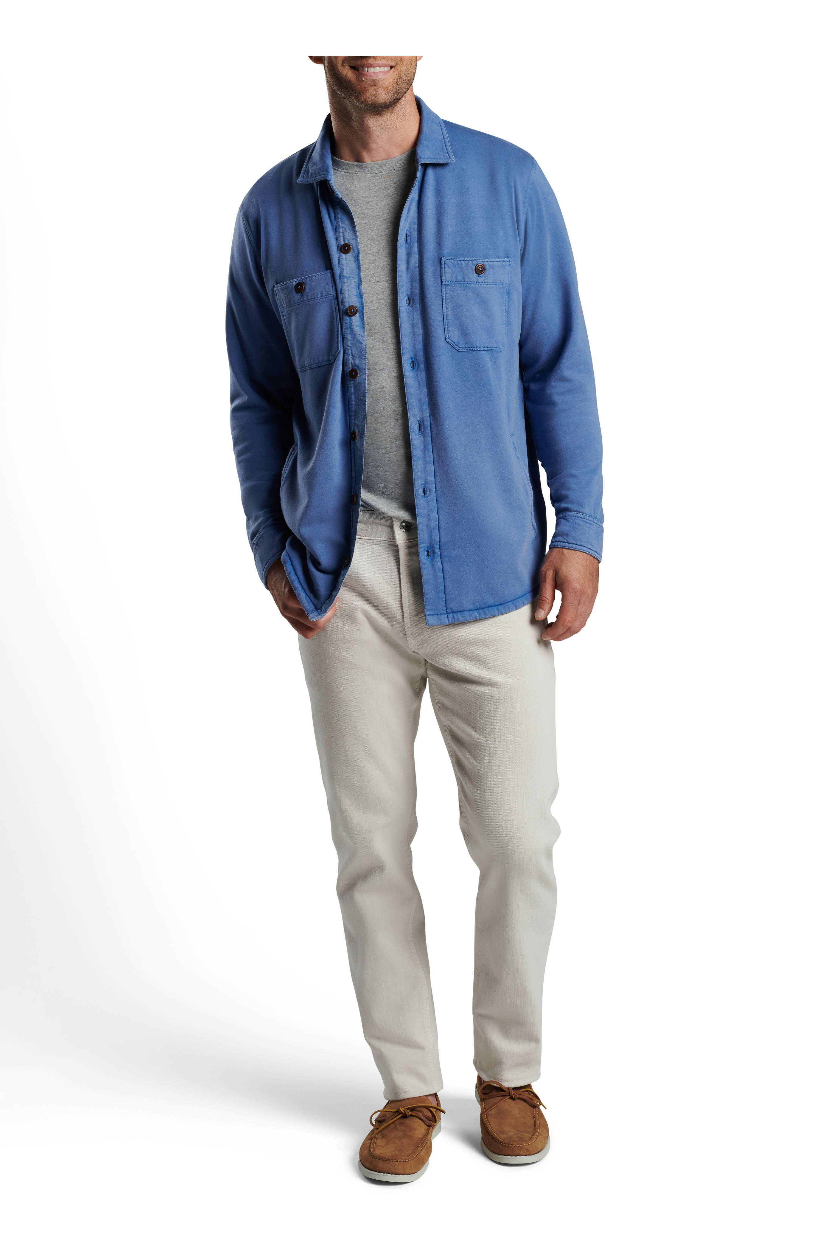 Spread collar. Front button placket. Chest patch pockets; lower side pockets. Single button barrel cuffs. Imported. 53% cotton, 43% modal, 4% spandex. Machine wash.