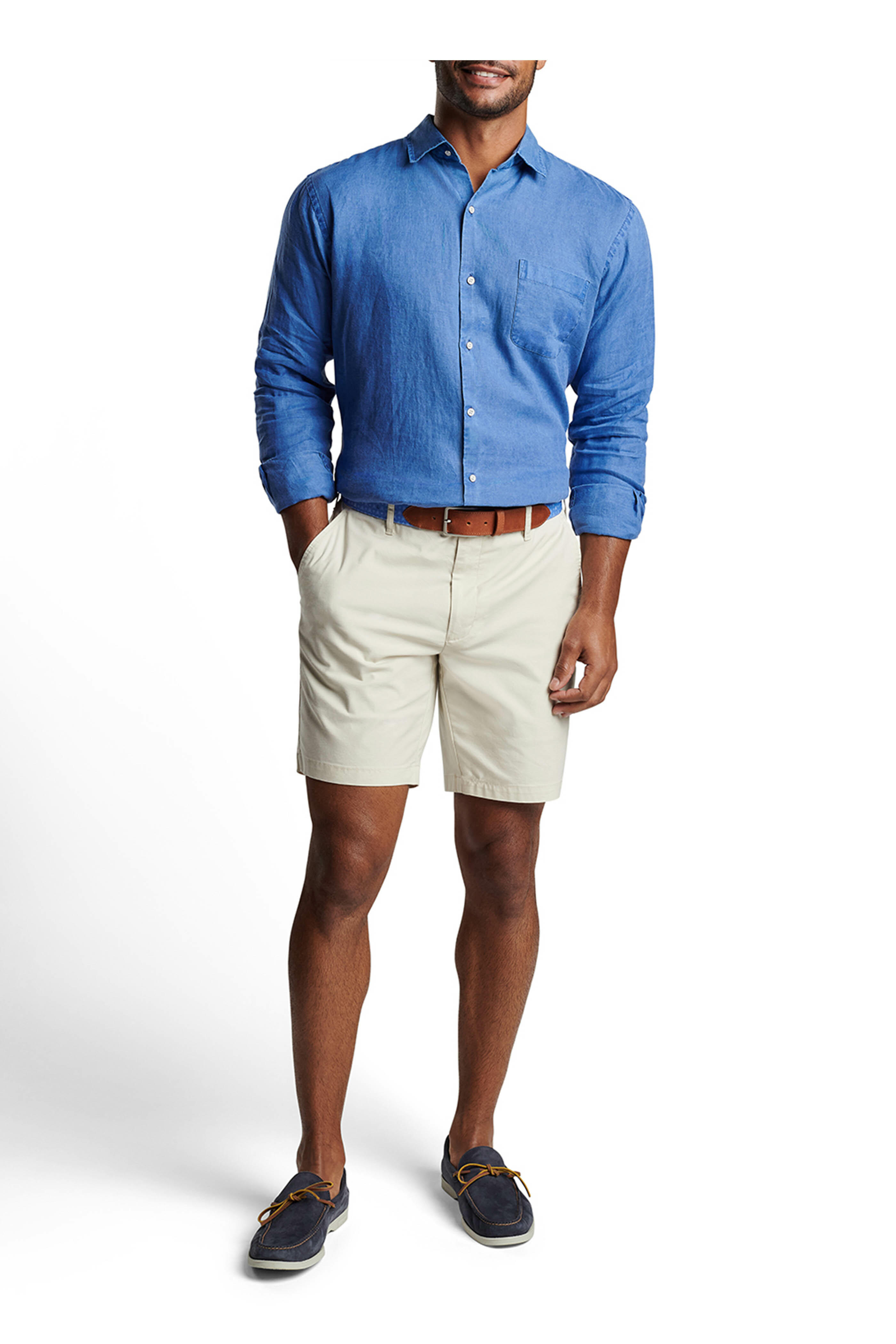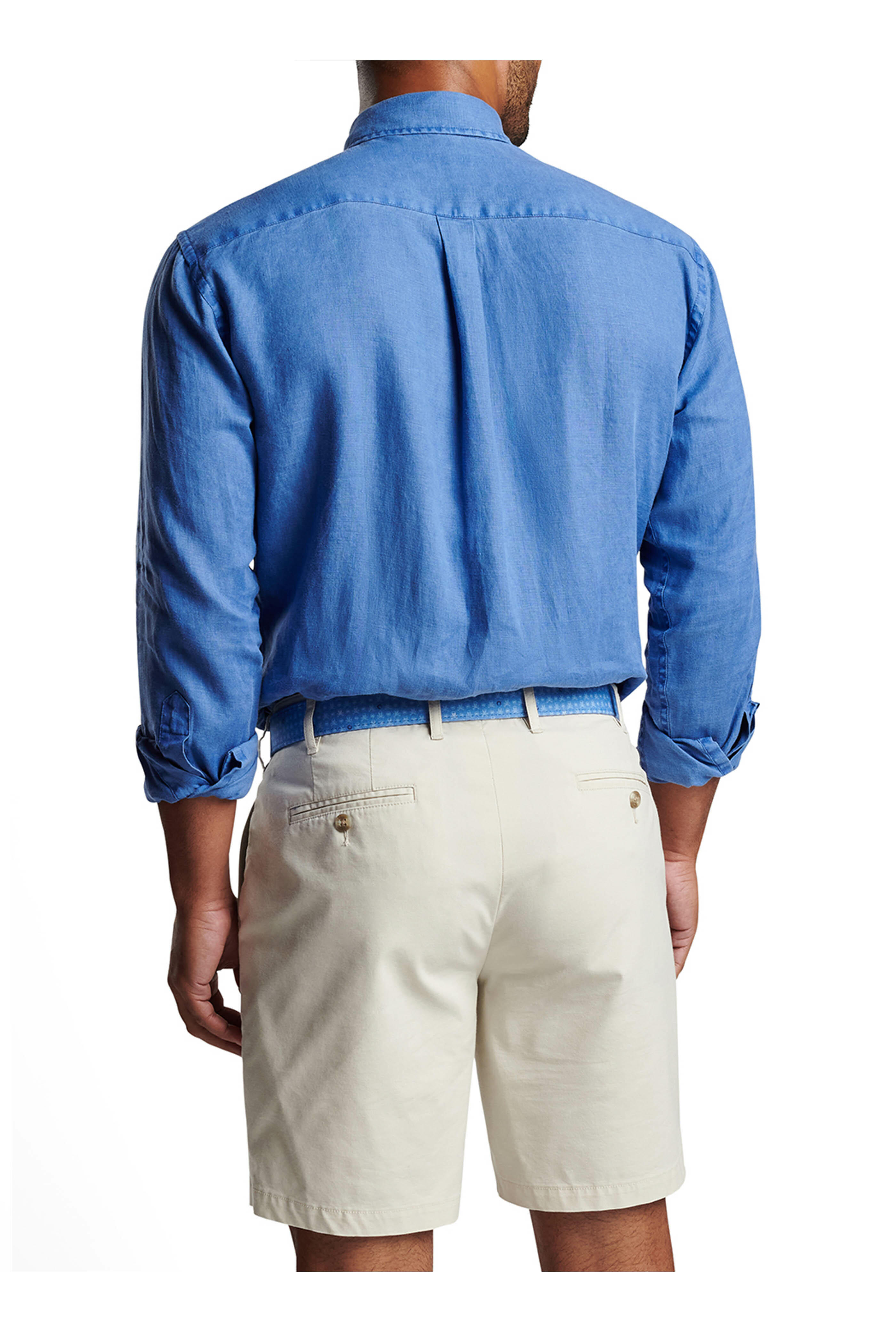 Spread collar. French placket. Double button barrel cuffs. Chest patch pocket. Imported. Classic fit. 100% linen. Hand wash.