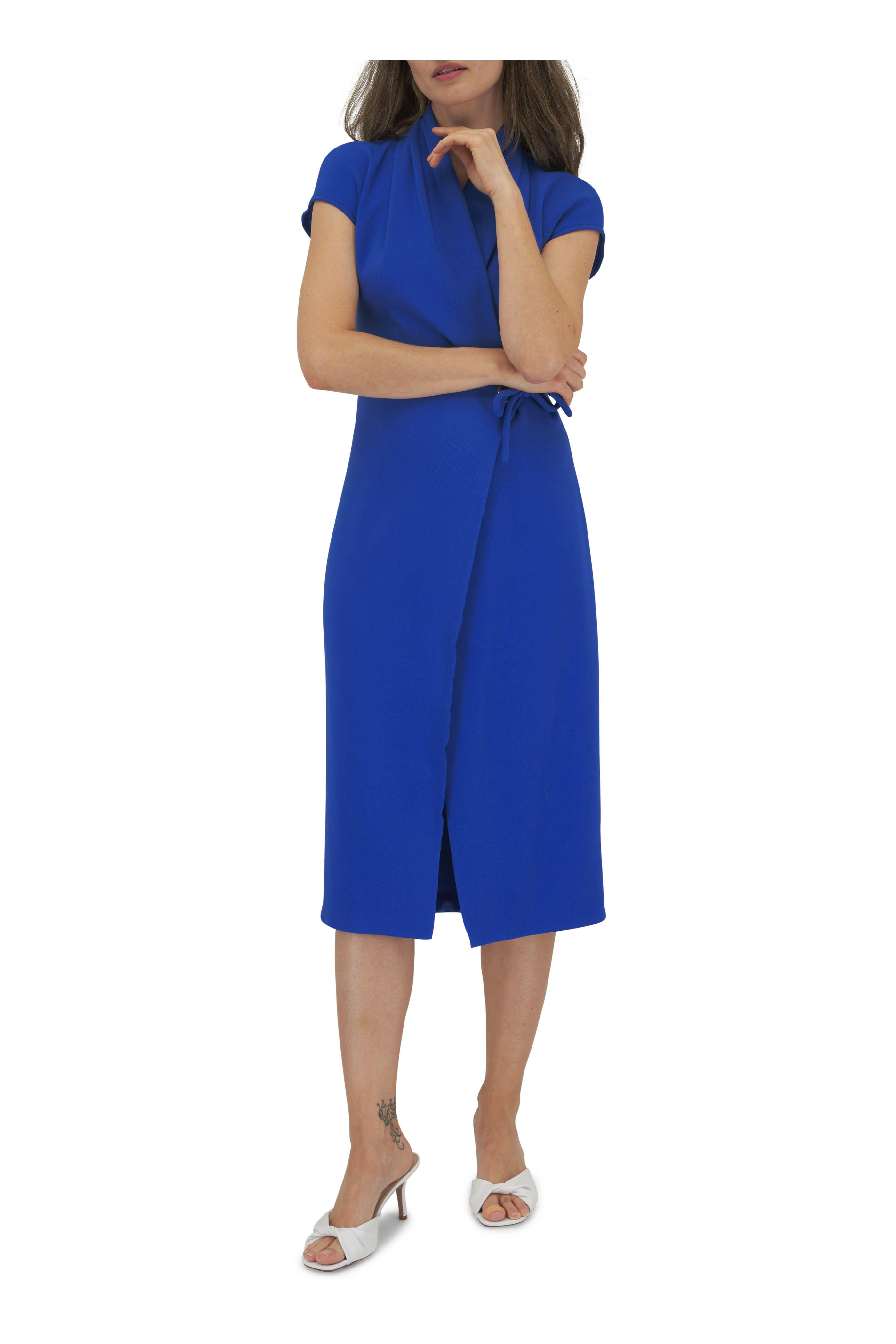 V-neckline. Gathered waist, self tie; silver tone detail. A-line silhouette; front slit. Straight hem. Made in Italy. 45" shoulder to hem. 96% viscose, 4% elastane. Dry clean.