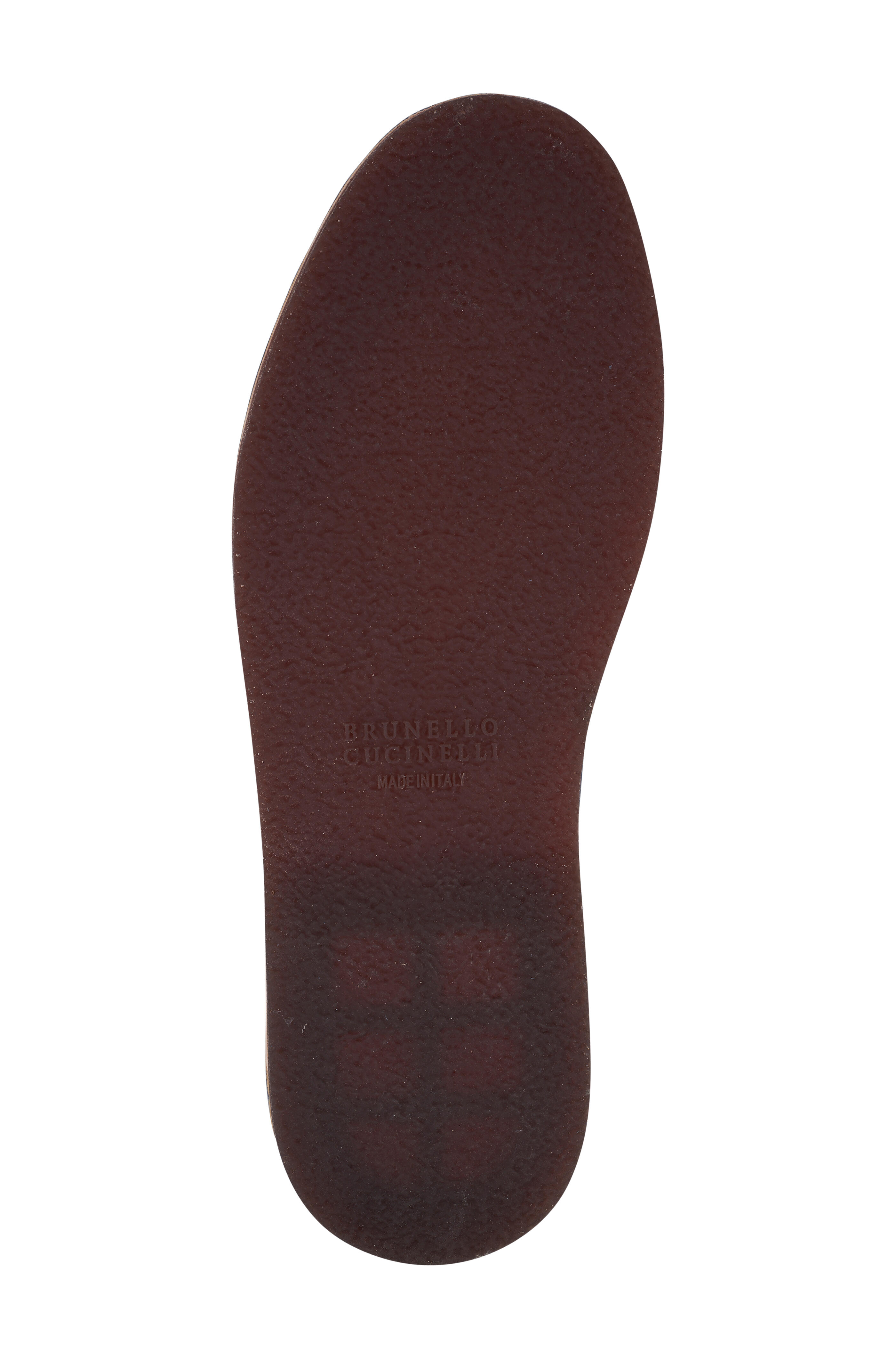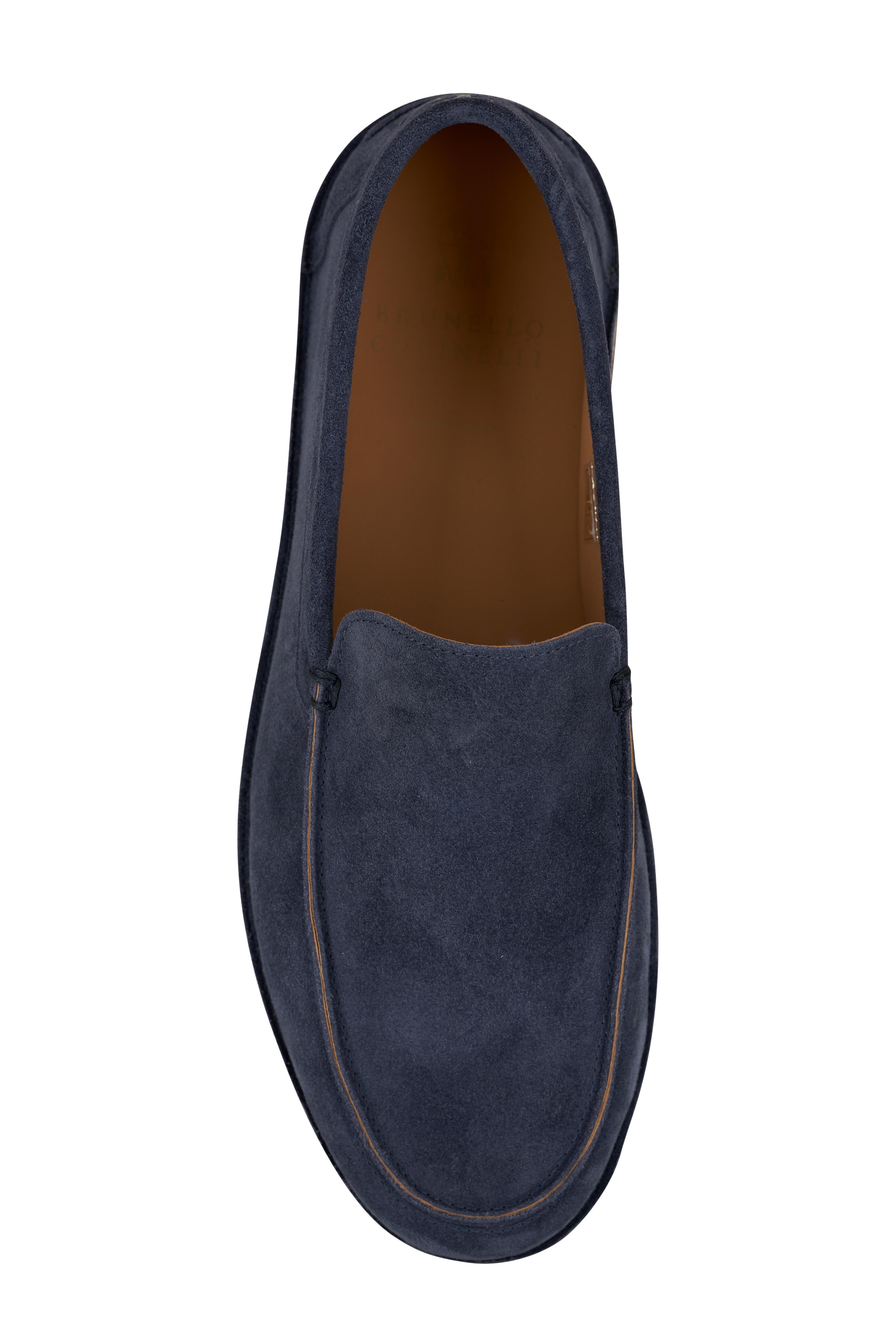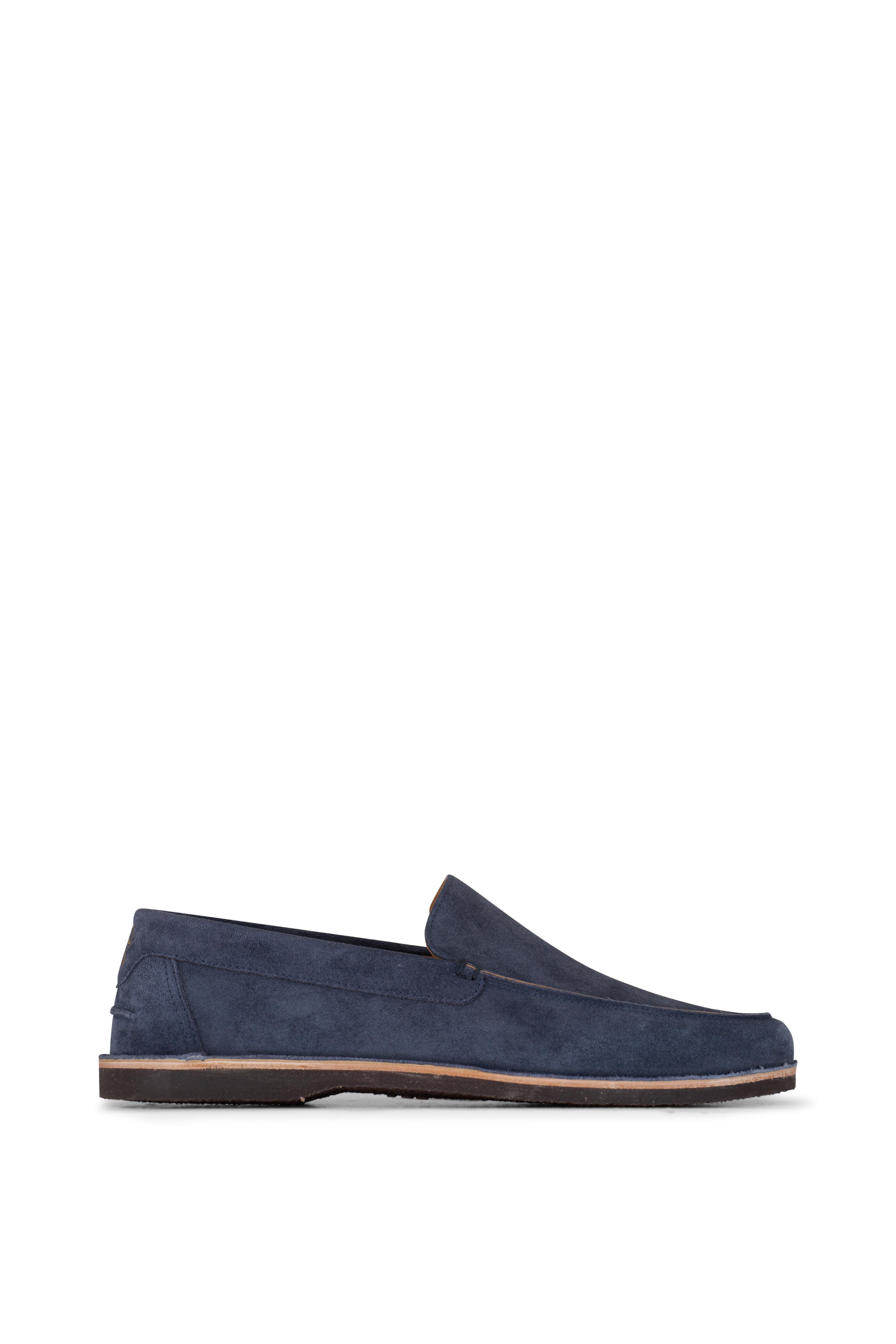 Suede upper. Moc toe. Slip on style. Leather lining and insole. Rubber pebbled sole. Made in Italy.