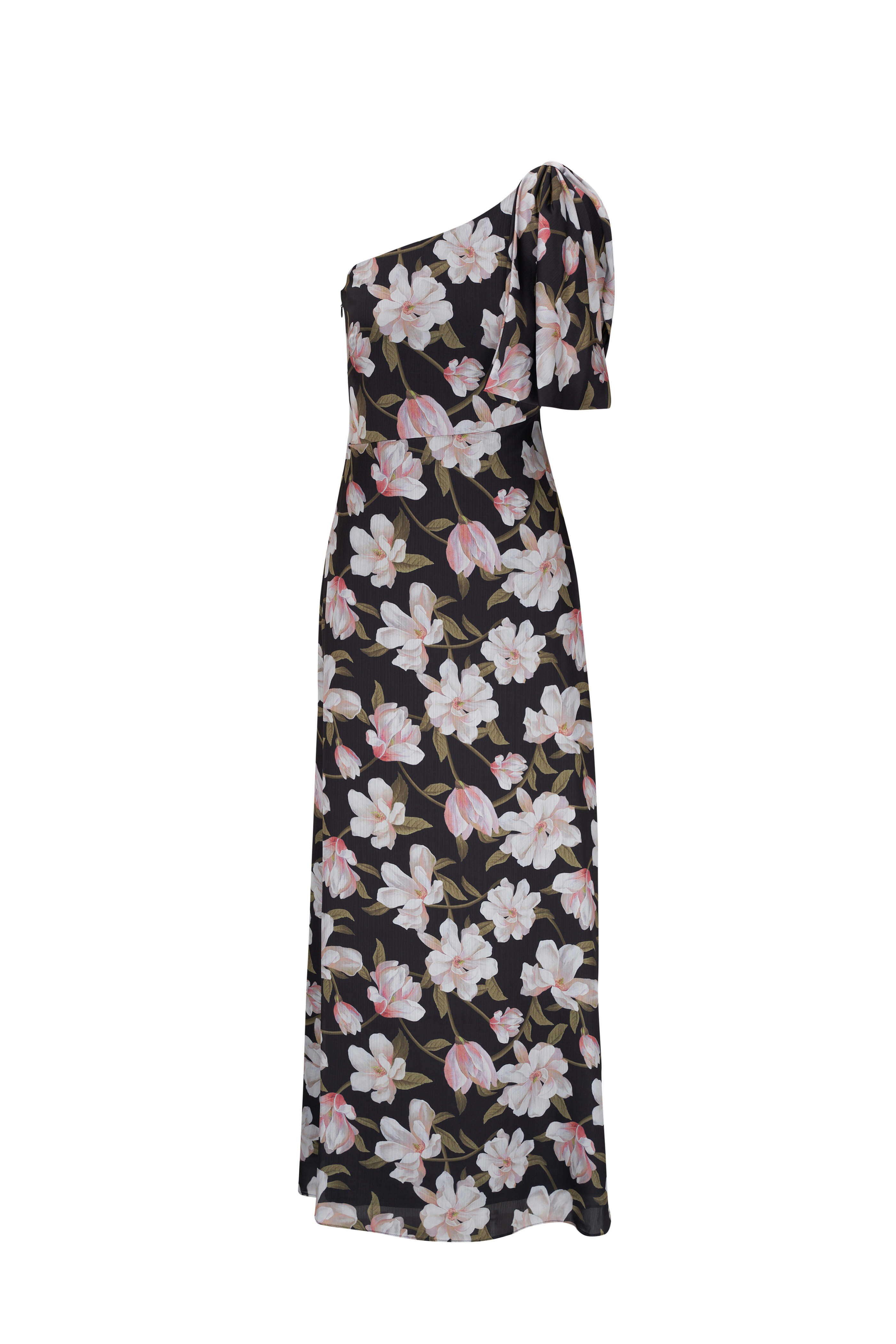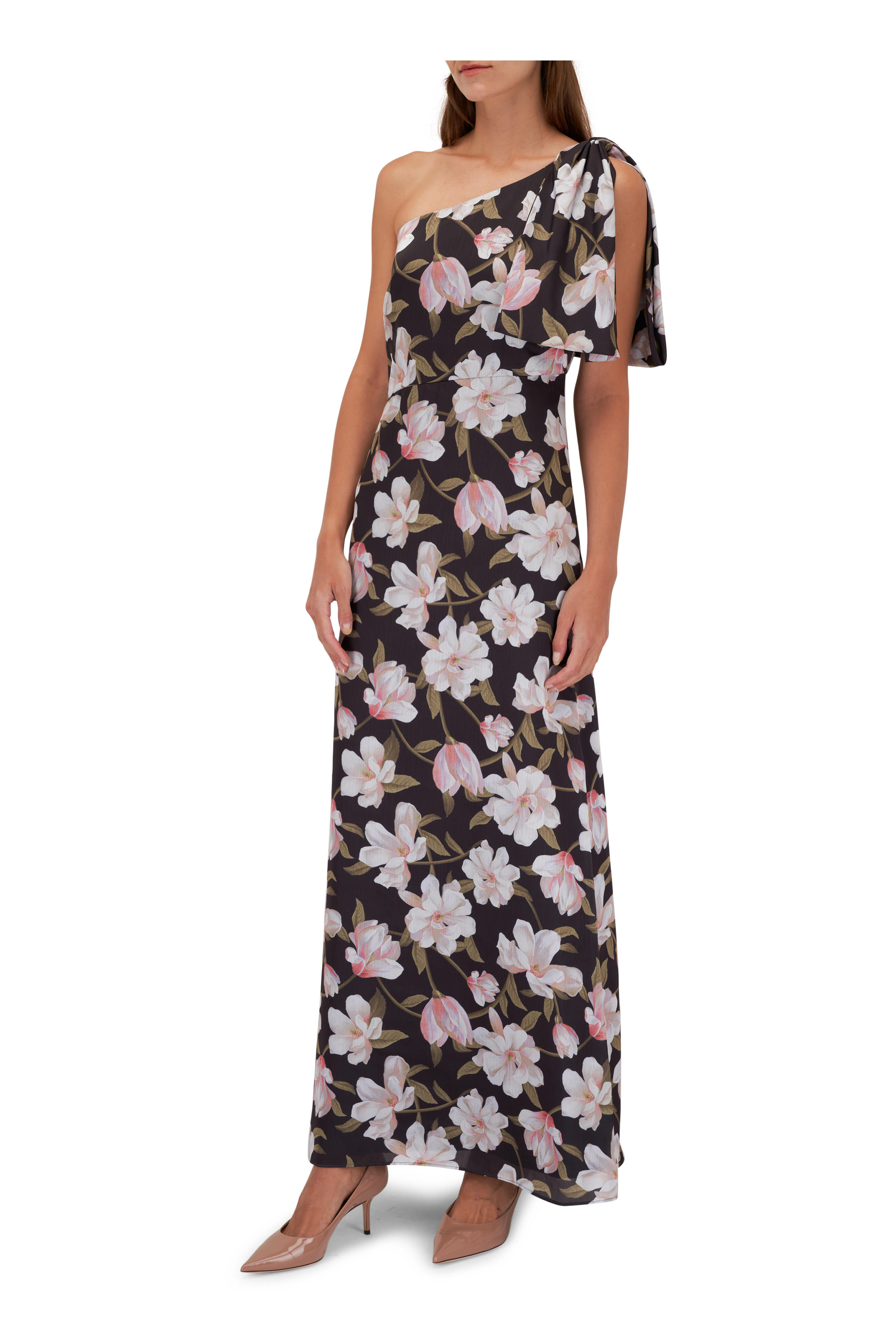 One shoulder neckline; oversized bow detail. Concealed side zip. Straight hem. Imported. Shoulder to hem 59". 100% polyester; fully lined. Dry clean.