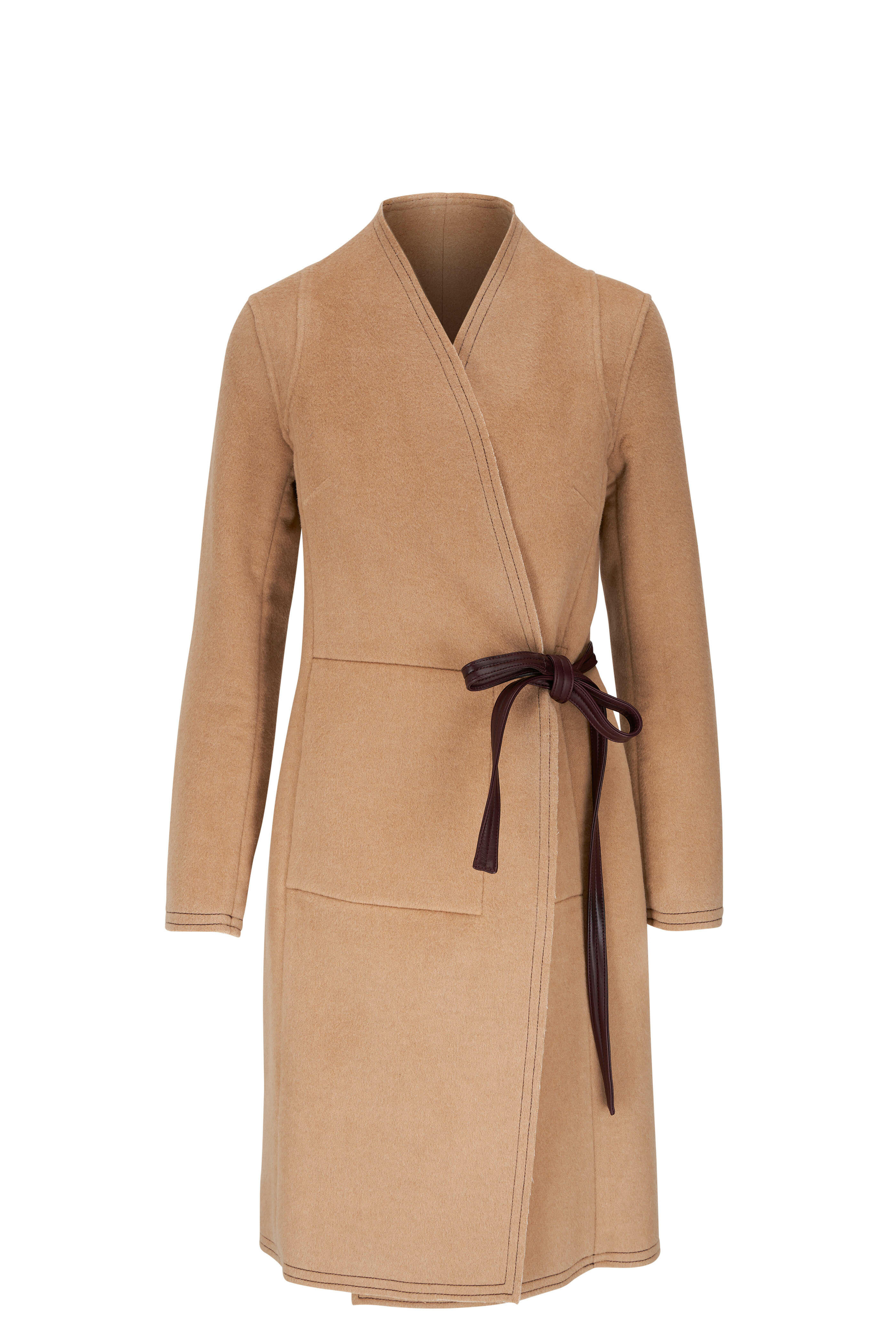 Collarless. Open front. Self-tie leather belt detail. Lower slip pockets; interior patch pockets. Made in the USA. Color: Sand & Gypsum. Reversible for wearing as Sand or Gypsum color. 40" shoulder to hem. 92% virgin wool, 8% cashmere; trim: 100% lambskin leather. Dry clean.