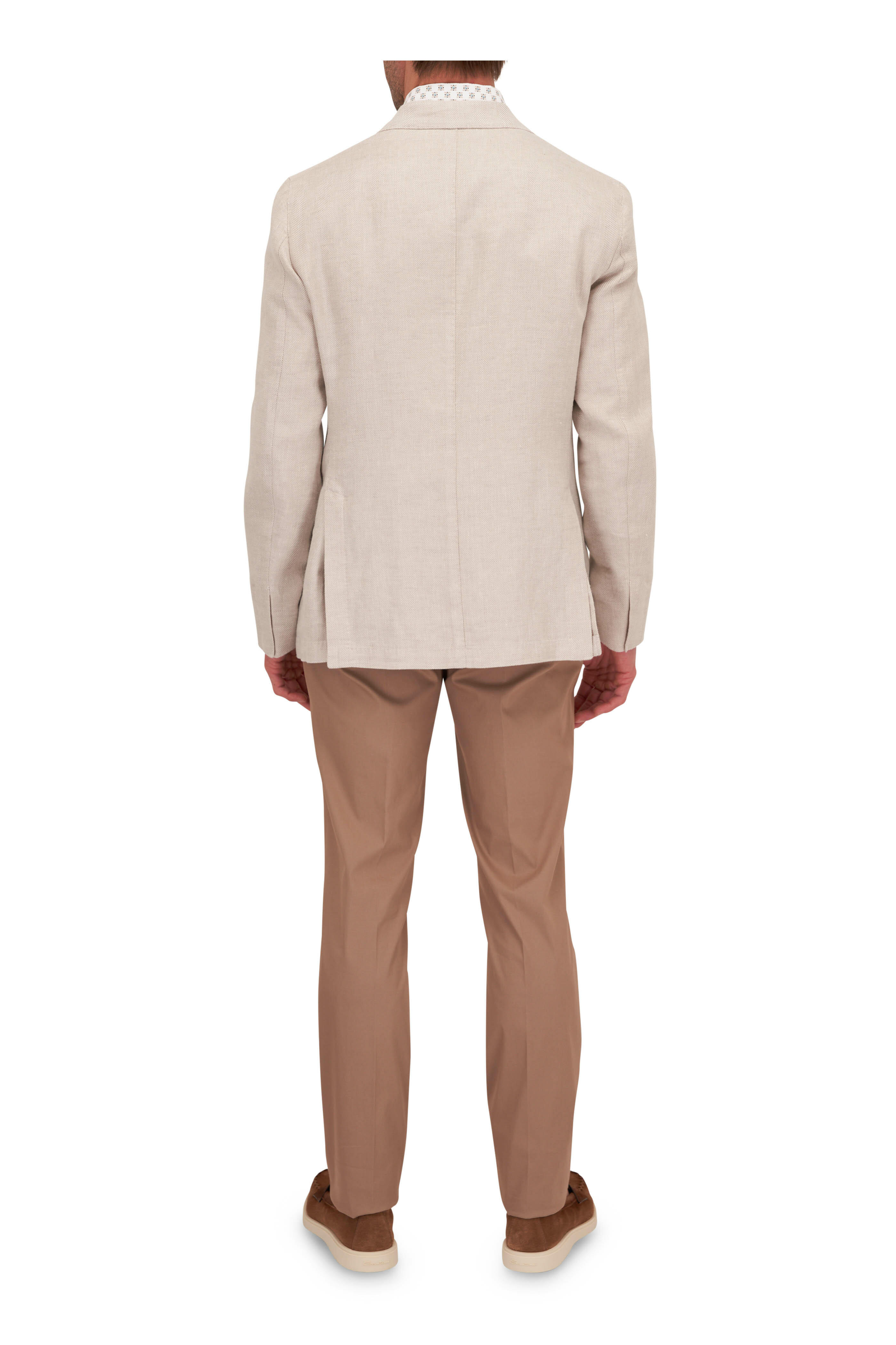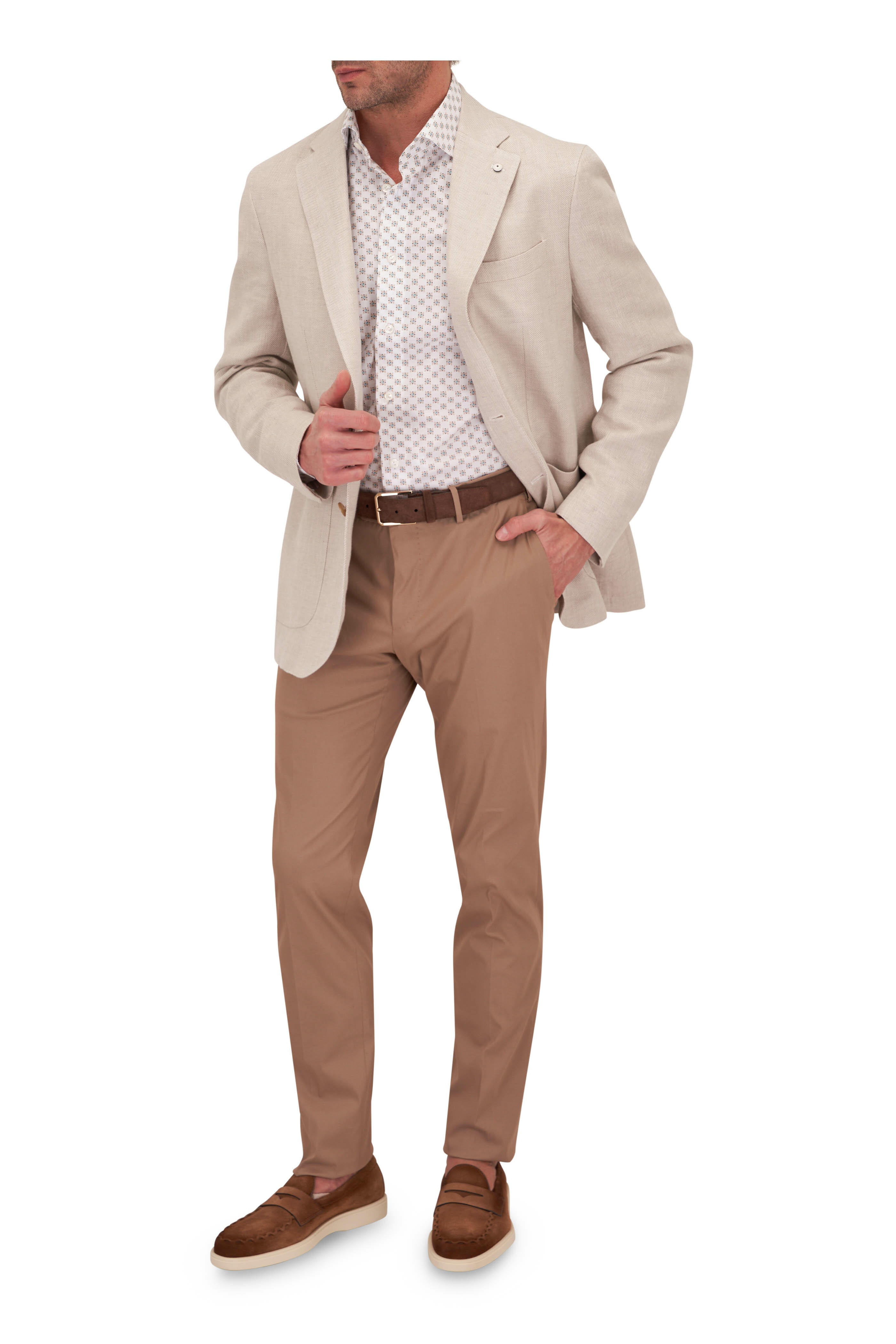 Spread collar. French placket. Single button mitered cuffs. Imported. Contemporary fit. 75% cotton, 25% linen. Machine wash.