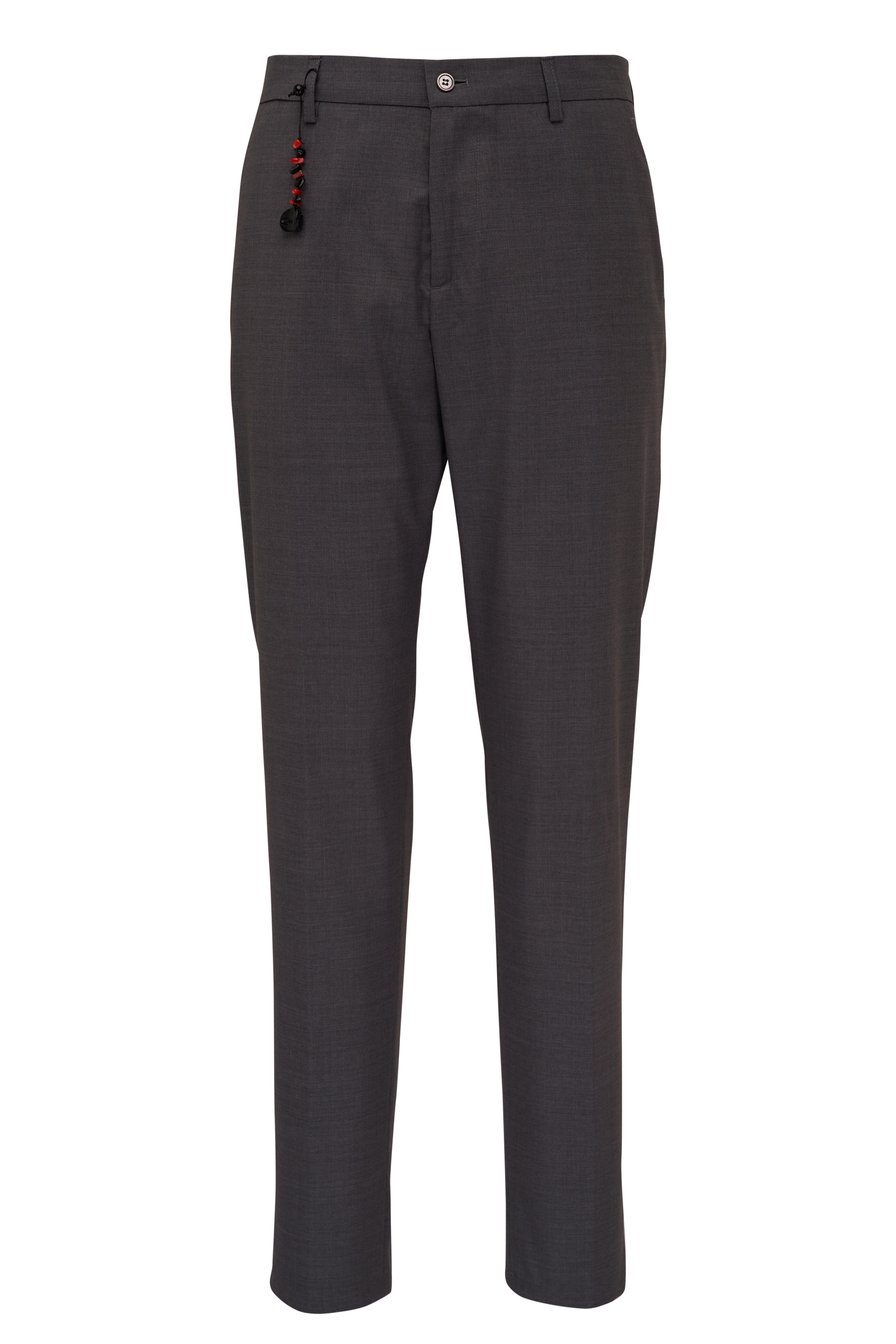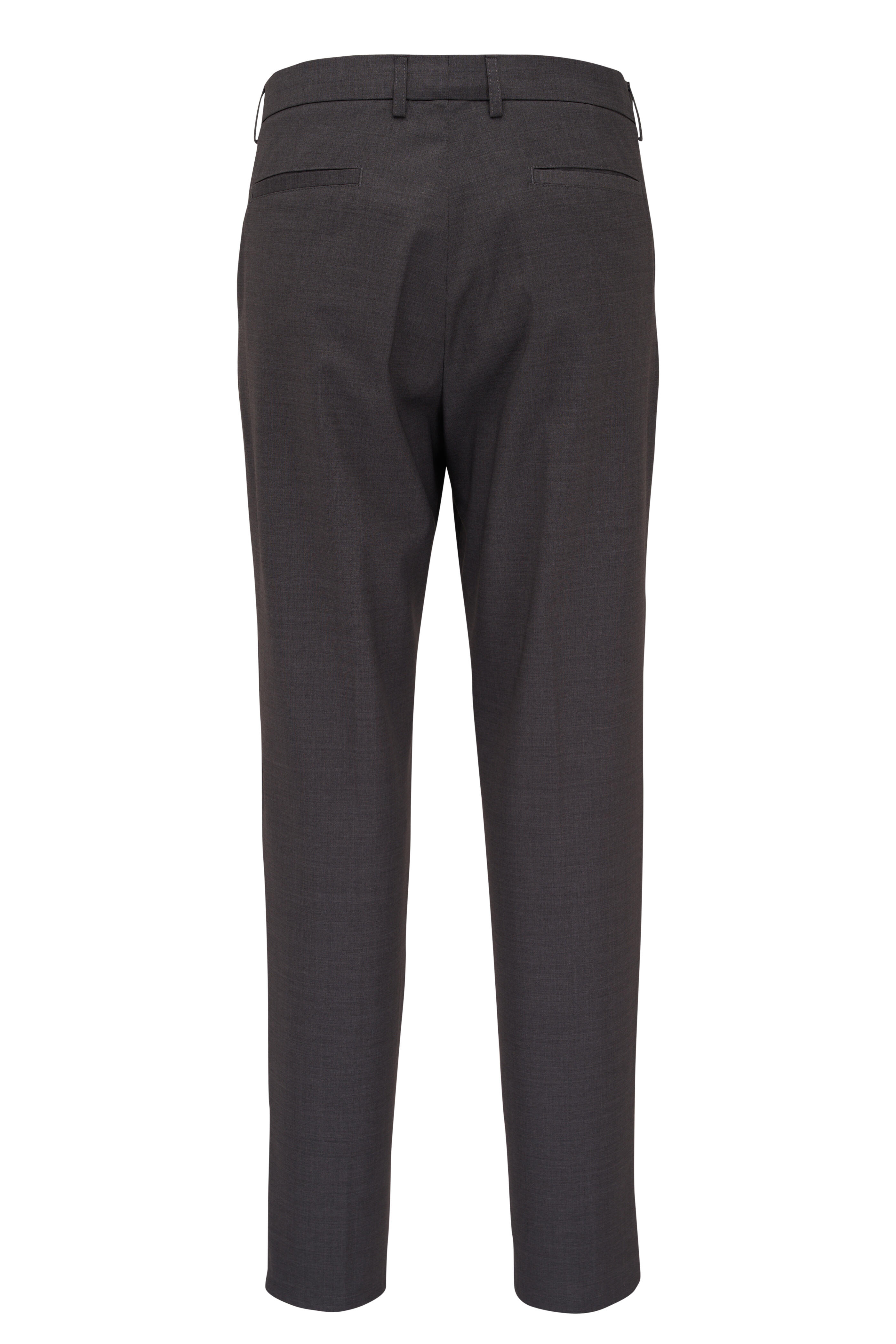 Zip fly with button tab. Belt loops; banded waist. Side slip pockets; left zip pocket; back besom pockets. Made in Italy. Inseam: 34". 100% wool; lining: 100% cotton. Dry clean.