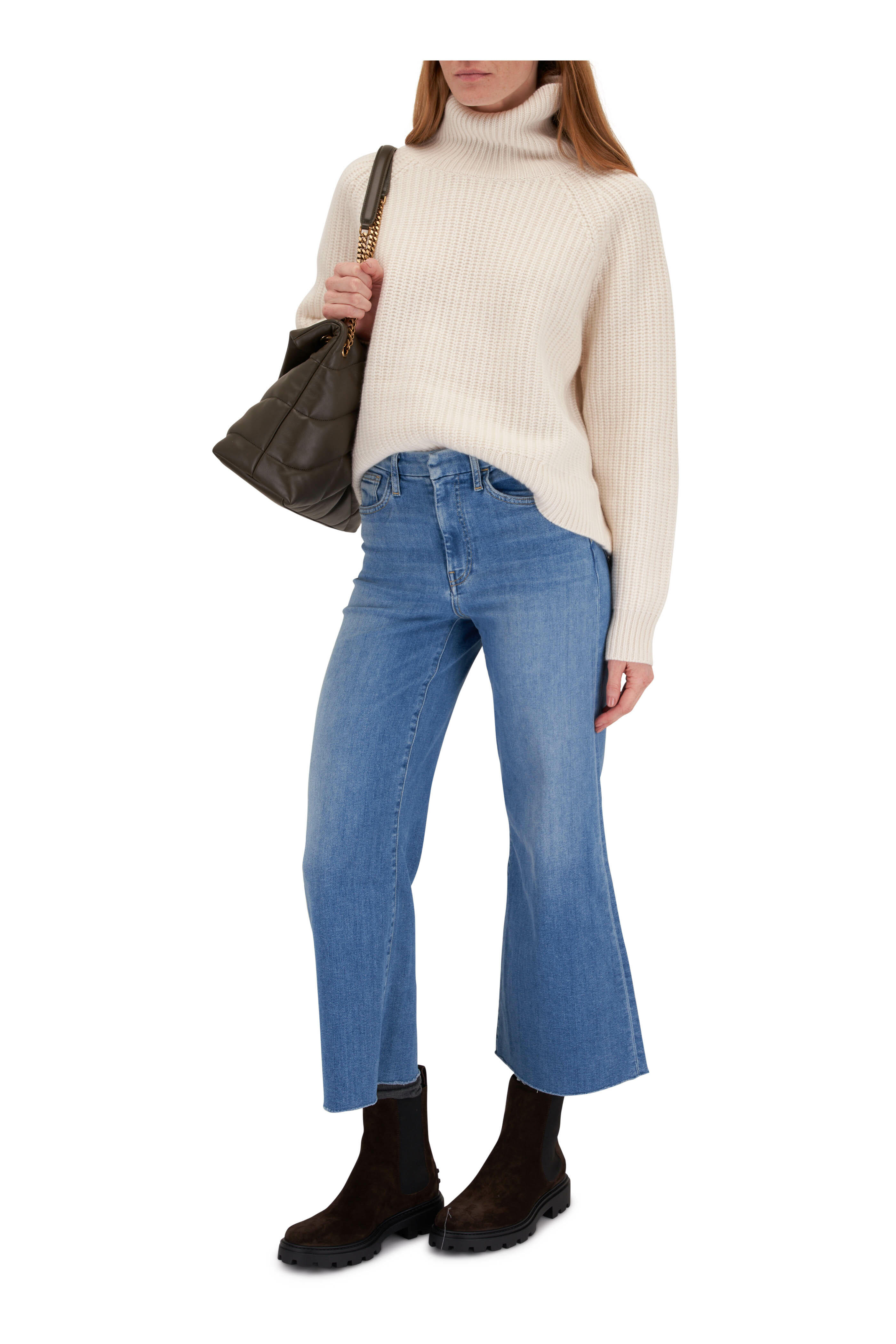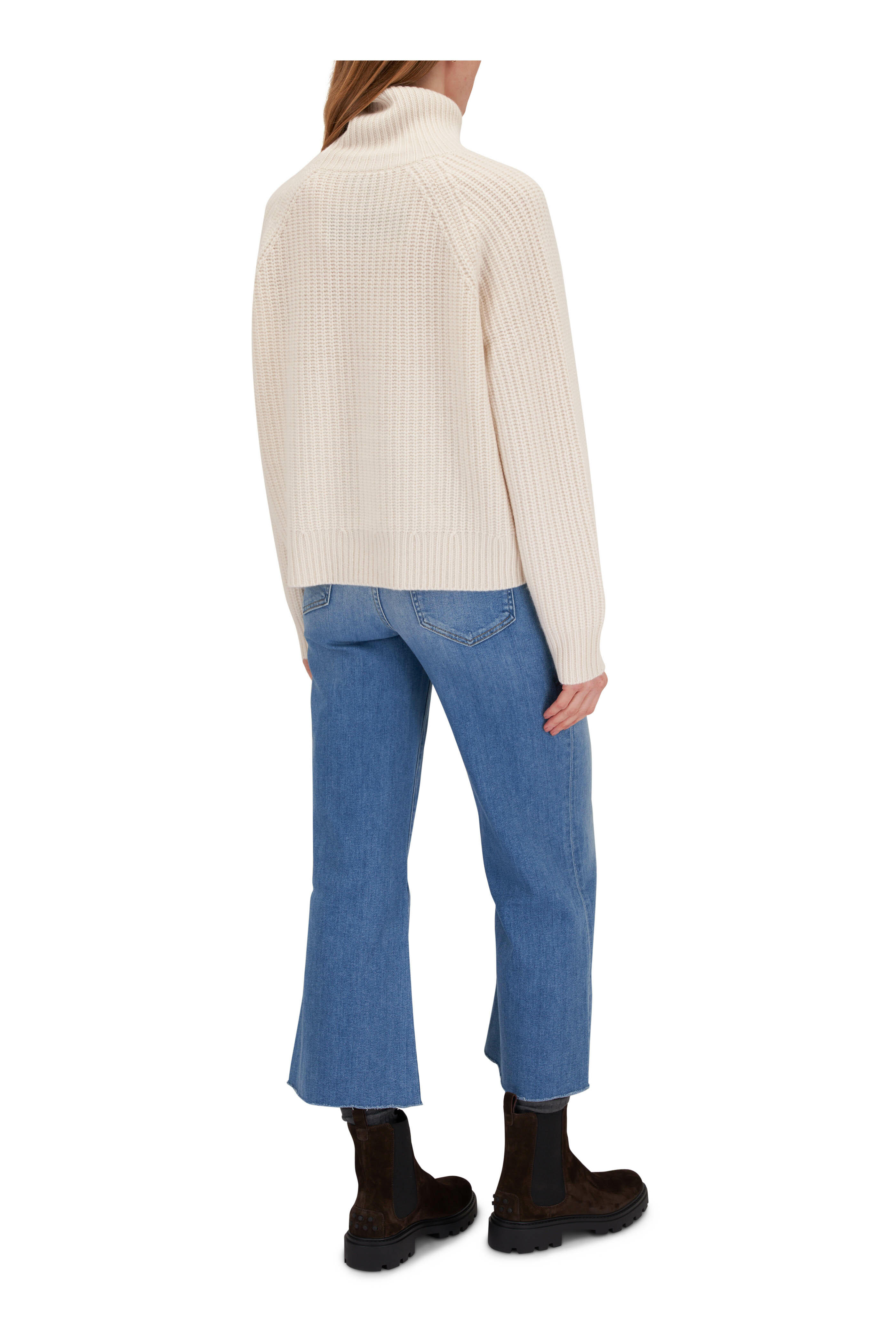 Turtleneck; foldover cuff. Ribbed trims. Made in Canada. Hip length. 100% cashmere. Dry clean.