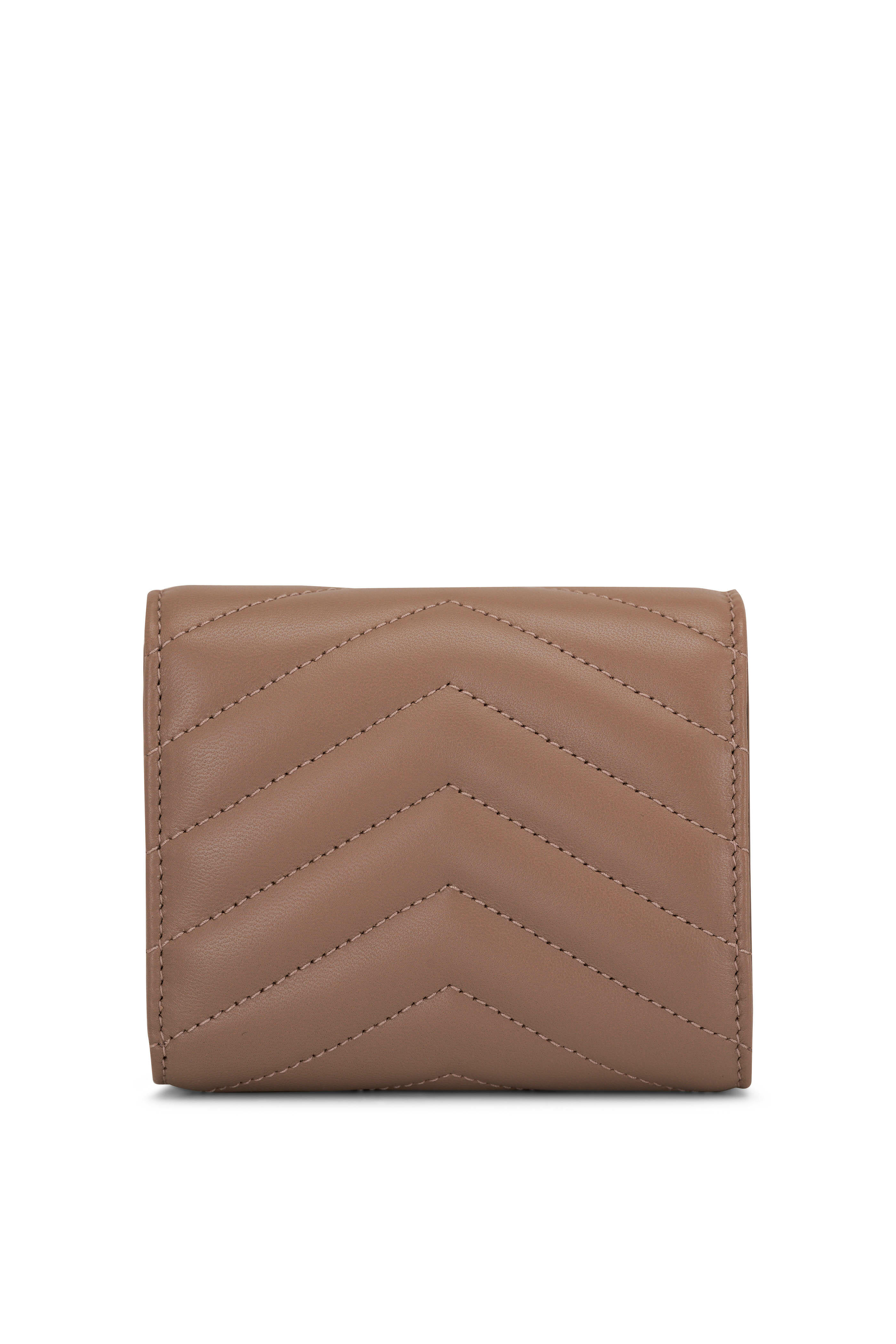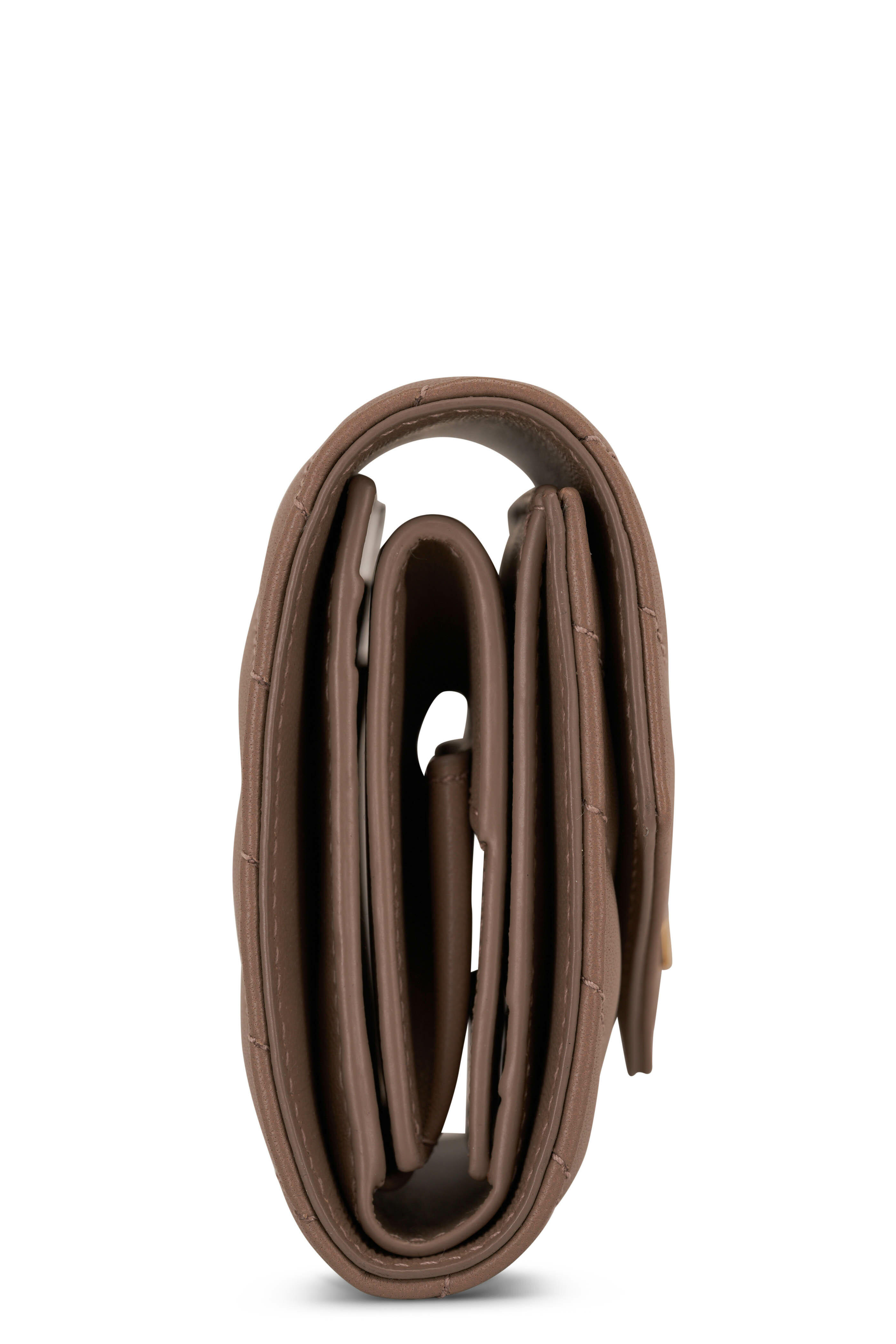 Quilted Leather. Flap top closure with logo detail. Six card holders. Interior, collapsible coin purse. Single bill compartment. Made in Italy. 4.1" X 3.5" X 1.2".